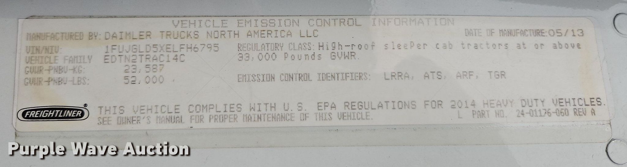Purple Wave is selling a used Truck Tractor in Kansas. This item is a 2014 Freightliner Cascadia semi truck with the following: Miles: 1,096,247 on odometer, VIN: 1FUJGLD5XELFH6795