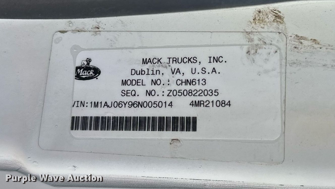 Purple Wave is selling a used Truck Tractor in Oklahoma. This item is a 2006 Mack CHN613 semi truck with the following: Miles: 635,692 on odometer, Hours: 23,795 on meter, VIN: 1M1AJ06Y96N005014