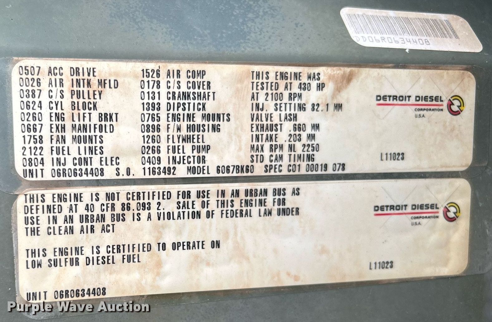 2001 Freightliner FLD semi truck. Miles: 650,692 on odometer, VIN: 1FUJAHCG31LJ96176. Engine Detroit Diesel Series 60, Displacement: 12.7L, Cylinders: 6, Fuel type: Diesel, Engine brake. Transmission Eaton Fuller, Manual, Speed: 10. Chassis Axles: Tandem, Differential lock: Inter-axle, Suspension: Air, Brakes: Air, GVWR: 52,000 lbs FAWR: 12,000 lbs, IAWR: 20,000 lbs, RAWR: 20,000 lbs. Interior AC, Heat, Heated mirrors, Cruise control. Features Fifth wheel type: Air operated, Sliding, Fuel tank: Dual, Masport H75W pump 3" inlet/ outlet. Tires Size: 11R22.5. Notes Dash warning indicator: Trailer ABS. Oklahoma title. Title distribution may be delayed up to 14 days from verification of funds. 15107 North 137th East Avenue. Collinsville, OK 74021