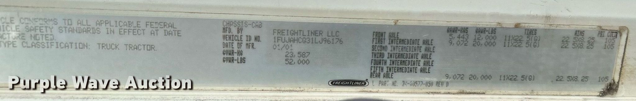 Purple Wave is selling a used Truck Tractor in Oklahoma. This item is a 2001 Freightliner FLD semi truck with the following: Miles: 650,692 on odometer, VIN: 1FUJAHCG31LJ96176