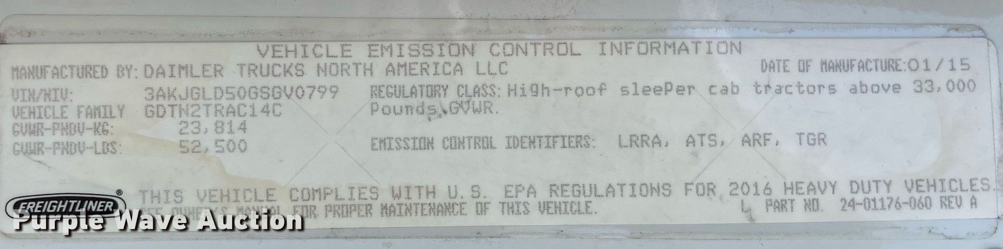Purple Wave is selling a used Truck Tractor in Kansas. This item is a 2016 Freightliner Cascadia semi truck with the following: Miles: 777,447 on odometer, Hours: 17,268 on meter, VIN: 3AKJGLD50GSGV0799, Unit #: 202