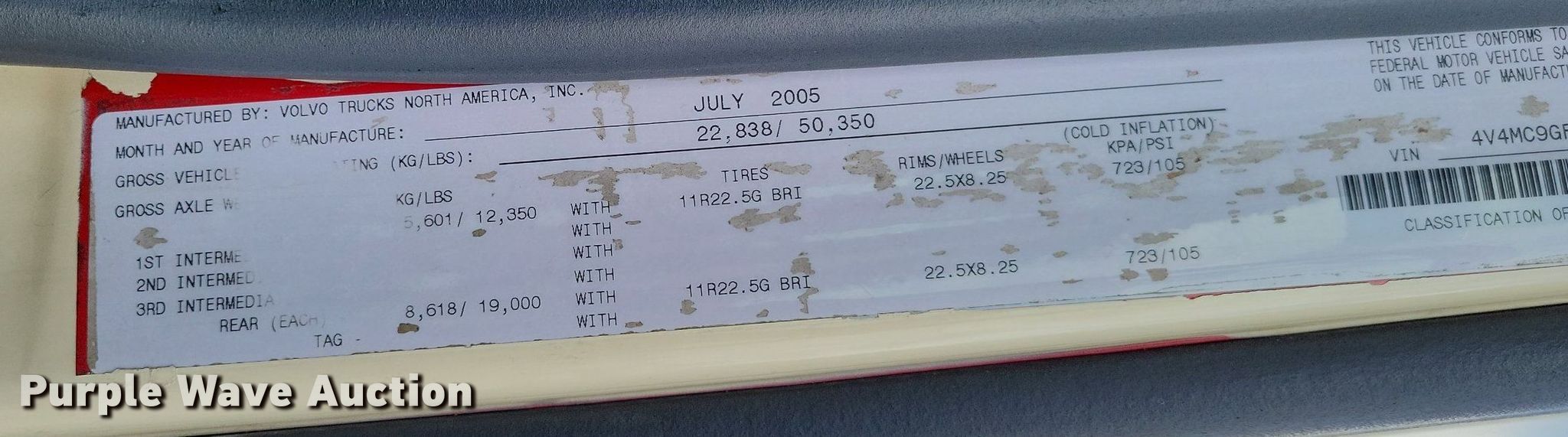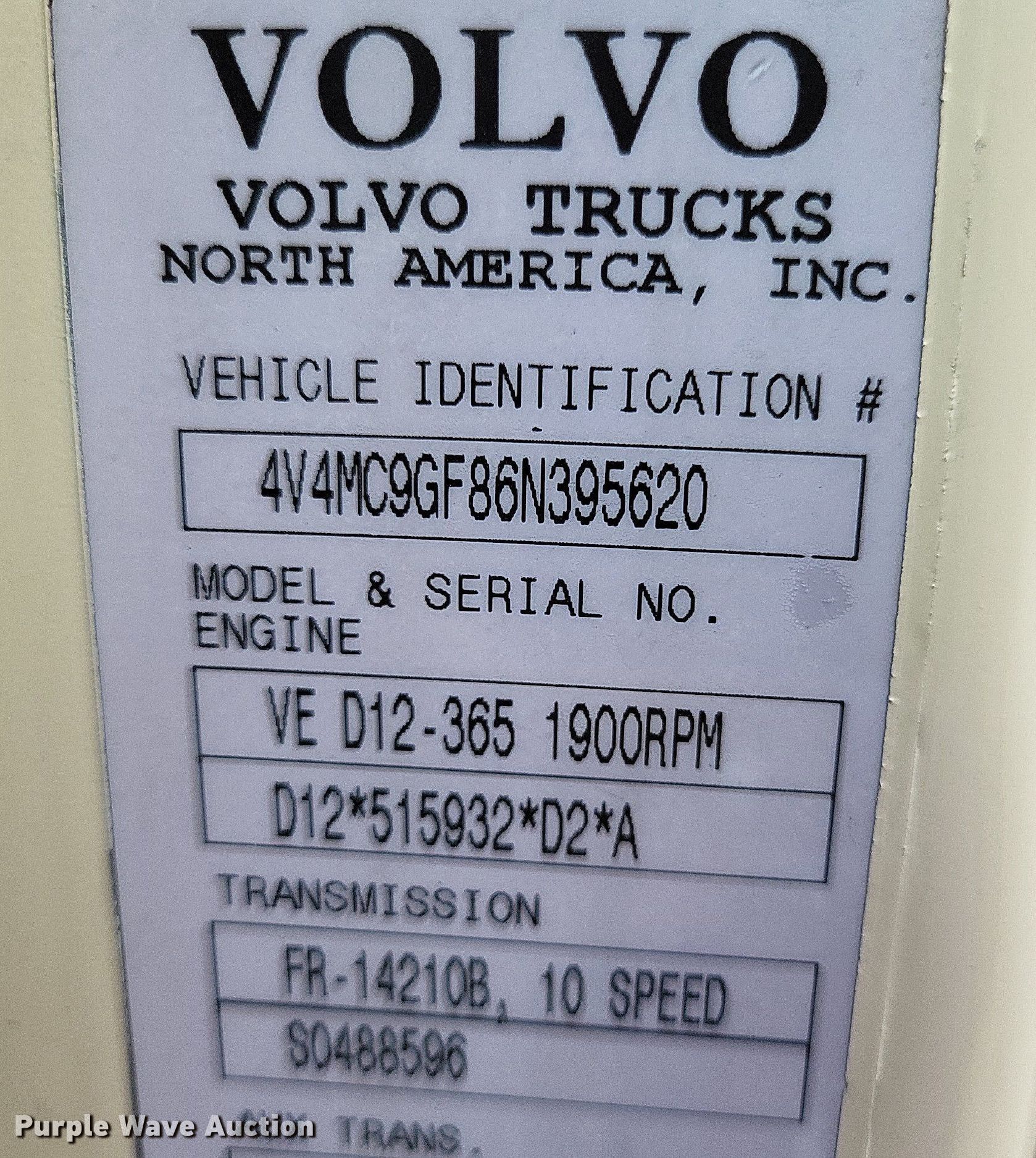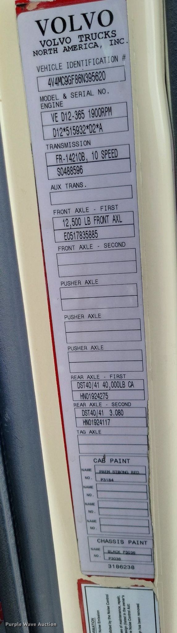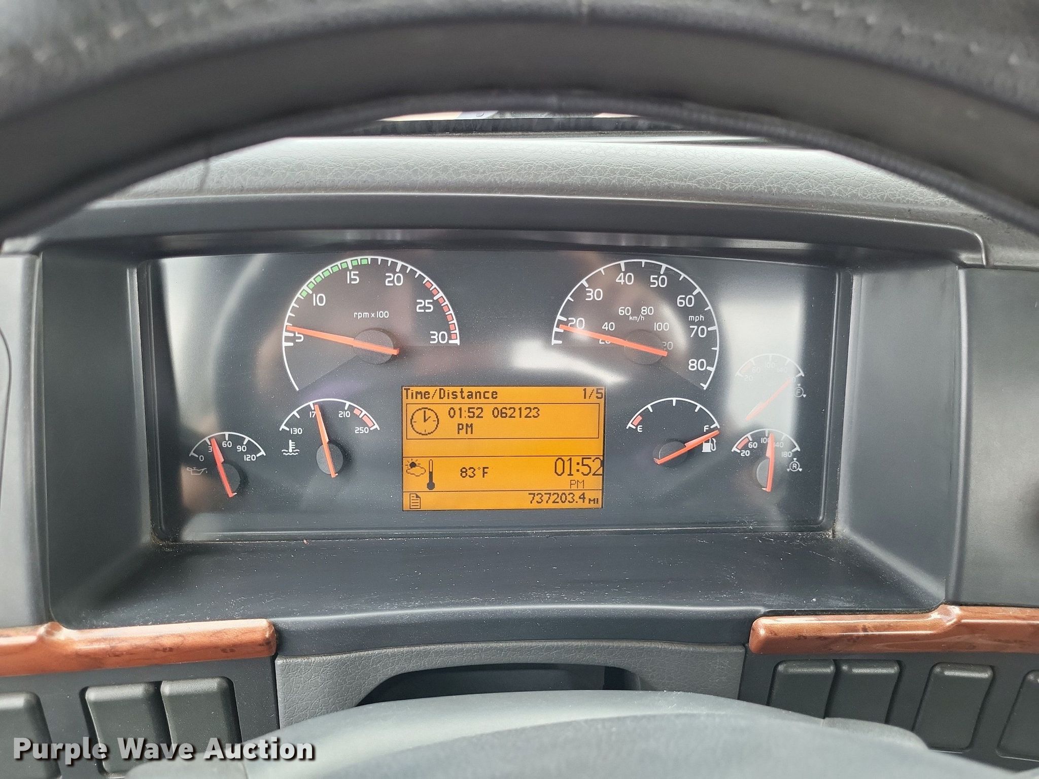 2014 Volvo VNM semi truck. Miles: 737,203 on odometer, VIN: 4V4MC9GF86N395620. Engine Volvo D12-365, Displacement: 12.1L, Cylinders: 6, Fuel type: Diesel, Engine brake. Transmission Eaton Fuller, Manual, Speed: 10. Chassis Axles: Tandem, Differential lock: Inter-axle, Suspension: Air Dump valves, Brakes: Air, GVWR: 52,500 lbs FAWR: 12,500 lbs, IAWR: 20,000 lbs, RAWR: 20,000 lbs. Interior AC, Heat, Heated mirrors, Power windows, Cruise control. Features Deck plate: Aluminum, Fifth wheel type: Fixed, Fuel tank: Dual. Tires Front: 275/80R22.5, Rear: 295/75R22.5. Notes Dash warning indicator: Check engine. Missouri title. Title distribution may be delayed up to 14 days from verification of funds. Ray Farms. 729 MO-105. Charleston, MO 63834
