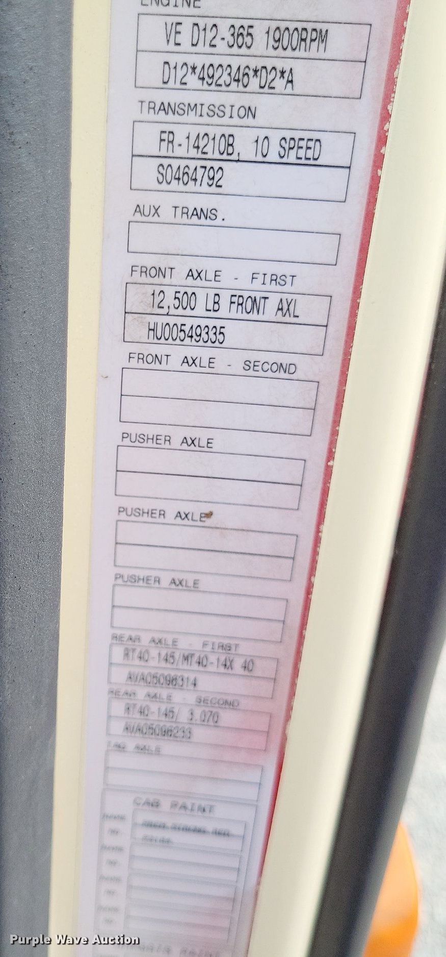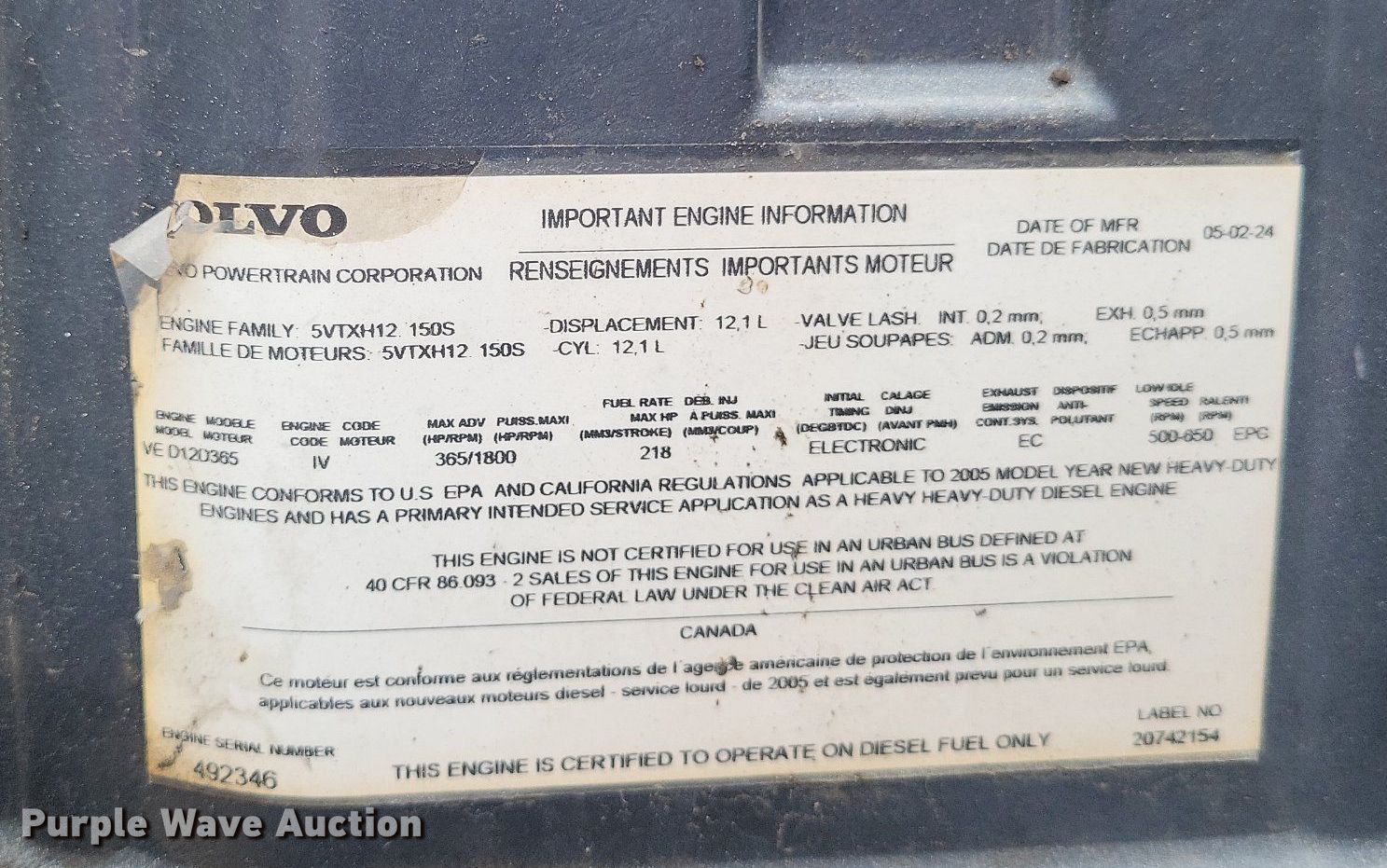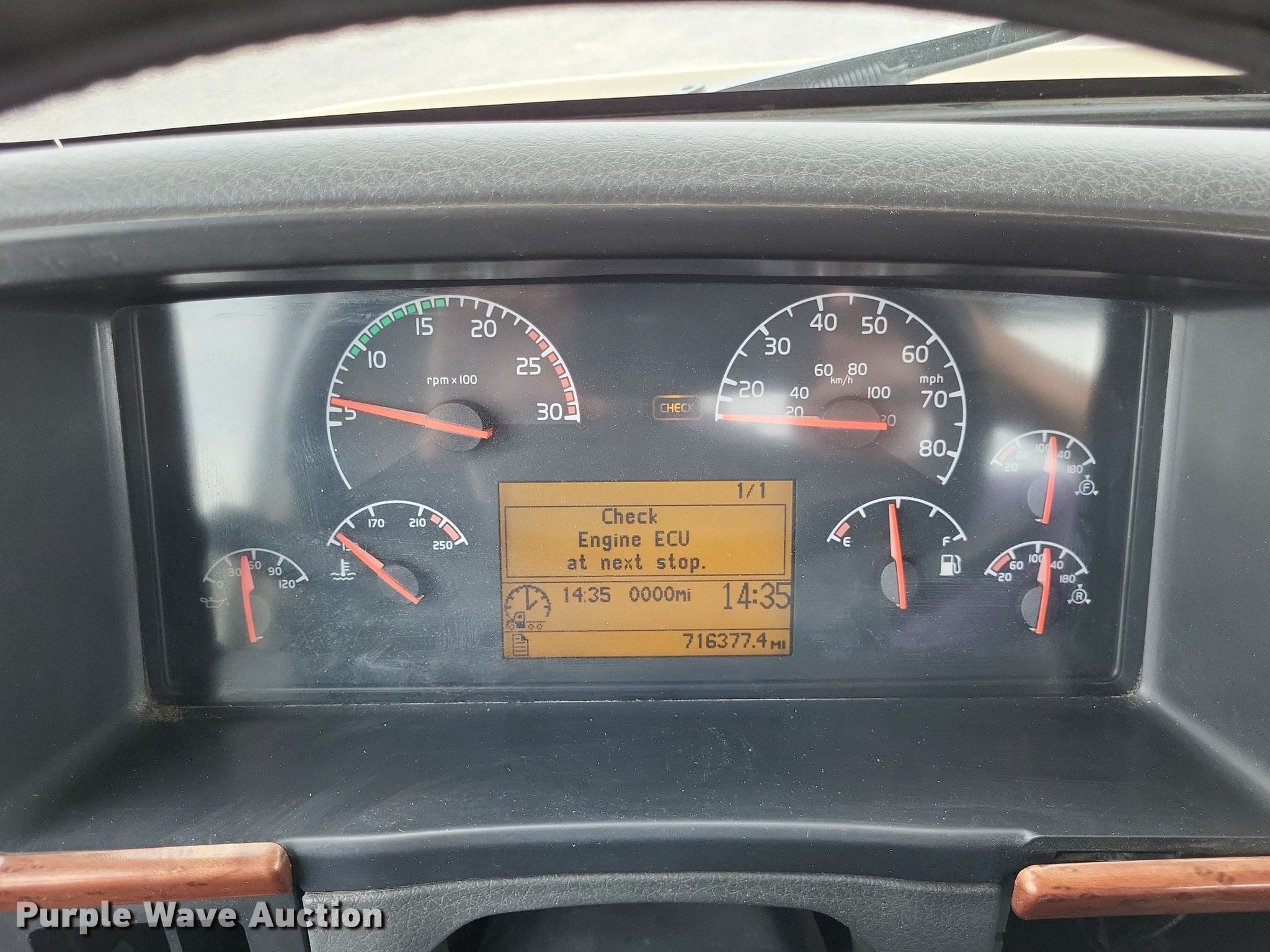2006 Volvo VNM semi truck. Miles: 716,378 on odometer, VIN: 4V4MC9GF36N395587. Engine Volvo D12-365, Displacement: 12.1L, Cylinders: 6, Fuel type: Diesel, Engine brake. Transmission Eaton Fuller, Manual, Speed: 10. Chassis Axles: Tandem, Differential lock: Inter-axle, Suspension: Air Dump valves, Brakes: Air, GVWR: 50,350 lbs FAWR: 12,350 lbs, IAWR: 19,000 lbs, RAWR: 19,000 lbs. Interior AC, Heat, Power windows, Power locks, Cruise control. Features Deck plate: Aluminum, Fifth wheel type: Fixed. Tires Size: 275/80R22.5. Notes Dash warning indicator: Check engine, Windshield chipped or cracked. Missouri title. Title distribution may be delayed up to 14 days from verification of funds. Ray Farms. 729 MO-105. Charleston, MO 63834