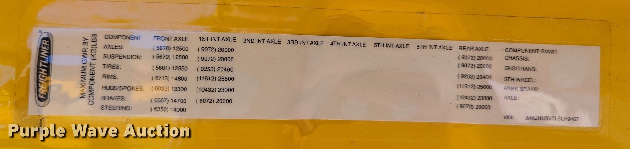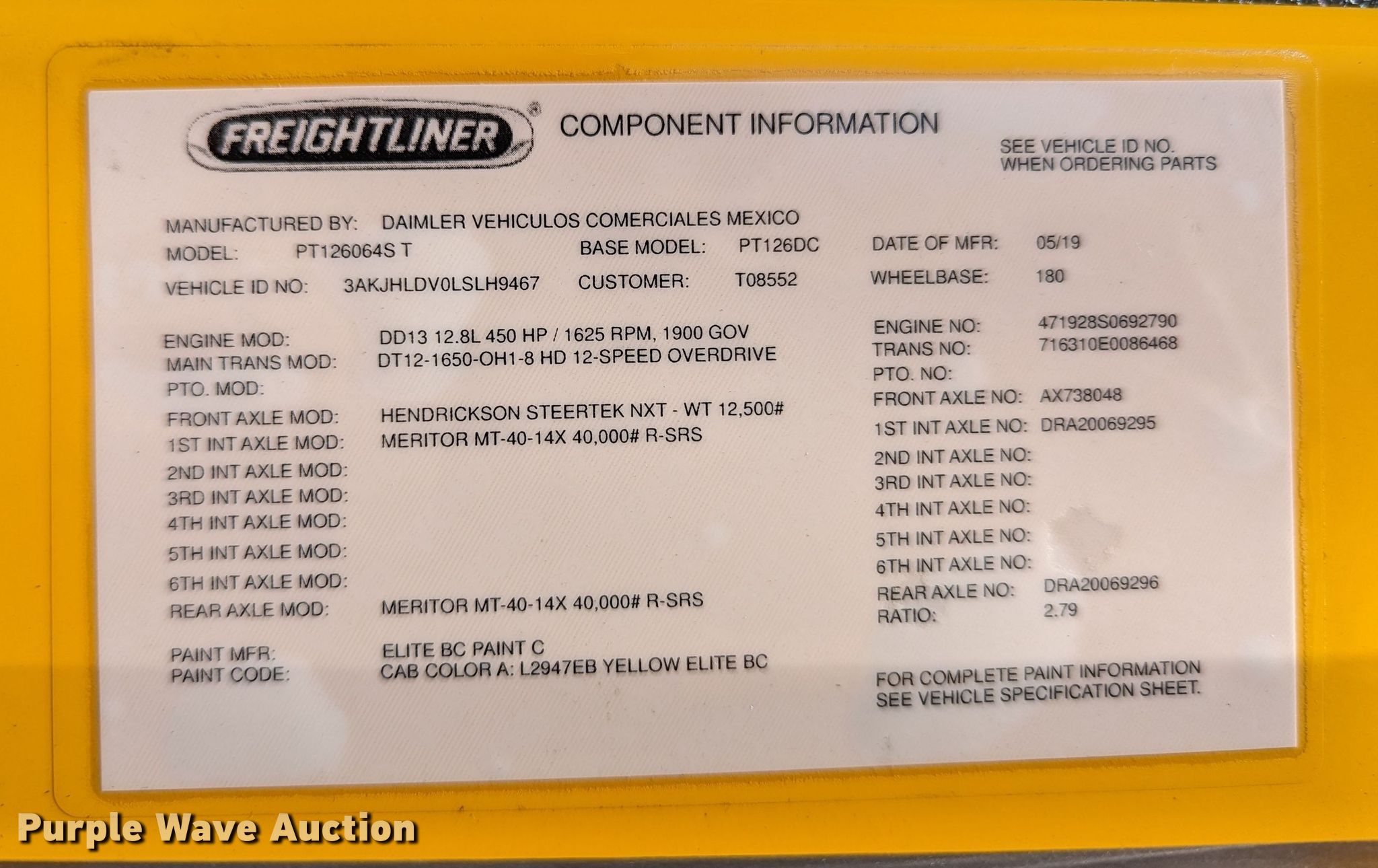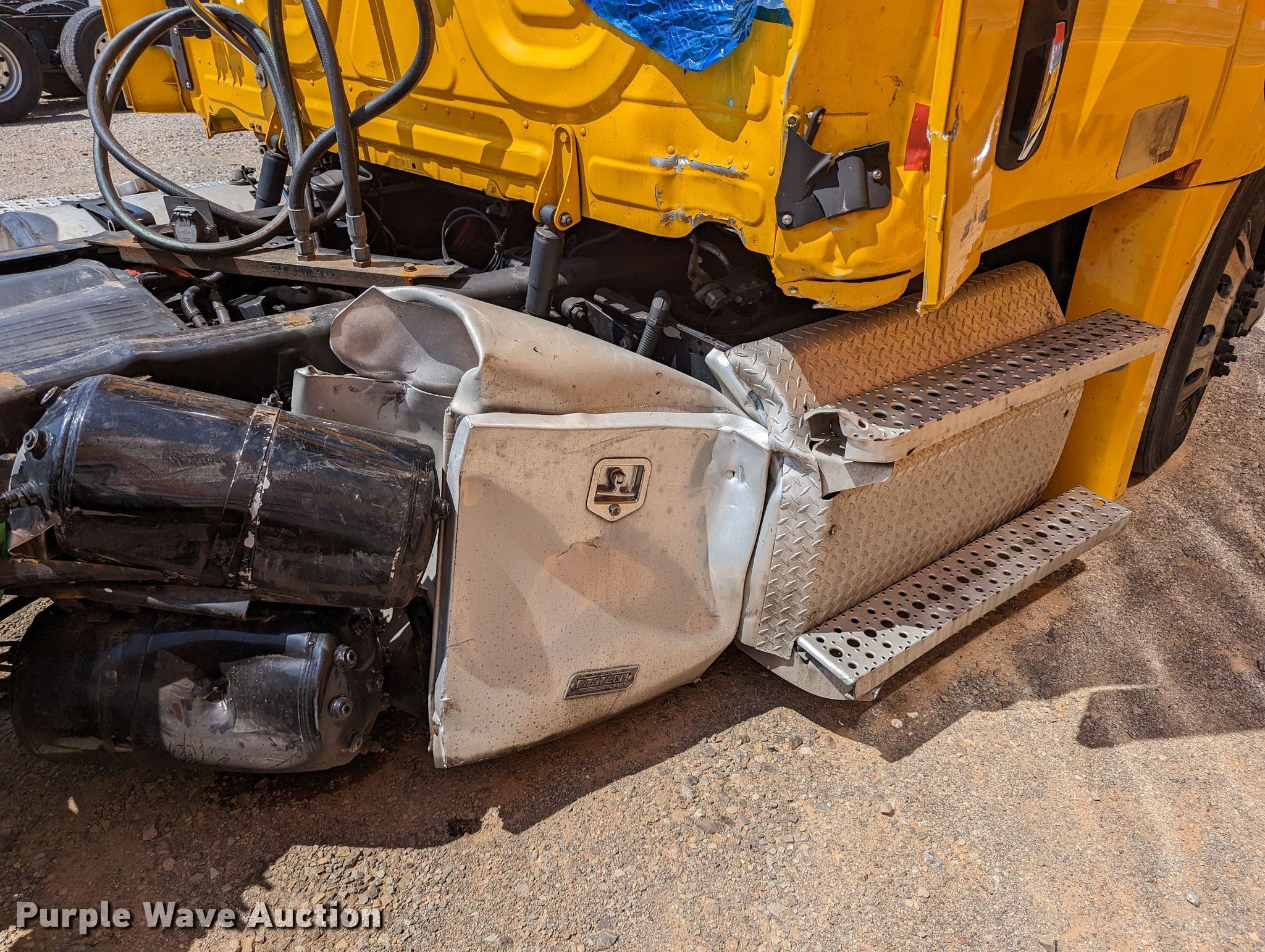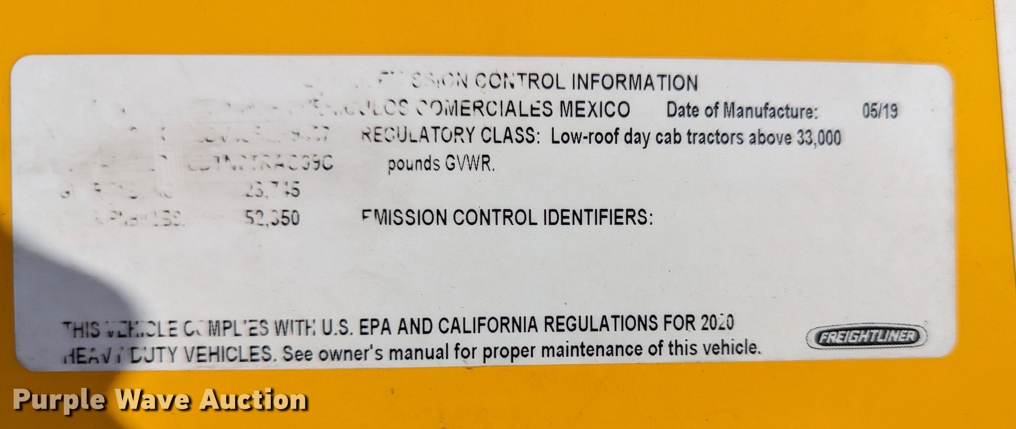 2020 Freightliner Cascadia 126 semi truck. Miles: 388,631 on odometer, VIN: 3AKJHLDV0LSLH9467, Unit #: 1909. Engine Detroit Diesel DD13, Displacement: 12.8L, Cylinders: 6, Fuel type: Diesel, HP: 525, Engine brake. Transmission Automated manual. Chassis Axles: Tandem, Differential lock: Inter-axle, Suspension: Air Dump valves, Brakes: Air, PTO, Wet kit, GVWR: 52,350 lbs. Interior AC, Heat, Heated mirrors, Power windows, Power locks, Cruise control. Features Fifth wheel type: Fixed, Fuel tank: Single. Tires Front: 295/75R22.5, Rear: 445/50R22.5. Notes Collision damage. Oklahoma title. Title distribution may be delayed up to 30 days from verification of funds. 10220 W Reno Ave. Oklahoma City, OK 73127
