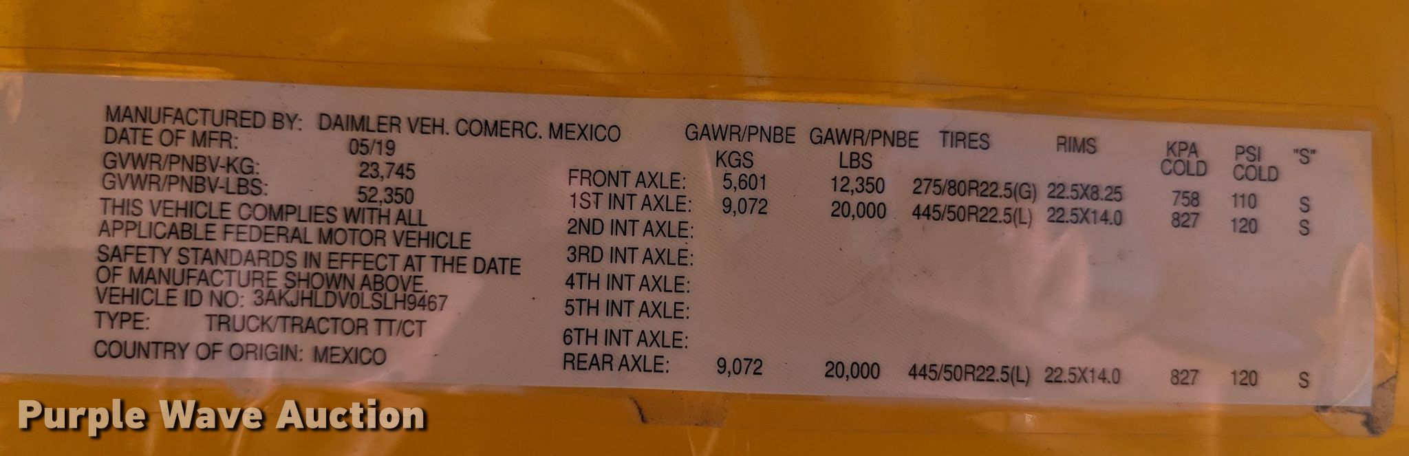 Purple Wave is selling a used Truck Tractor in Oklahoma. This item is a 2020 Freightliner Cascadia 126 semi truck with the following: Miles: 388,631 on odometer, VIN: 3AKJHLDV0LSLH9467, Unit #: 1909
