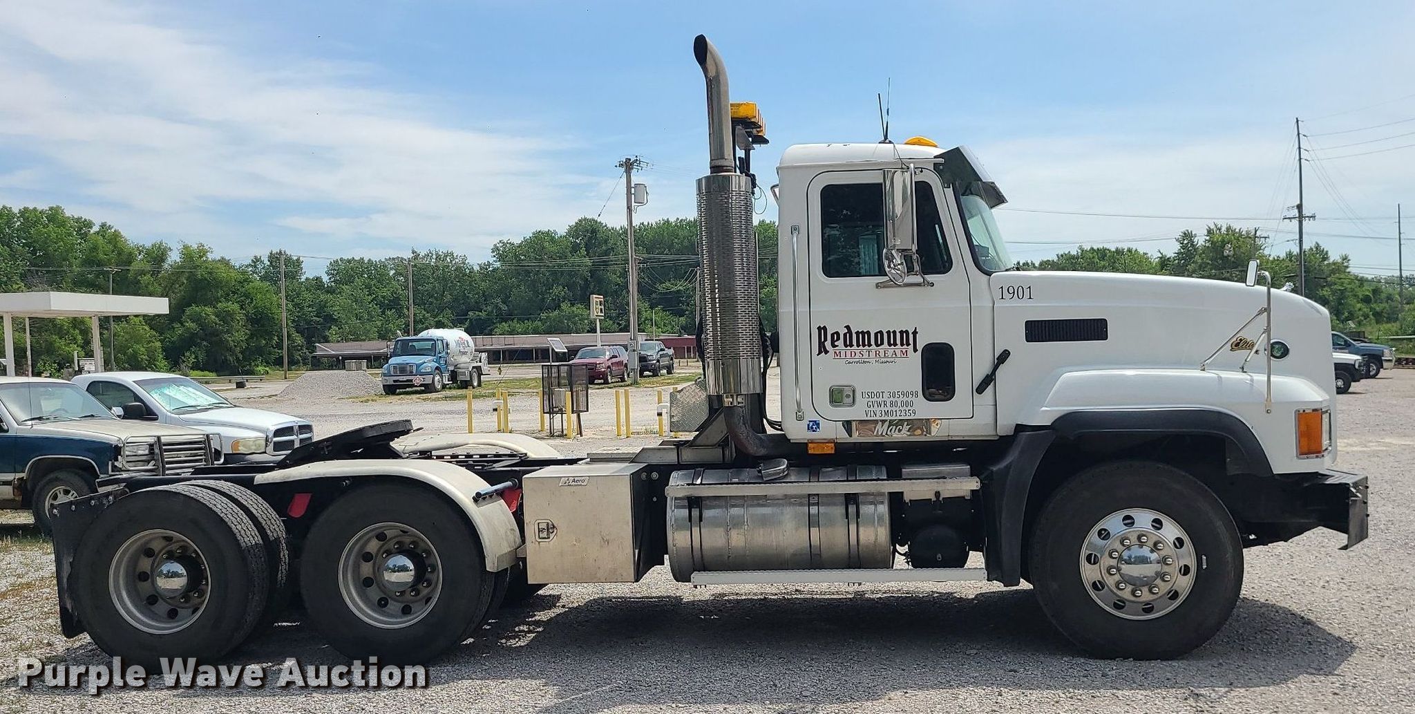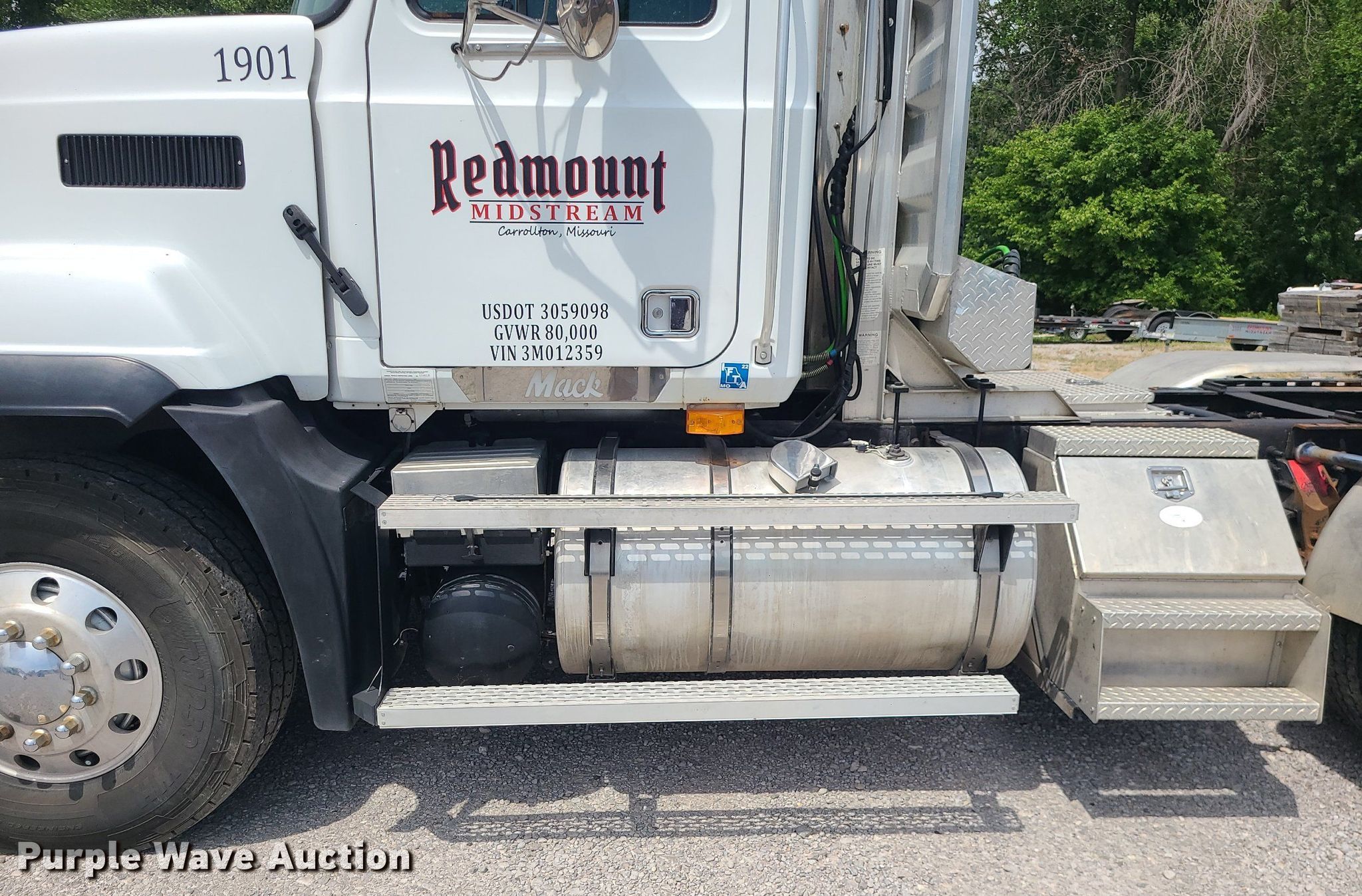 2003 Mack CL713 semi truck. Miles: 520,602 on odometer, Hours: 12,659 on meter, VIN: 1M2AD62Y53M012359. Engine Displacement: 12.0L, Cylinders: 6, Fuel type: Diesel. Transmission Manual, Speed: 8. Chassis Axles: Tandem, Suspension: Air, Brakes: Air, GVWR: 60,300 lbs FAWR: 14,300 lbs, IAWR: 23,000 lbs, RAWR: 23,000 lbs. Interior AC, Heat, Cruise control. Features Deck plate: Aluminum, Fifth wheel type: Air operated, Sliding, Fuel tank: Dual. Tires Front: 315/80R22.5, Rear: 11R22.5. Missouri title. Title distribution may be delayed up to 14 days from verification of funds. Redmount Midstream llc.. 912 South Main Street. Carrollton, MO 64633