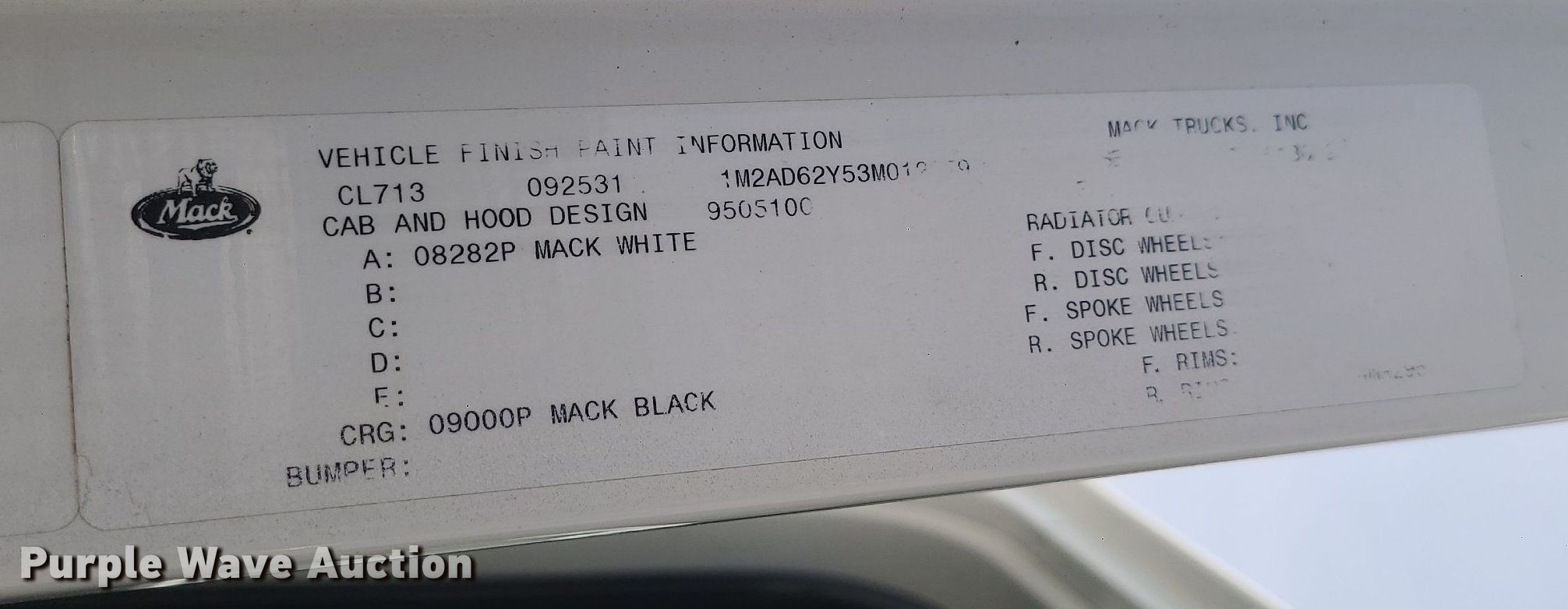 Purple Wave is selling a used Truck Tractor in Missouri. This item is a 2003 Mack CL713 semi truck with the following: Miles: 520,602 on odometer, Hours: 12,659 on meter, VIN: 1M2AD62Y53M012359