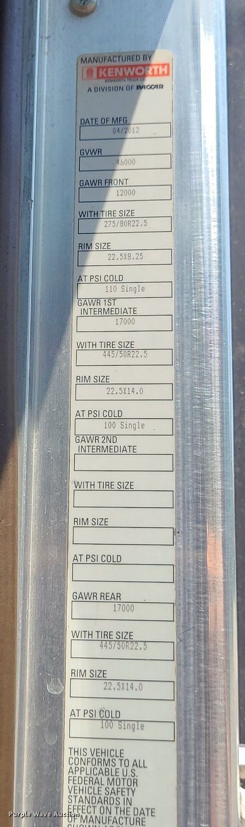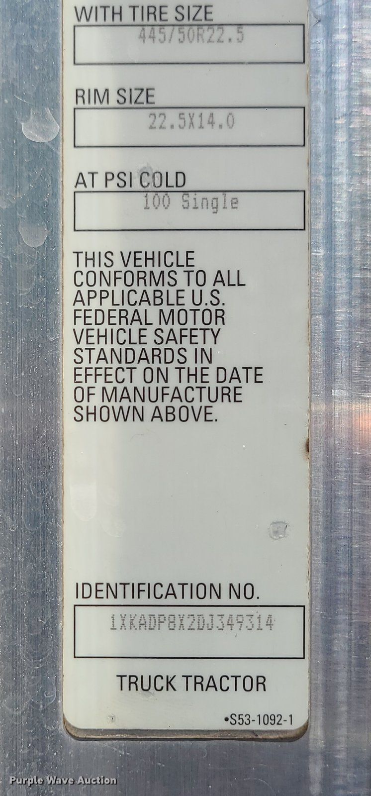 2013 Kenworth T660 semi truck. Miles: 814,319 on odometer, Hours: 17,775 on meter, VIN: 1XKADP8X2DJ349314. Engine Paccar MX, Displacement: 12.9L, Cylinders: 6, Fuel type: Diesel. Transmission Manual, Speed: 10. Chassis Axles: Tandem, Suspension: Air, Brakes: Air. Interior AC, Heat, Power windows, Power locks, Cruise control, Air ride cab, Sleeper Model: 60, Beds: Single, Rear climate control. Features Deck plate: Aluminum, Fifth wheel type: Sliding, Fuel tank: Dual. Tires Size: 295/75R22.5. Notes Dash warning indicator: Check engine. Missouri title. Title has a lien that will be released following the close of the auction. Title distribution may be delayed up to 30 days from verification of funds. 2905 S Claremont Ave. Independence, MO 64052