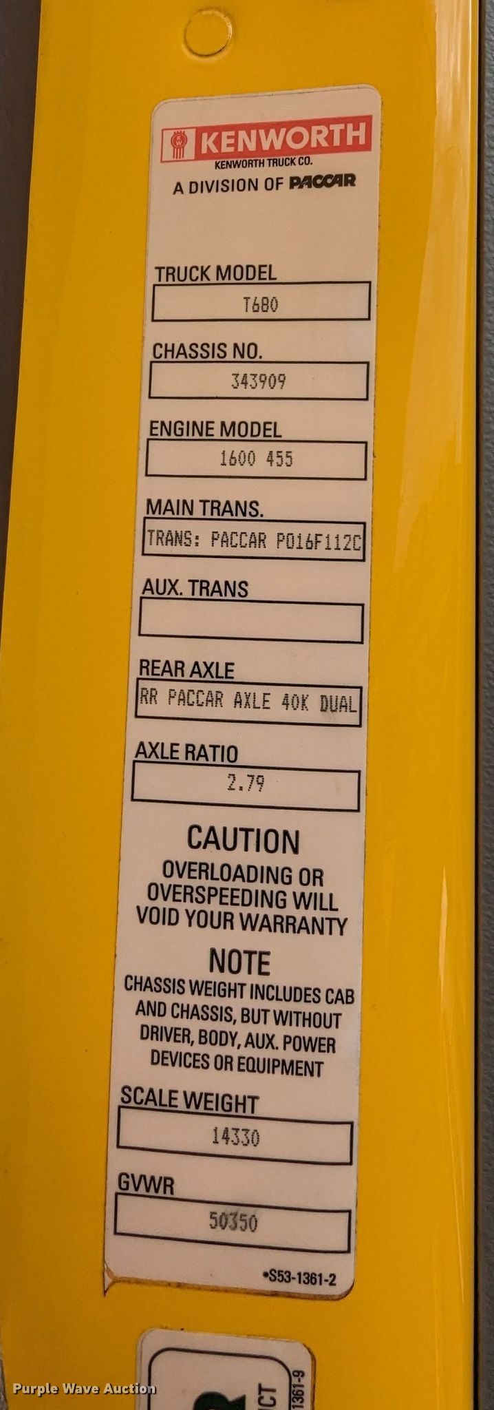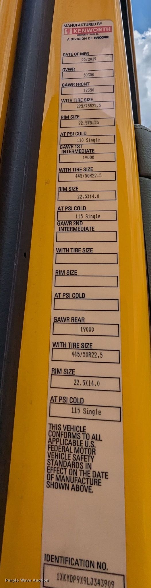 2020 Kenworth T680 semi truck. Miles: 407,210 on odometer, VIN: 1XKYDP9X9LJ343909. Engine Paccar MX-13, Displacement: 12.9L, Cylinders: 6, Fuel type: Diesel. Transmission Automated manual. Chassis Axles: Tandem, Differential lock: Inter-axle, Suspension: Air Dump valves, Brakes: Air, GVWR: 50,350 lbs. Interior AC, Heat, Power windows, Power locks, Cruise control, Air ride cab. Features Deck plate: Aluminum, Fifth wheel type: Fixed, Fuel tank: Dual. Tires Front: 295.75R22.5. Notes Collision damage , Parts may be missing, Non-operational unit. Oklahoma title. Title distribution may be delayed up to 30 days from verification of funds. 10220 W Reno Ave. Oklahoma City, OK 73127