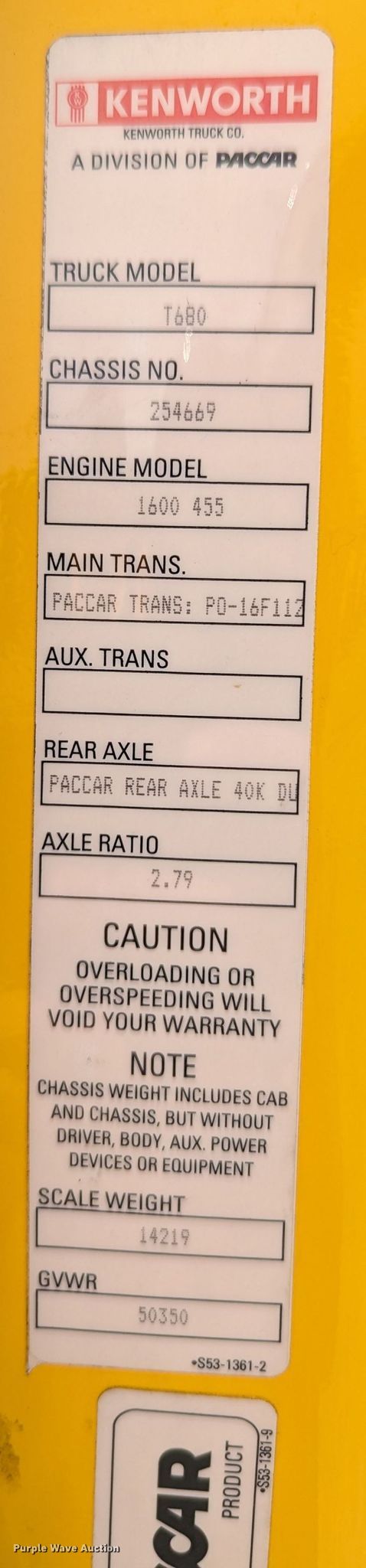2019 Kenworth T680 semi truck. Miles: 793,163 on odometer, Hours: 15,863 on meter, VIN: 1XKYDP9XXKJ254669. Engine Paccar MX-13, Displacement: 12.9L, Cylinders: 6, Fuel type: Diesel, Engine brake. Transmission Automated manual. Chassis Axles: Tandem, Differential lock: Inter-axle, Suspension: Air Dump valves, Brakes: Air, GVWR: 50,350 lbs. Interior AC, Heat, Heated mirrors, Power windows, Power locks, Cruise control, Air ride cab. Features Deck plate: Aluminum, Fifth wheel type: Fixed, Fuel tank: Single. Tires Front: 295/75R22.5, Rear: 445/50R22.5. Notes Dash warning indicator: Check engine. Oklahoma title. Title distribution may be delayed up to 30 days from verification of funds. 10220 W Reno Ave. Oklahoma City, OK 73127