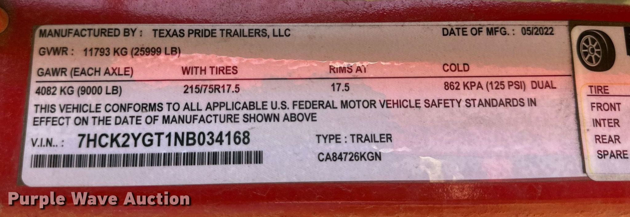 Purple Wave is selling a used Car Carrier in Oklahoma. This item is a 2022 Texas Pride CA84726KGN car carrier with the following: VIN: 7HCK2YGT1NB034168