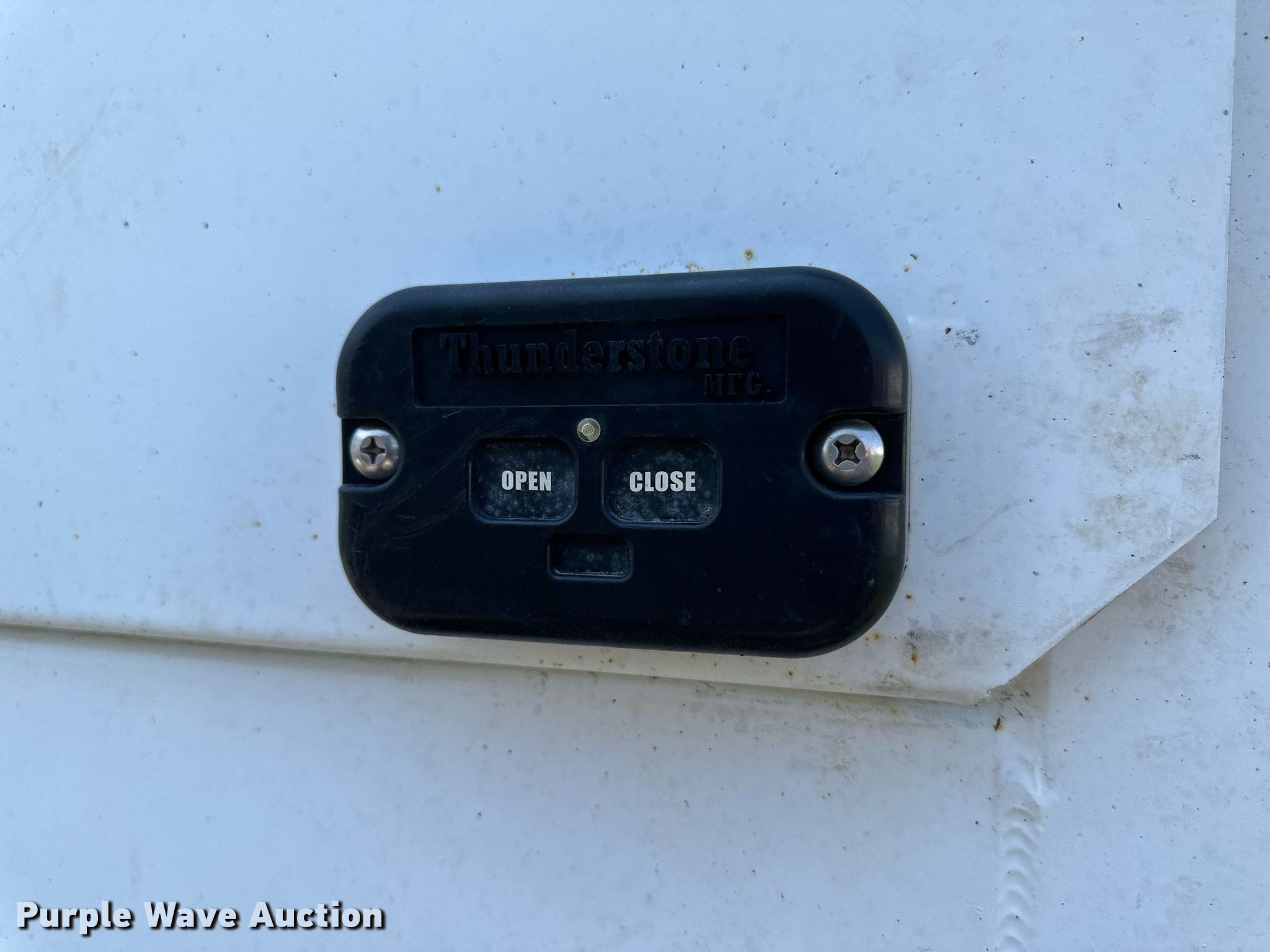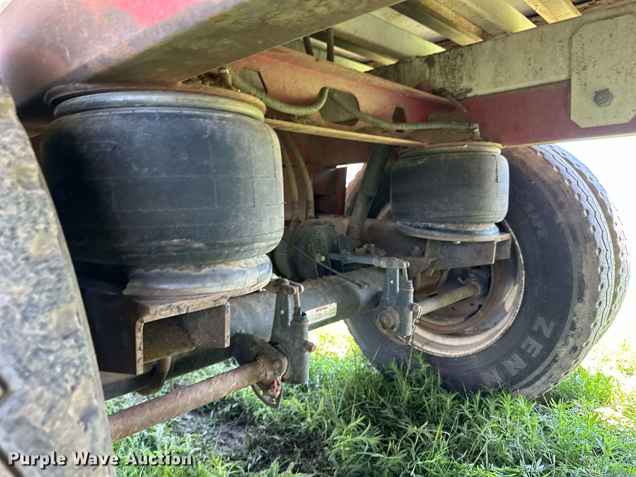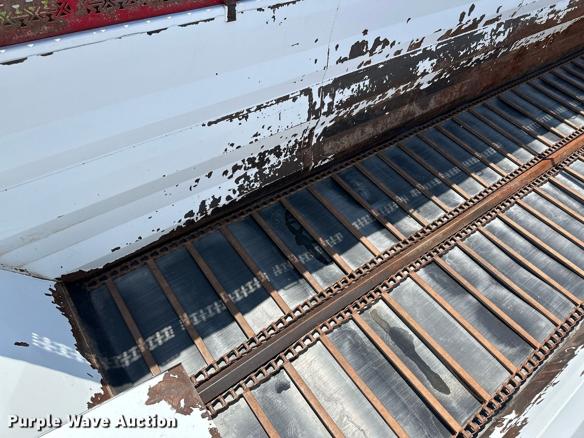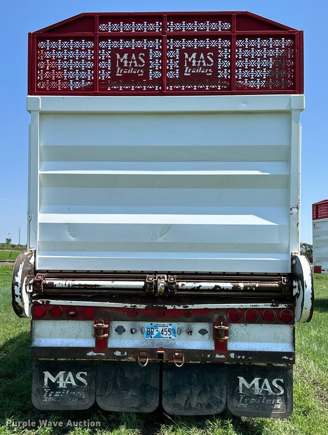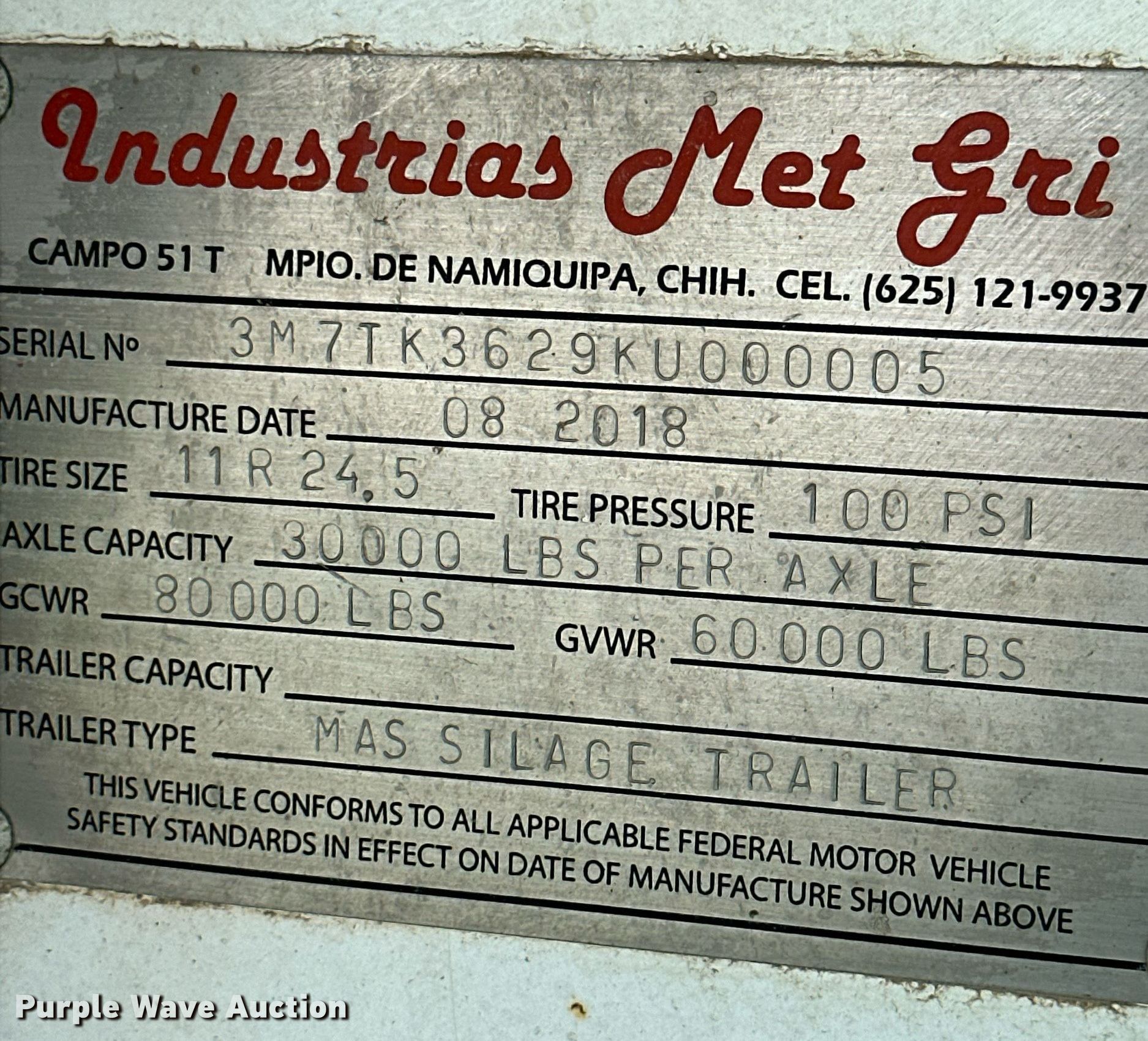 2018 Mas silage trailer. VIN: 3M7TK3629KU000005. Dimensions Overall: 36' L x 103" W, Side height: 70", Sideboard height: 24". Features Body type: Steel, Floor: Slat and chain Belt/ chain width: 93", Roll tarp, Rear Rear brake outlet, Rear electric outlet, Rear outlet hitch. Chassis Landing gear: Dual, Suspension: Air, Brakes: Air, Axles: Tandem, GVWR: 60,000 lbs. Tires Aluminum wheels, Size: 11R24.5. Notes Truck not included. Oklahoma title. Title has a lien that will be released following the close of the auction. Title distribution may be delayed up to 30 days from verification of funds. Cimarron, KS 67835