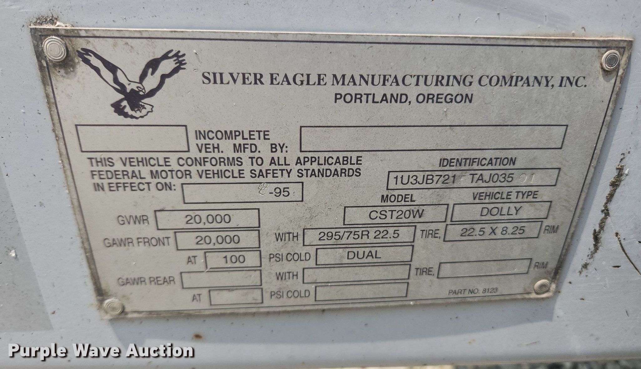 1996 Silver Eagle CST20W trailer dolly. VIN: 1U3JB7215TAJ03501. Chassis Hitch: Pintle, Brakes: Air, GVWR: 20,000 lbs. Tires Steel wheels, Size: 295/75R22.5. Fruendly Auto Source Inc.. 110 Raceway Park Dr. Moscow Mills, MO 63362