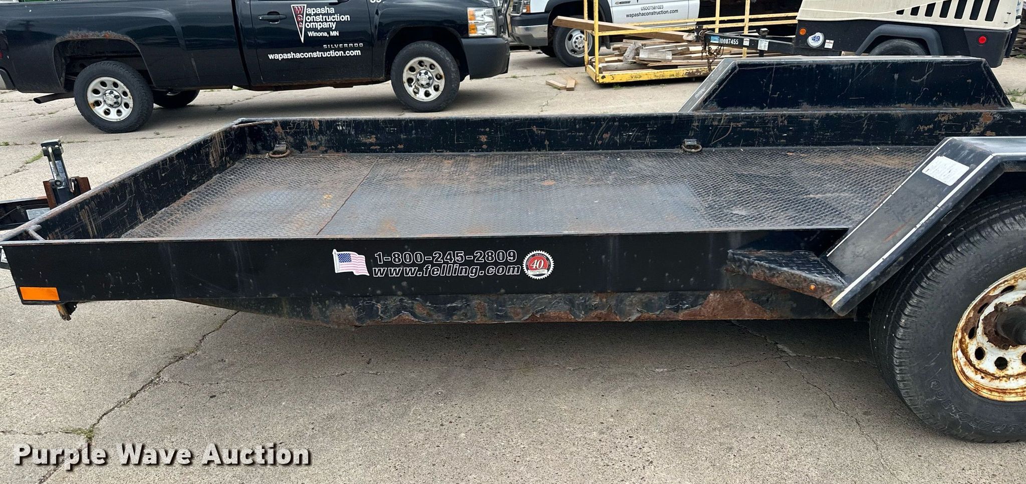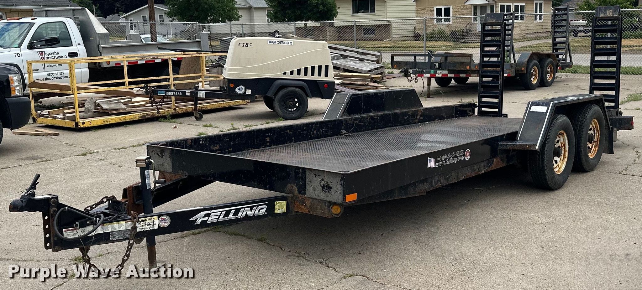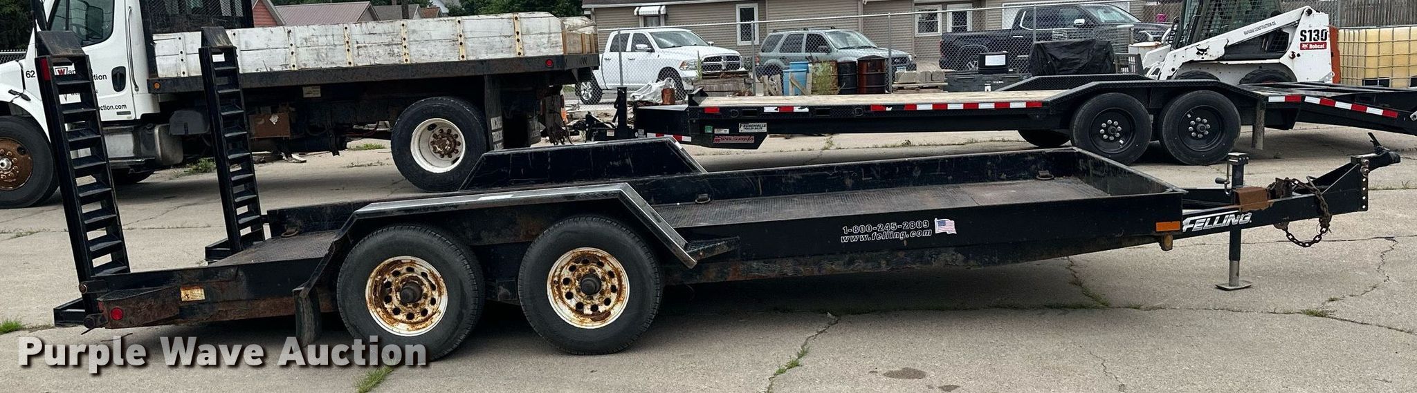 2015 Felling FT-10P equipment trailer. VIN: 5FTEE2423F1001120. Dimensions Overall: 20' 11" L x 102" W, Deck: 16' 1" L x 79" W, Deck height: 1' 2", Ramps: Manual Length: 5'. Features Deck type: Steel. Chassis Ball hitch: 2 5/16", Landing gear: Single, Suspension: Spring, Brakes: Electric, Axles: Tandem, Sliding, GVWR: 9,980 lbs. Tires Steel wheels, Size: ST225/75R15. Minnesota title. Title distribution may be delayed up to 14 days from verification of funds. Wapasha Construction. 927 E King St. Winona, MN 55987