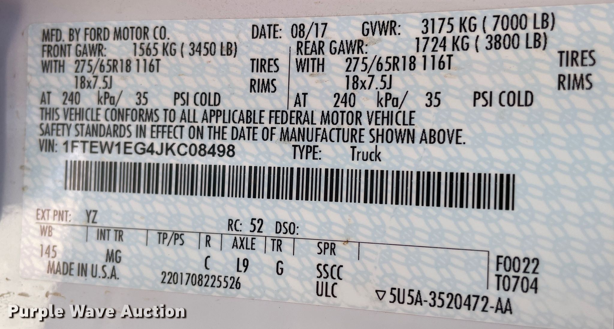 2018 Ford F150 XLT SuperCrew pickup truck. Miles: 184,703 on odometer, VIN: 1FTEW1EG4JKC08498. Engine Displacement: 3.5L V6, Cylinders: 6, Fuel type: Gas. Transmission Automatic, Four wheel drive. Interior AC, Heat, Seat: Power driver, Power windows, Power locks, Cruise control. Tires Size: 265/70R17. Notes Tailgate latch issue. Texas title. Title distribution may be delayed up to 14 days from verification of funds. Western Lease LLC. 10800 Interstate 27. Amarillo, TX 79119