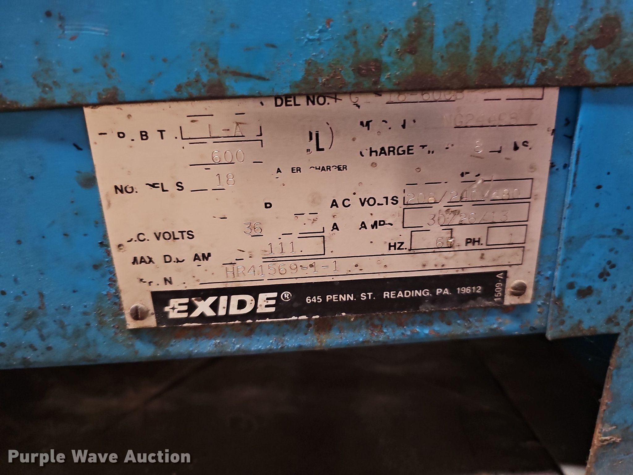 Nissan OR35 order picker. Hours: Unknown, Serial: OR35-A98-70213. Electric Motor Volts: 36, Charger: Single phase. Transmission Hydrostatic. Operators station Canopy. Features Maximum lift capacity: 3,500 lbs, Maximum lift height: 198", Mast stages: 3, Side shift, Mast tilt, Fork length: 42", Exide System 1000 charging system Volts: 208/240/480. Tires Solid. Notes Dead battery, Unknown operating condition. 1113 Monroe St. Fort Calhoun, NE 68023