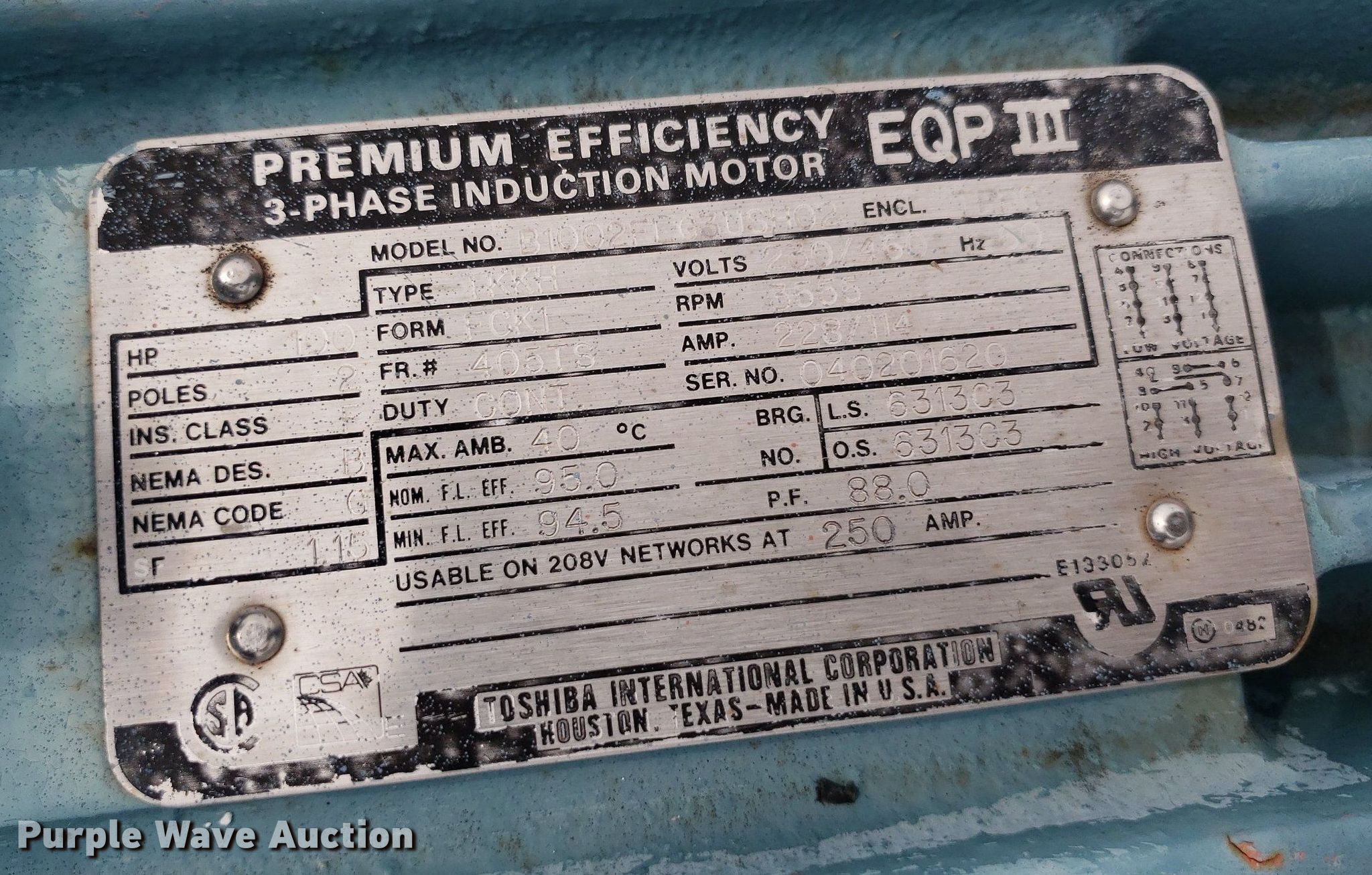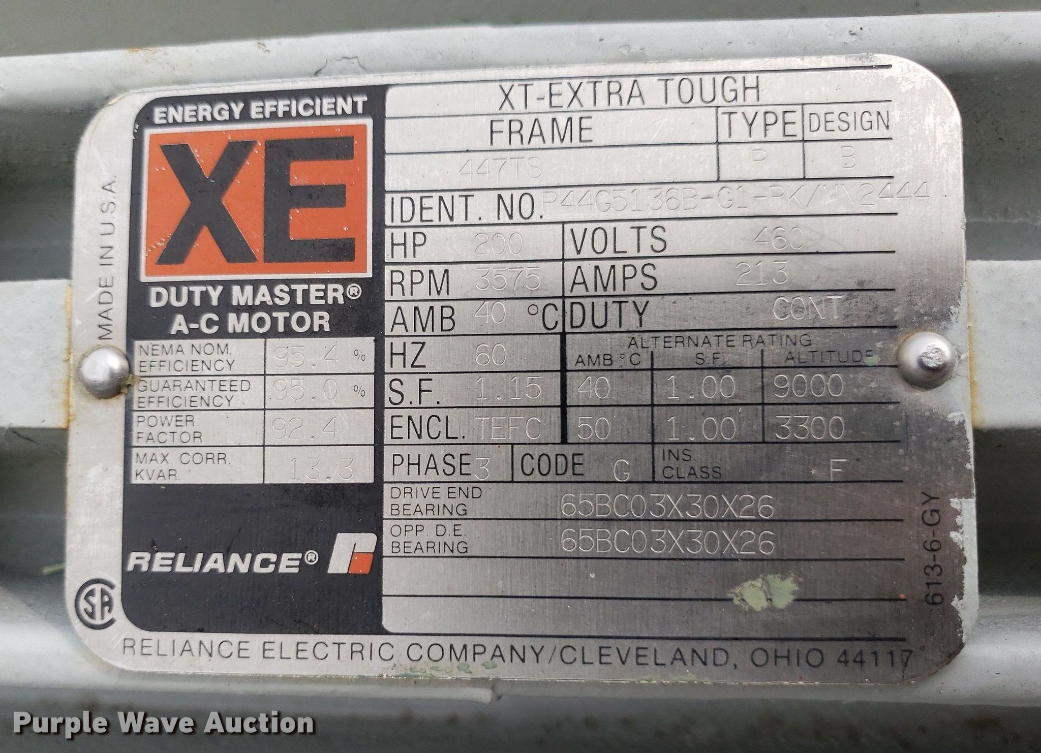 Purple Wave is selling a used Electric Motor in Kansas. This item is a (2) electric motors with the following: Premium Efficiency electric motor, 230/460V, 100 HP, Gardner Denver 75102-AD01 blower, Energy Efficient electric motor, 460V, 200 HP, Falk 5S2-02S gear drive, 3.995 ratio,, Unknown operating conditions