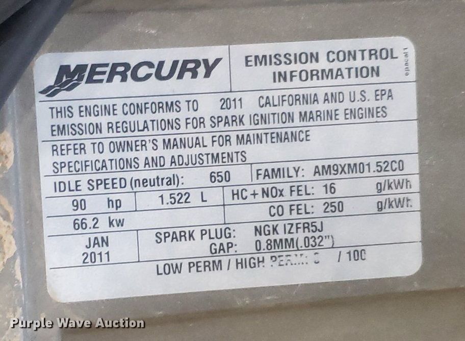Purple Wave is selling a used Boat in Kansas. This item is a Mercury Optimal 90HP outboard engine with the following: Serial: 1B840840, Cylinders: 3, Fuel type: Gas, HP: 90
