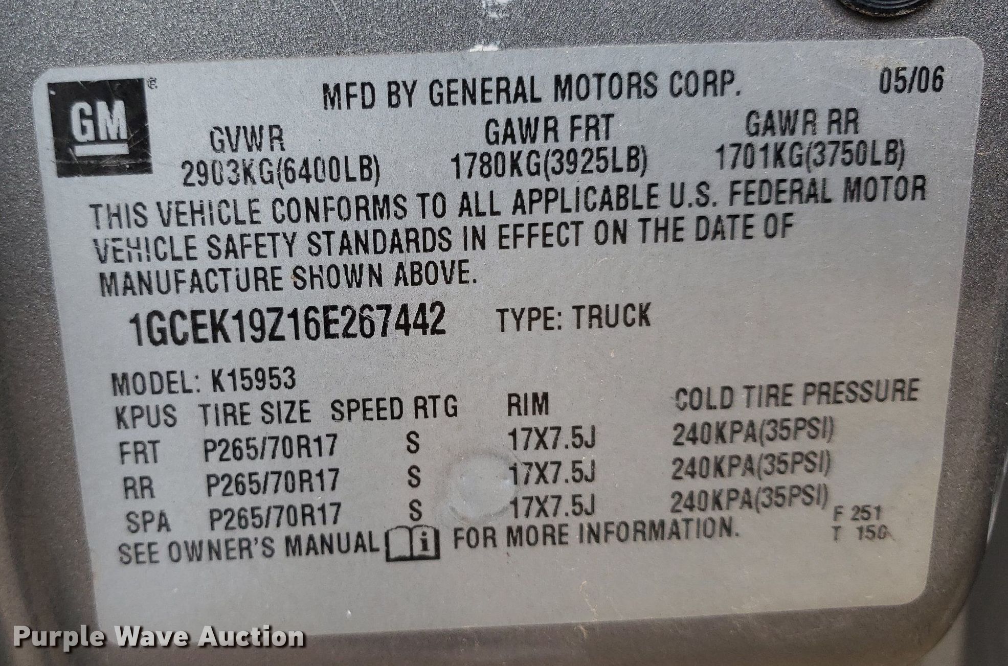 2006 Chevrolet Silverado 1500 Ext. Cab pickup truck. Miles: 198,283 on odometer, VIN: 1GCEK19Z16E267442. Engine Displacement: 5.3L V8 OHV , Cylinders: 8, Fuel type: Gas. Transmission Automatic, Four wheel drive. Interior AC, Heat, Cruise control. Tires Size: 285/70R17. Notes Dash warning indicator: Check engine, Brake, Airbag, Overheats, possible heater core problem. View repairs. Kansas title. Title distribution may be delayed up to 14 days from verification of funds. Derby, KS 67037