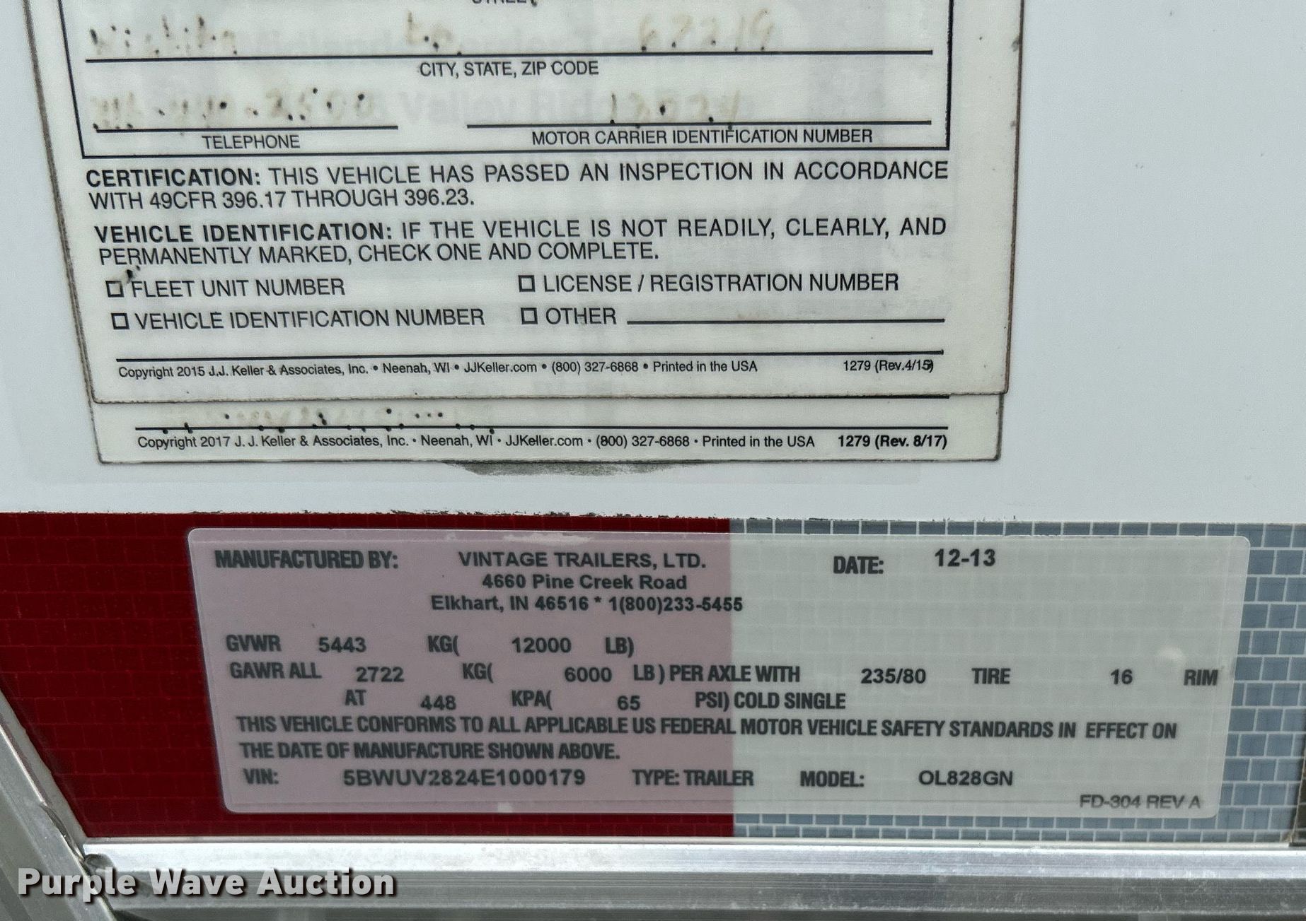 Purple Wave is selling a used Enclosed Cargo Trailer in Oklahoma. This item is a 2014 Vintage Trailers, LTD. OL828GN enclosed cargo trailer with the following: VIN: 5BWUV2824E1000179