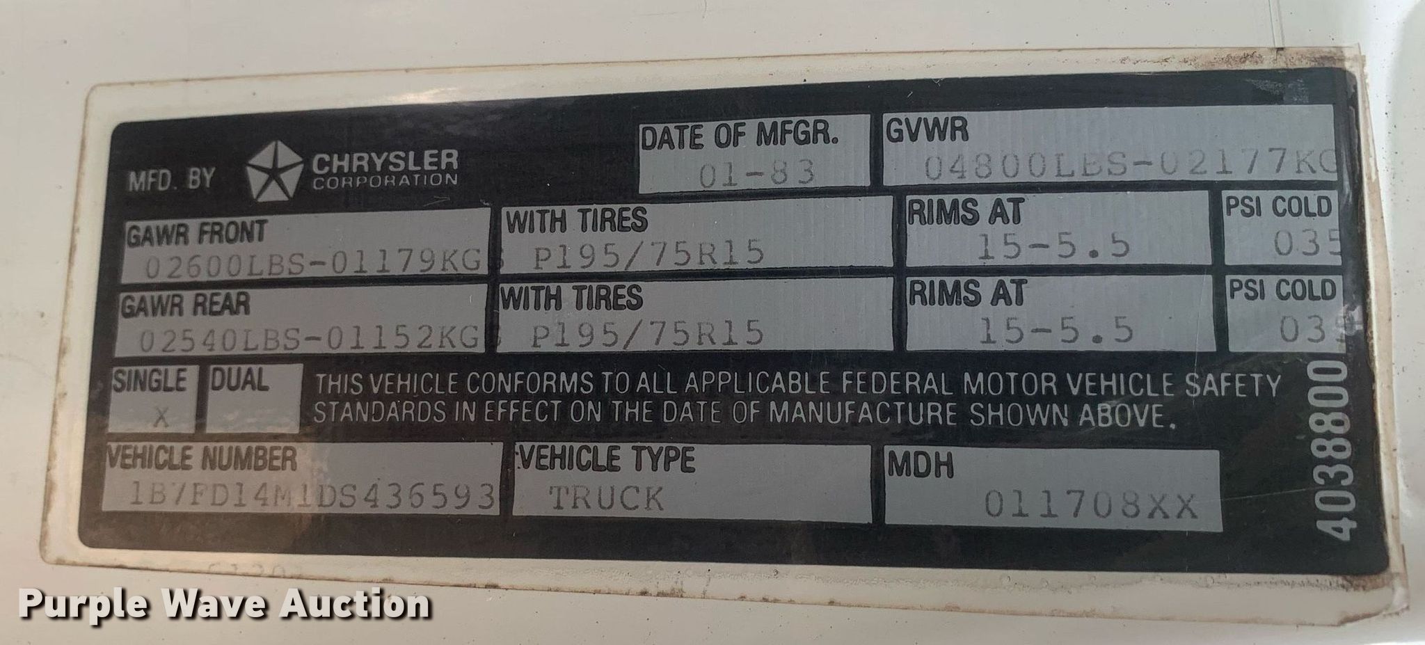 Purple Wave is selling a used 1/2 Ton Pickup or Van in Arkansas. This item is a 1983 Dodge Ram D150 pickup truck with the following: Miles: 33,792 on odometer, VIN: 1B7FD14M1DS436593