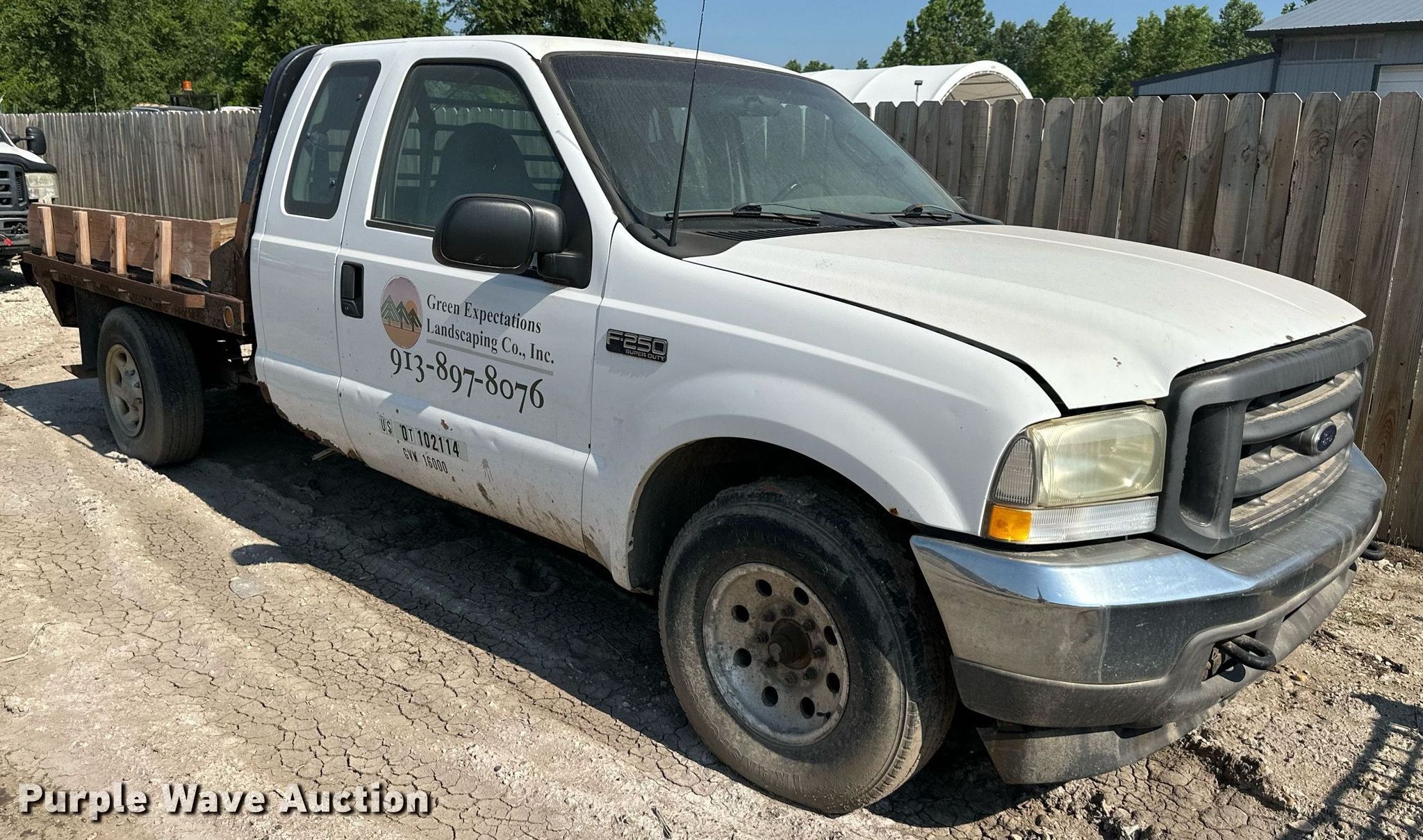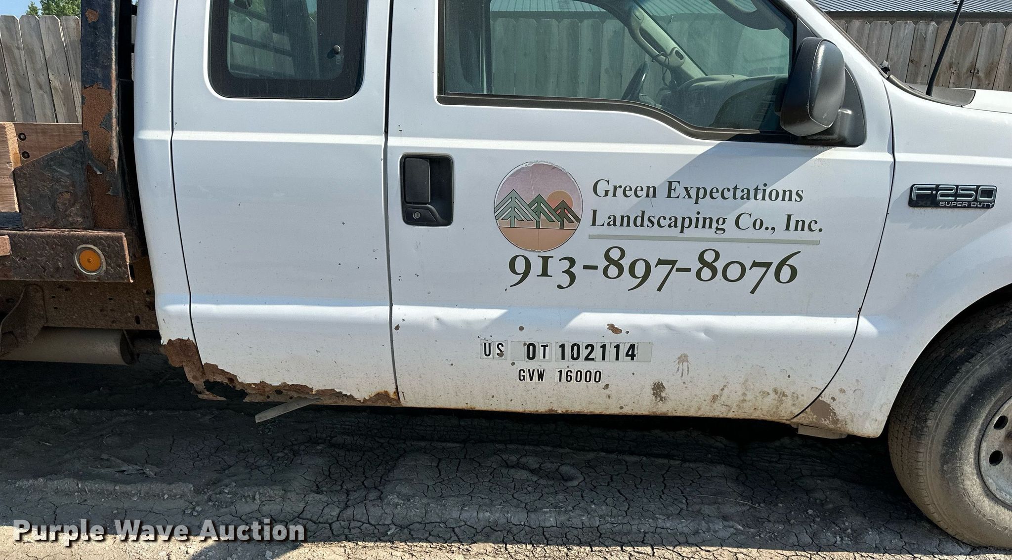 2003 Ford F250 Super Duty SuperCab flatbed pickup truck. Miles: 211,459 on odometer, VIN: 1FDNX20LX3EB15036, Unit #: 8. Engine Displacement: 5.4L V8 SOHC, Cylinders: 8, Fuel type: Gas. Transmission Automatic. Interior AC, Heat. Features Flatbed 8' L x 83" W, Hitch: Gooseneck. Tires Size: 235/85R16. Notes Dash warning indicator: Brake, Windshield chipped or cracked, No battery , Unknown operating condition. Kansas title. Title distribution may be delayed up to 14 days from verification of funds. Green Expectations Landscaping Co., Inc... 1910 S 74th St. Kansas City, KS 66106