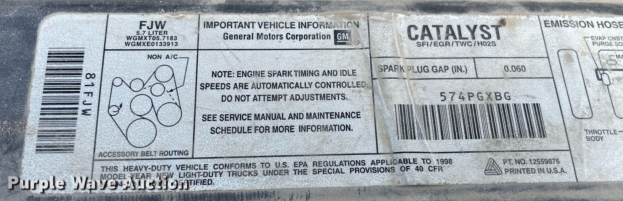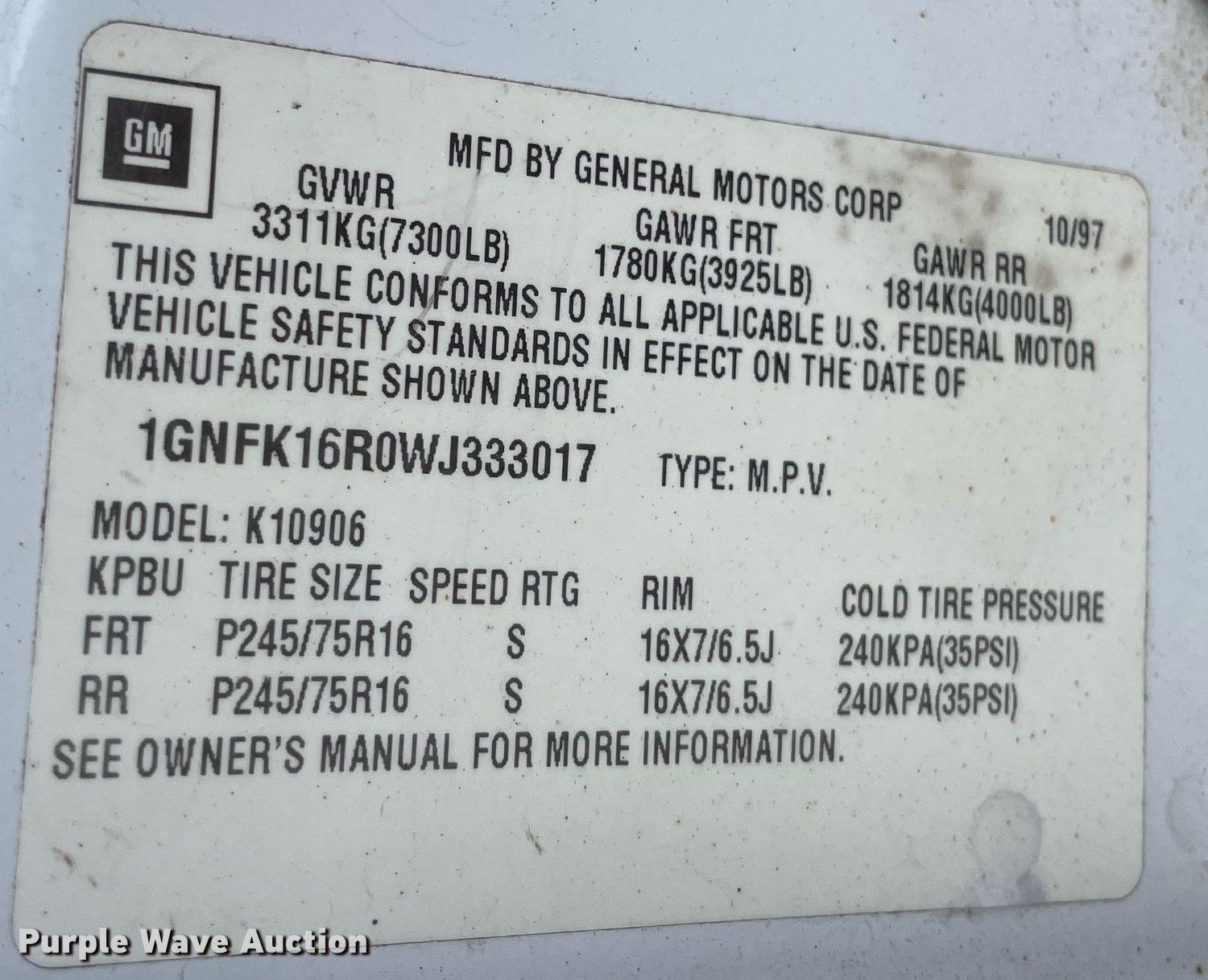 Purple Wave is selling a used Passenger Vehicle in Kansas. This item is a 1998 Chevrolet Suburban 1500 SUV with the following: Miles: 311,706 on odometer, VIN: 1GNFK16R0WJ333017