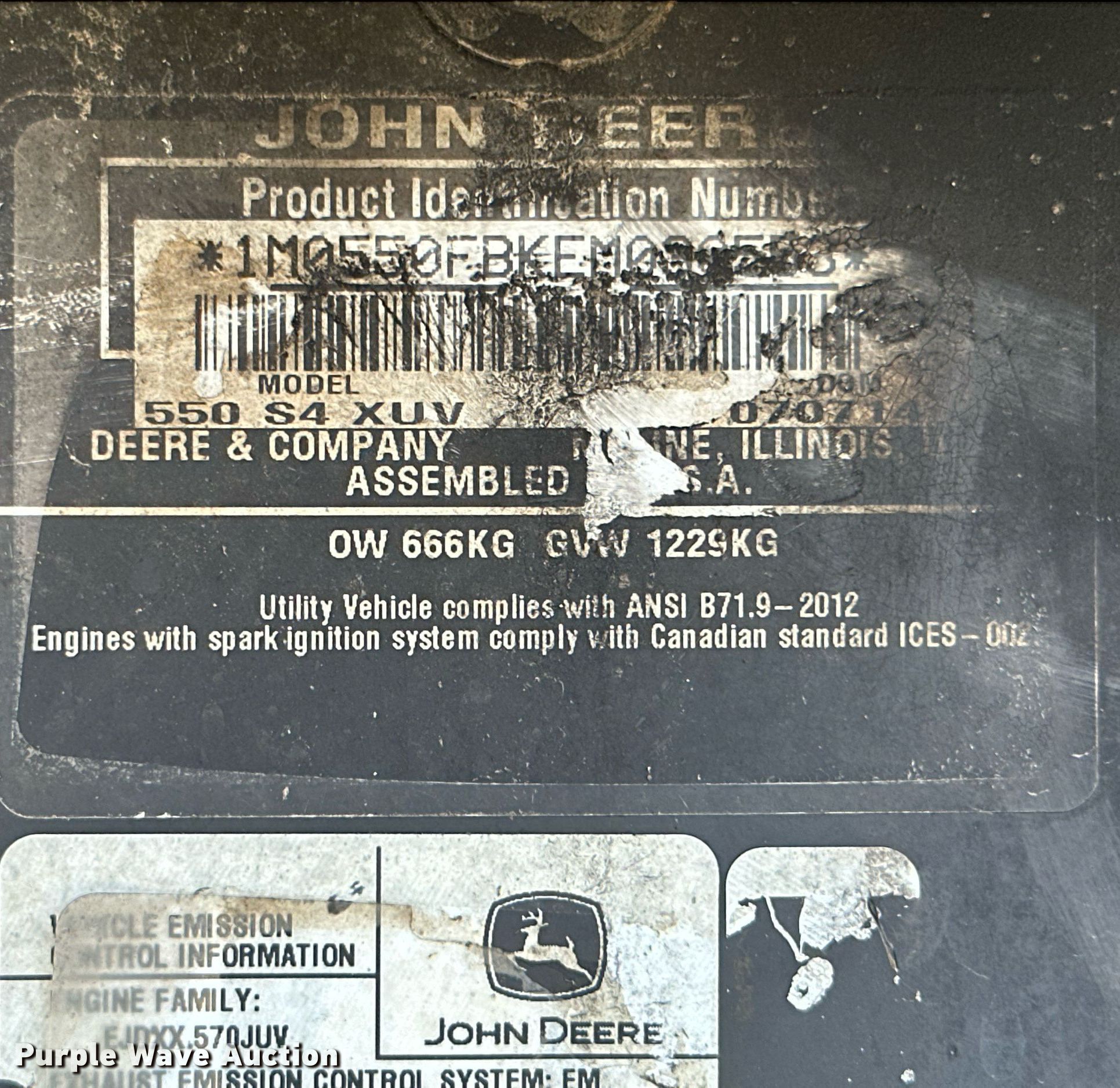 Purple Wave is selling a used Utility Vehicle in Oklahoma. This item is a 2014 John Deere 550 S4 utility vehicle with the following: Hours: 1,701 on meter, Serial: 1M0550FBKEM09558