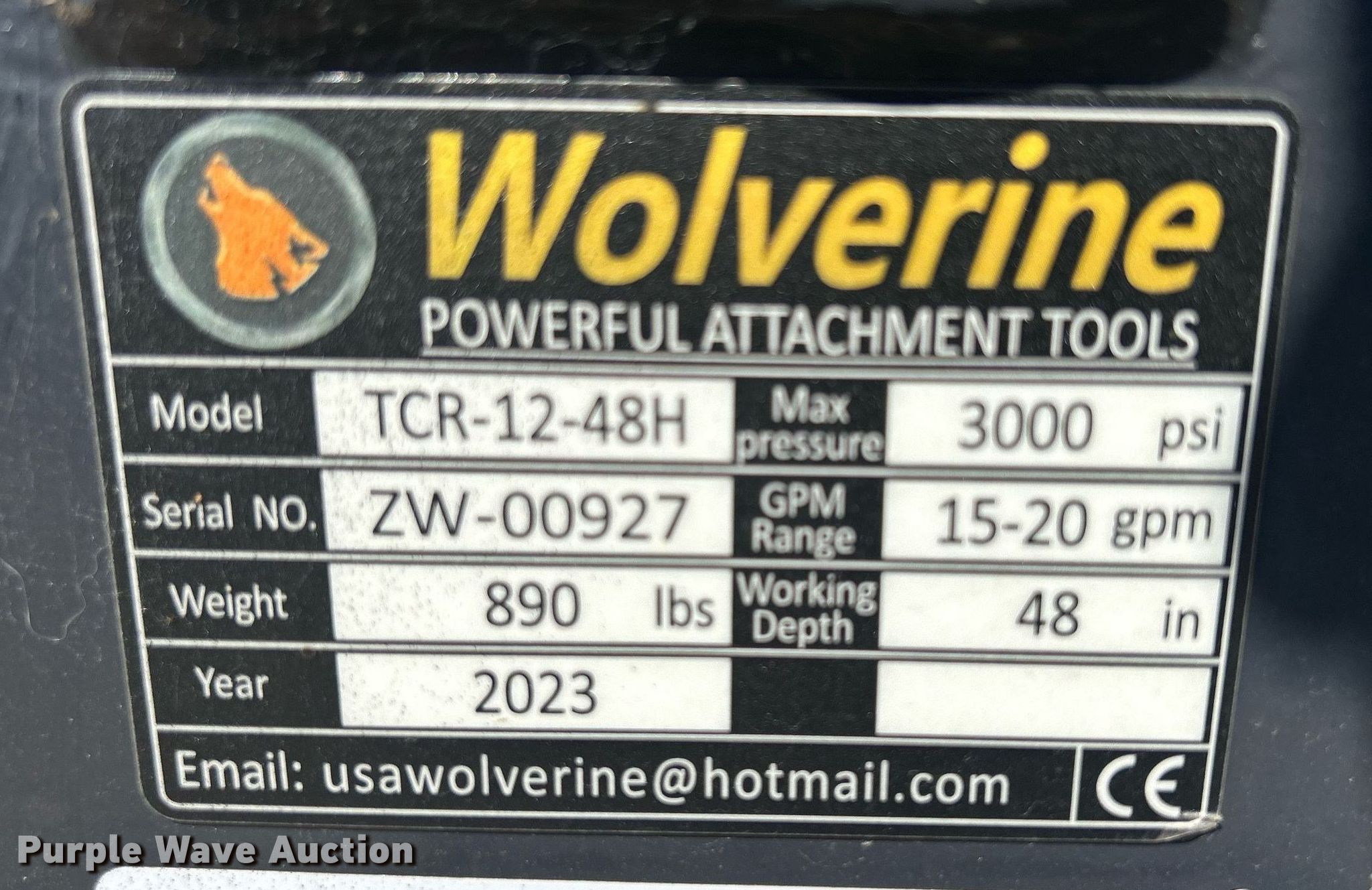Purple Wave is selling a used Skid Steer Attach. in Iowa. This item is a 2023 Wolverine TCR-12-48H skid steer trencher with the following: Serial: ZW-00927, Length: 48"