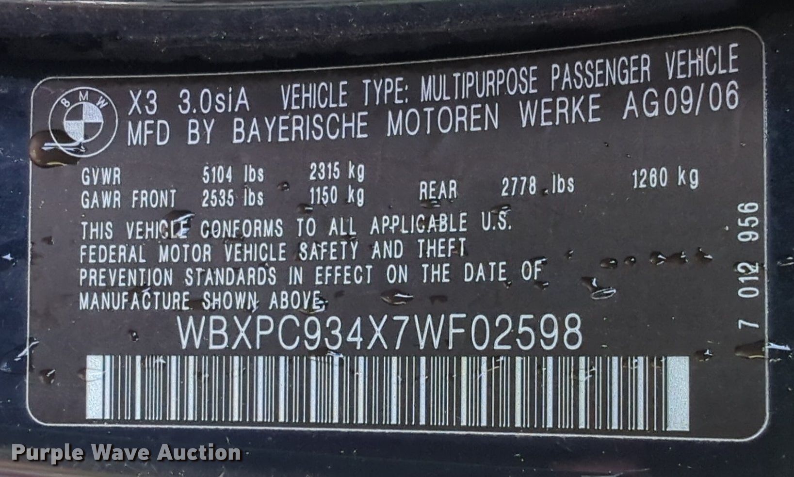 Purple Wave is selling a used Passenger Vehicle in Oklahoma. This item is a 2007 BMW X3 SUV with the following: Miles: 155,561 on odometer, VIN: WBXPC934X7WF02598
