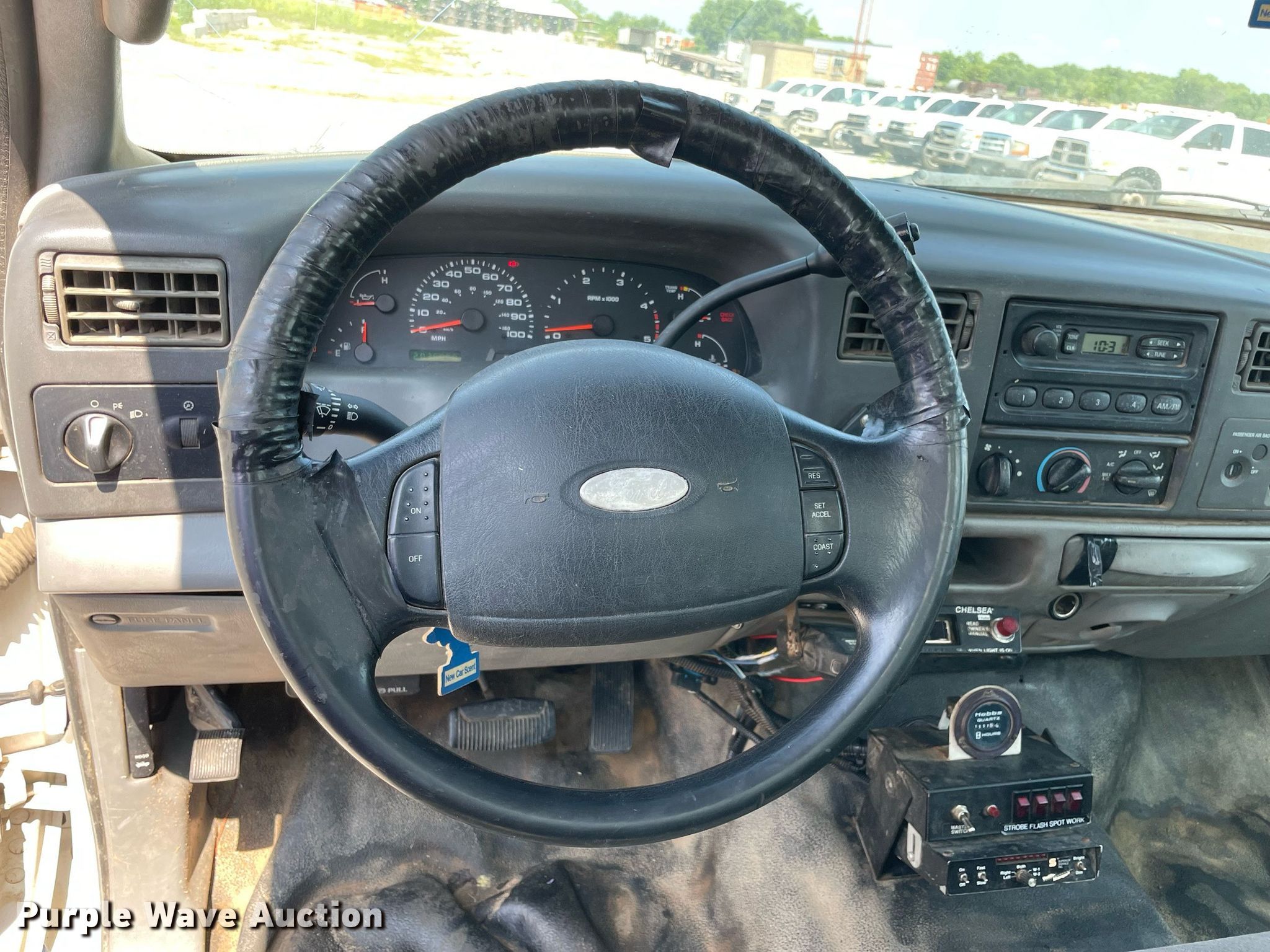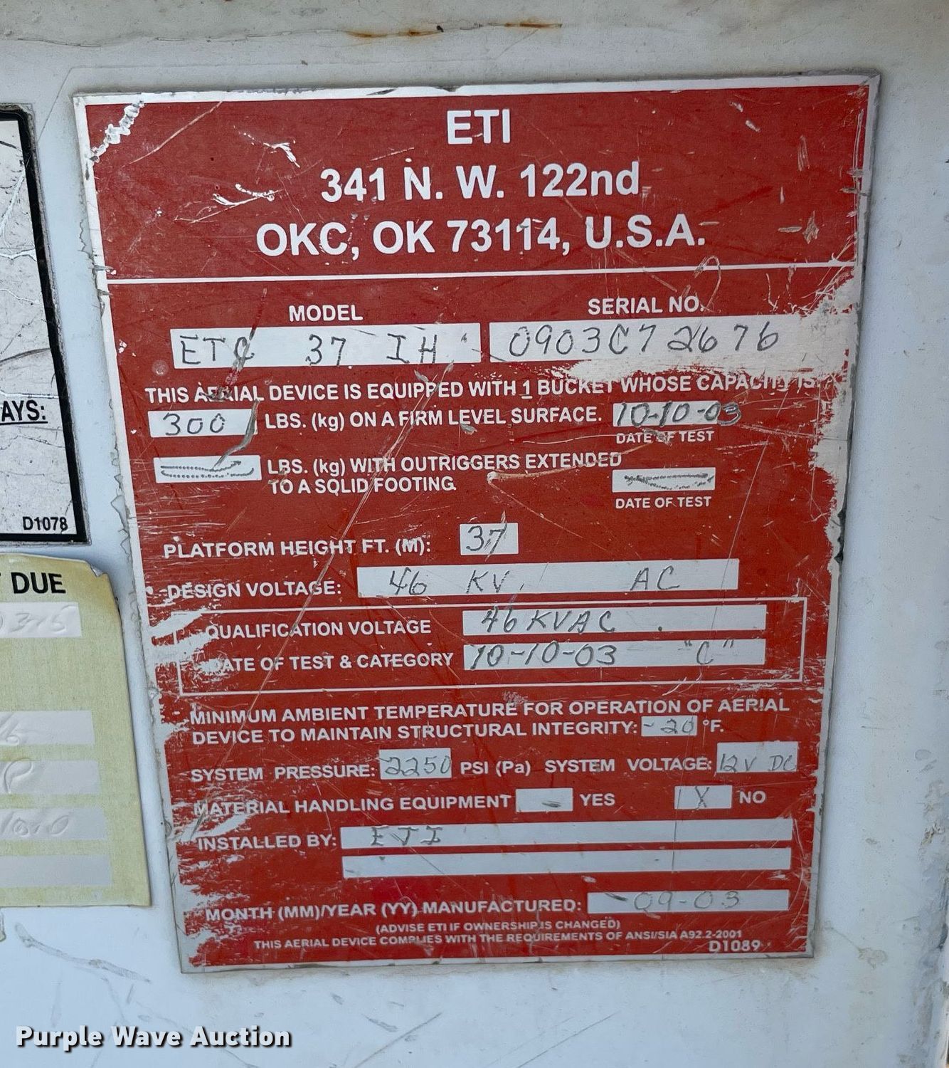 2004 Ford F550 Super Duty bucket truck. Miles: 203,605 on odometer, Hours: 1,597 on meter, VIN: 1FDAF56P54EA24450. Engine Cummins, Cylinders: 6, Fuel type: Diesel. Transmission Automatic. Chassis Axles: Single, Suspension: Spring, Brakes: Hydraulic, PTO. Interior AC, Heat, Cruise control, Auxiliary controls. Features Bed 149" L x 94" W, Boom ETI ETC37IH, Serial: 0903C72676, Maximum lift capacity: 300 lbs, Maximum lift height: 37', Man basket, Boom controls Ground, Platform/ basket.. Tires Size: 245/70R19.5. Notes Dash warning indicator: Check engine, Water in fuel, Windshield chipped or cracked. Oklahoma title. Title distribution may be delayed up to 14 days from verification of funds. CD Brown Construction. 744 Oaklawn Rd. Sulphur, OK 73086