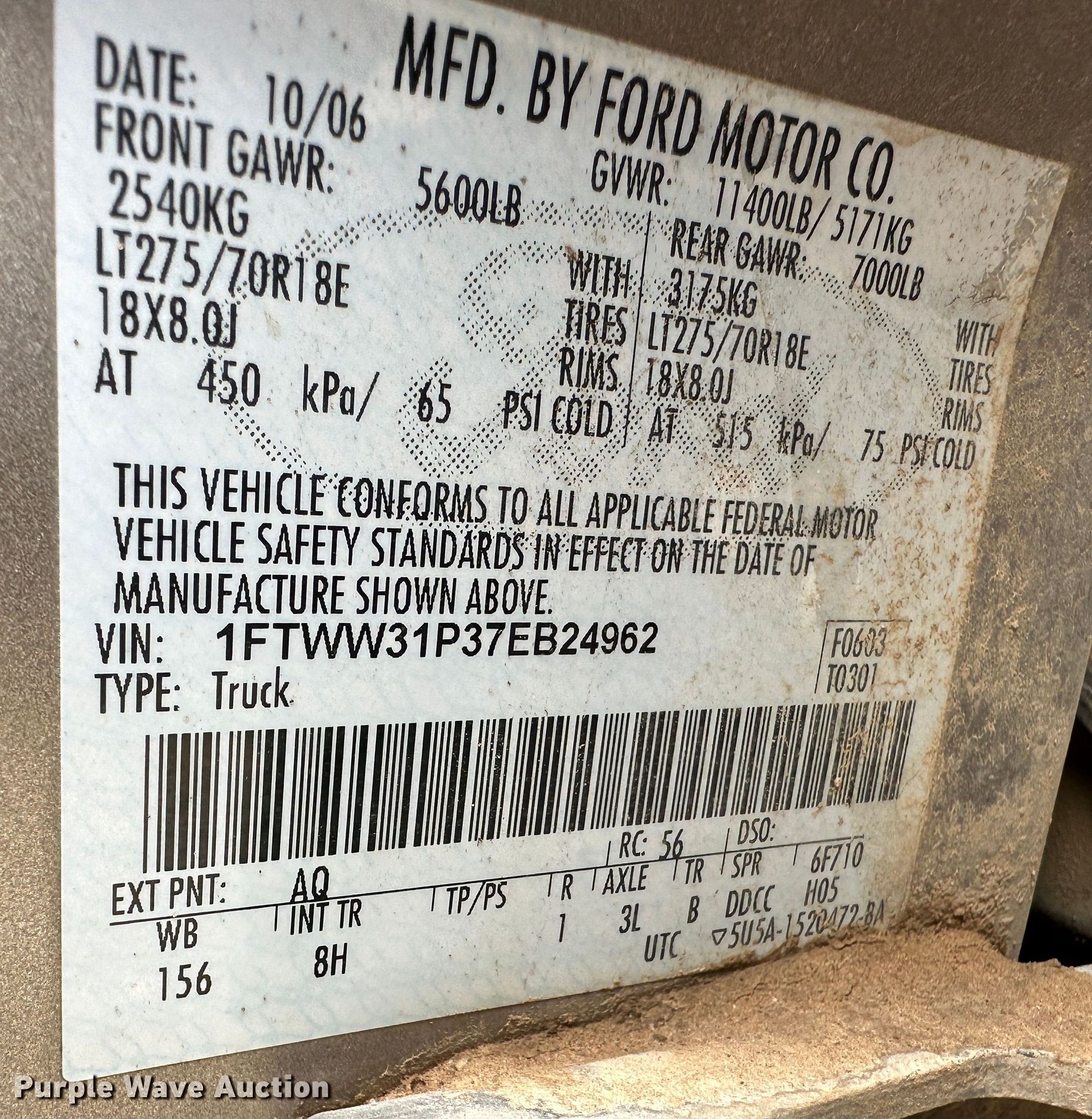 2007 Ford F350 Super Duty Crew Cab pickup truck. Miles: 334,360 on odometer, VIN: 1FTWW31P37EB24962. Engine Displacement: 6.0L V8 OHV, Cylinders: 8, Fuel type: Diesel. Transmission Automatic, Four wheel drive. Interior AC, Heat, Seat: Heated, Power driver, Power passenger, Power windows, Power locks, Cruise control. Features Hitch: Gooseneck. Tires Size: 35x12.50R20. Notes Starts hard. Kansas title. Title distribution may be delayed up to 14 days from verification of funds. 95 Hwy 71. Keyes, OK 73947
