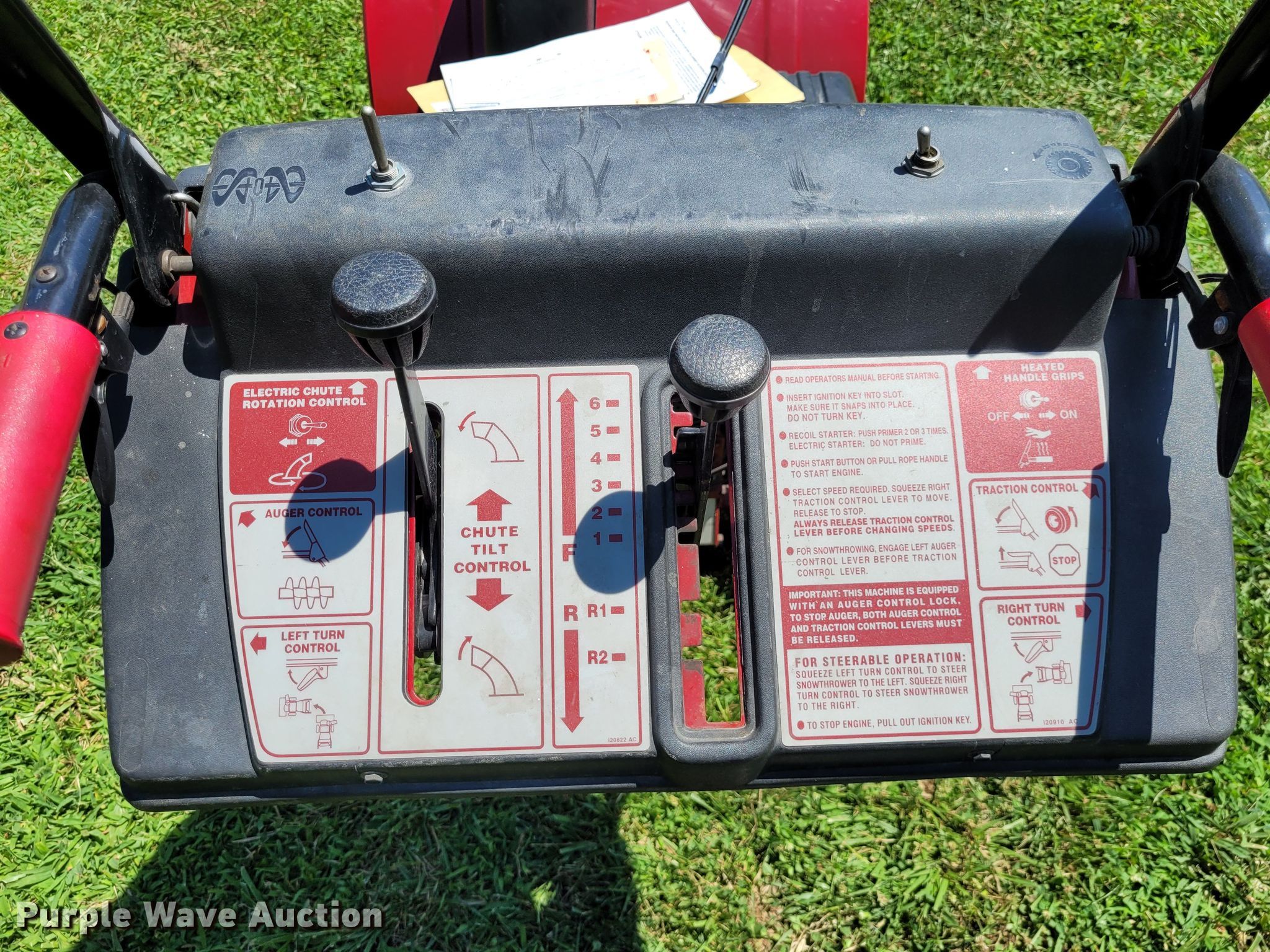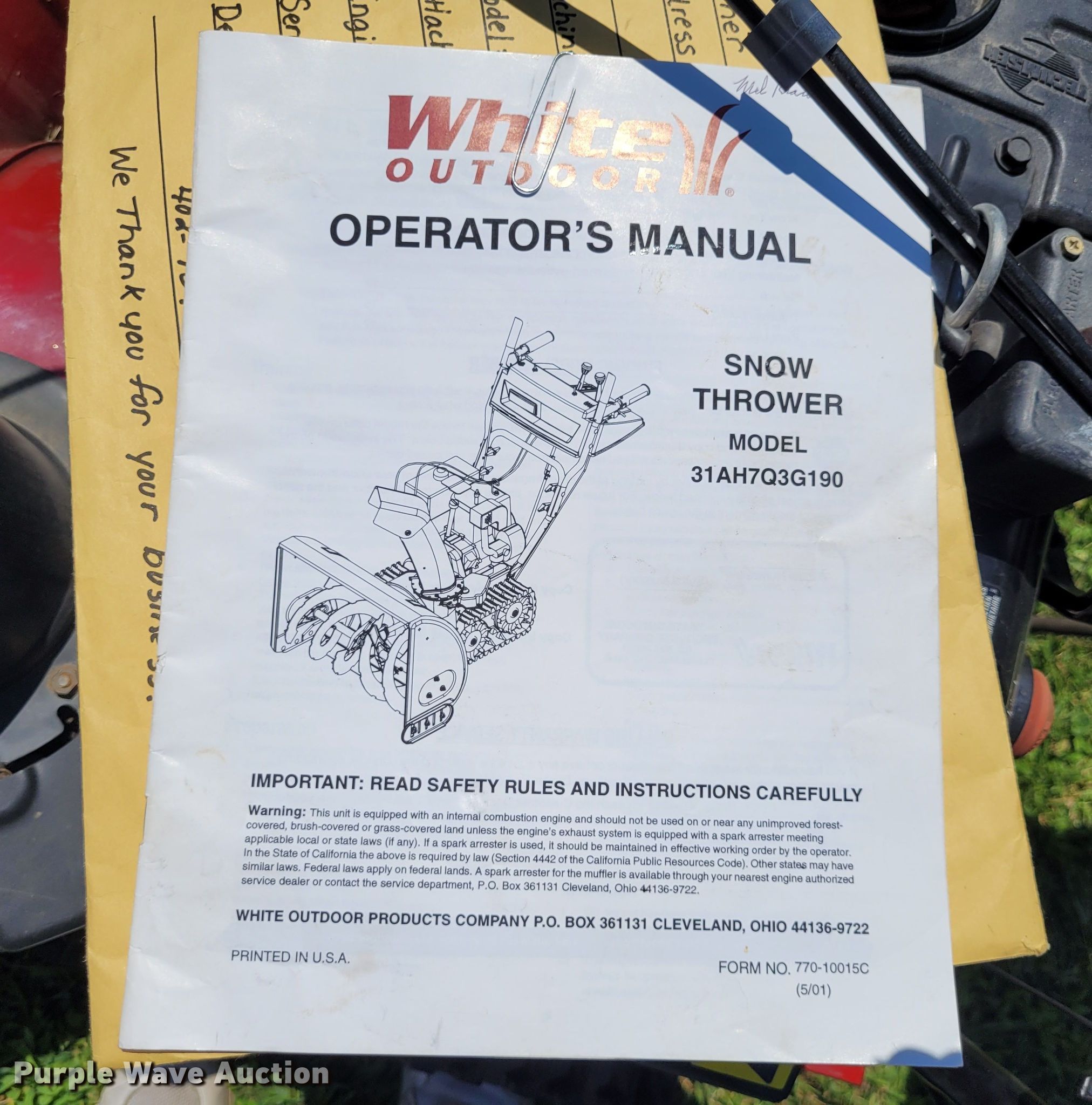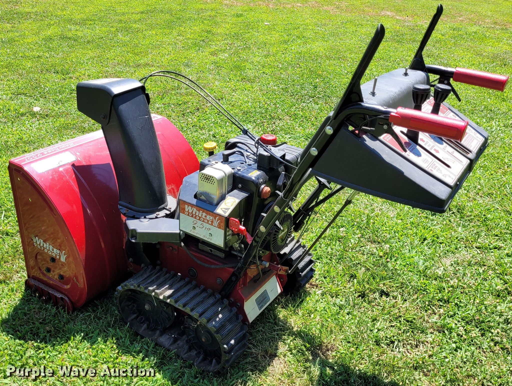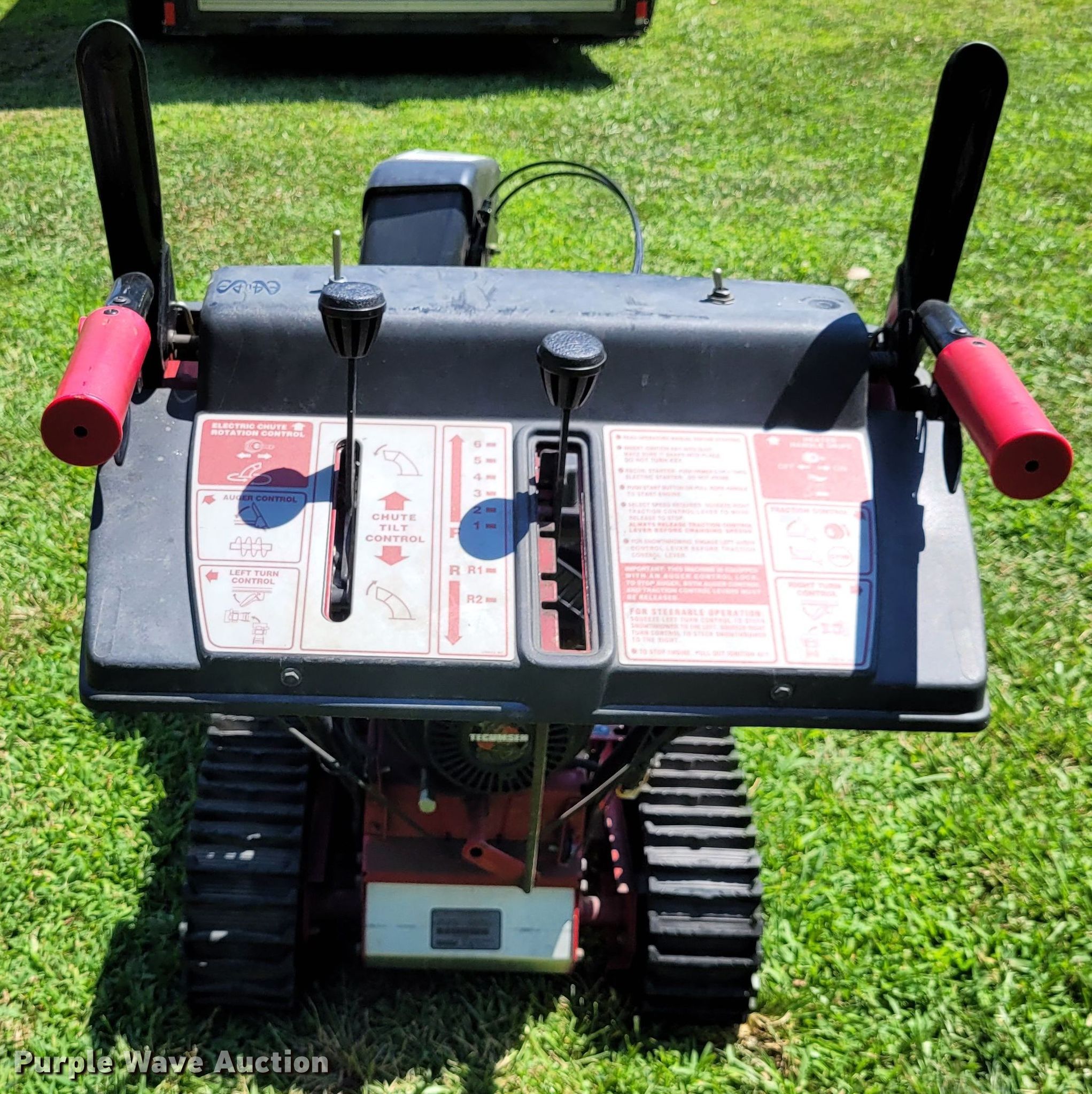 Purple Wave is selling a used Lawn and Garden in Kansas. This item is a White Outdoor 955T snow blower with the following: Serial: 1H071B10257, 28" W, Tecumseh gas engine, 9.5 HP, Electric start, Tracks, Rubber, 5" W