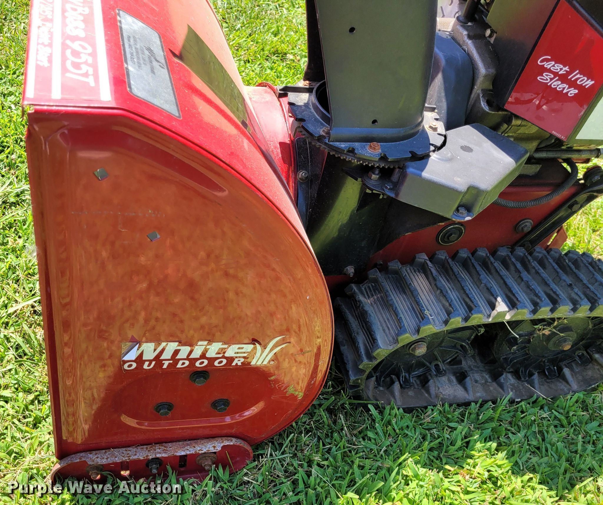 White Outdoor 955T snow blower. Serial: 1H071B10257, 28" W, Tecumseh gas engine 9.5 HP, Electric start, Tracks Rubber, 5" W. Wamego, KS 66547