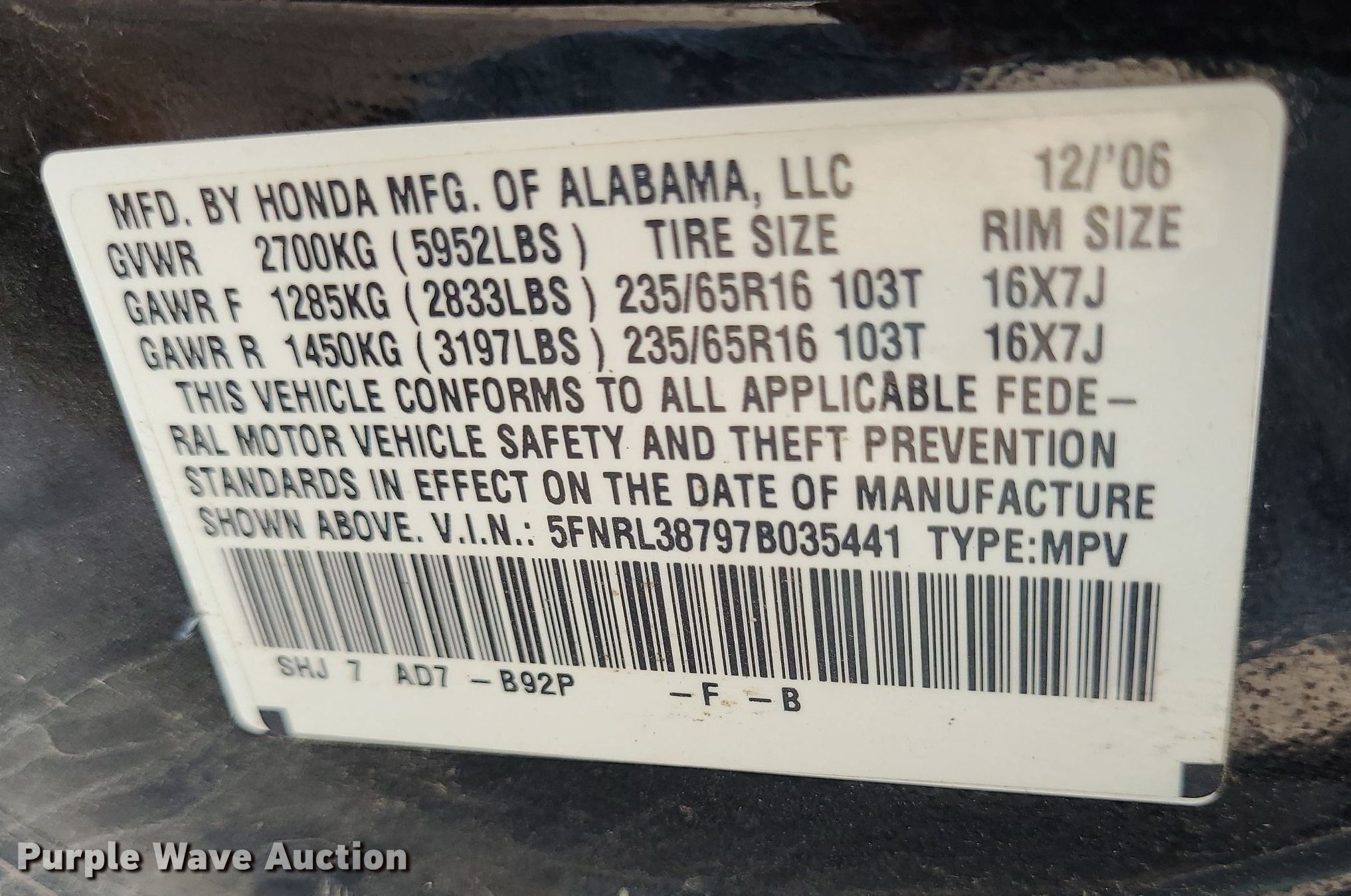 - VIN: 5FNRL38797B035441