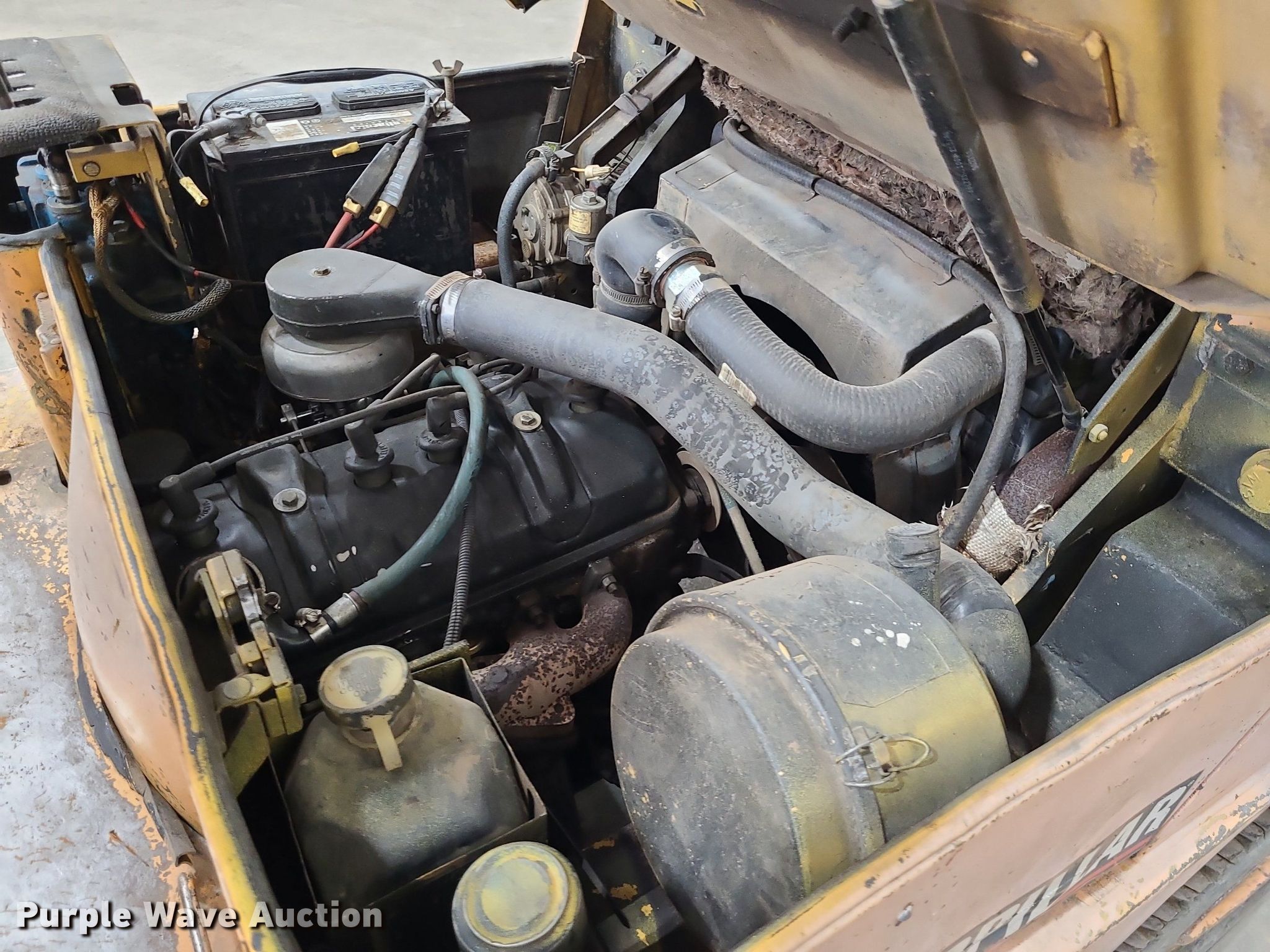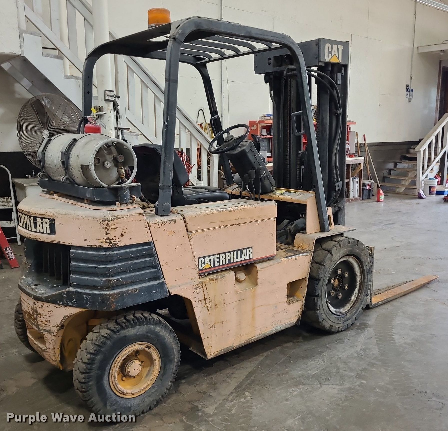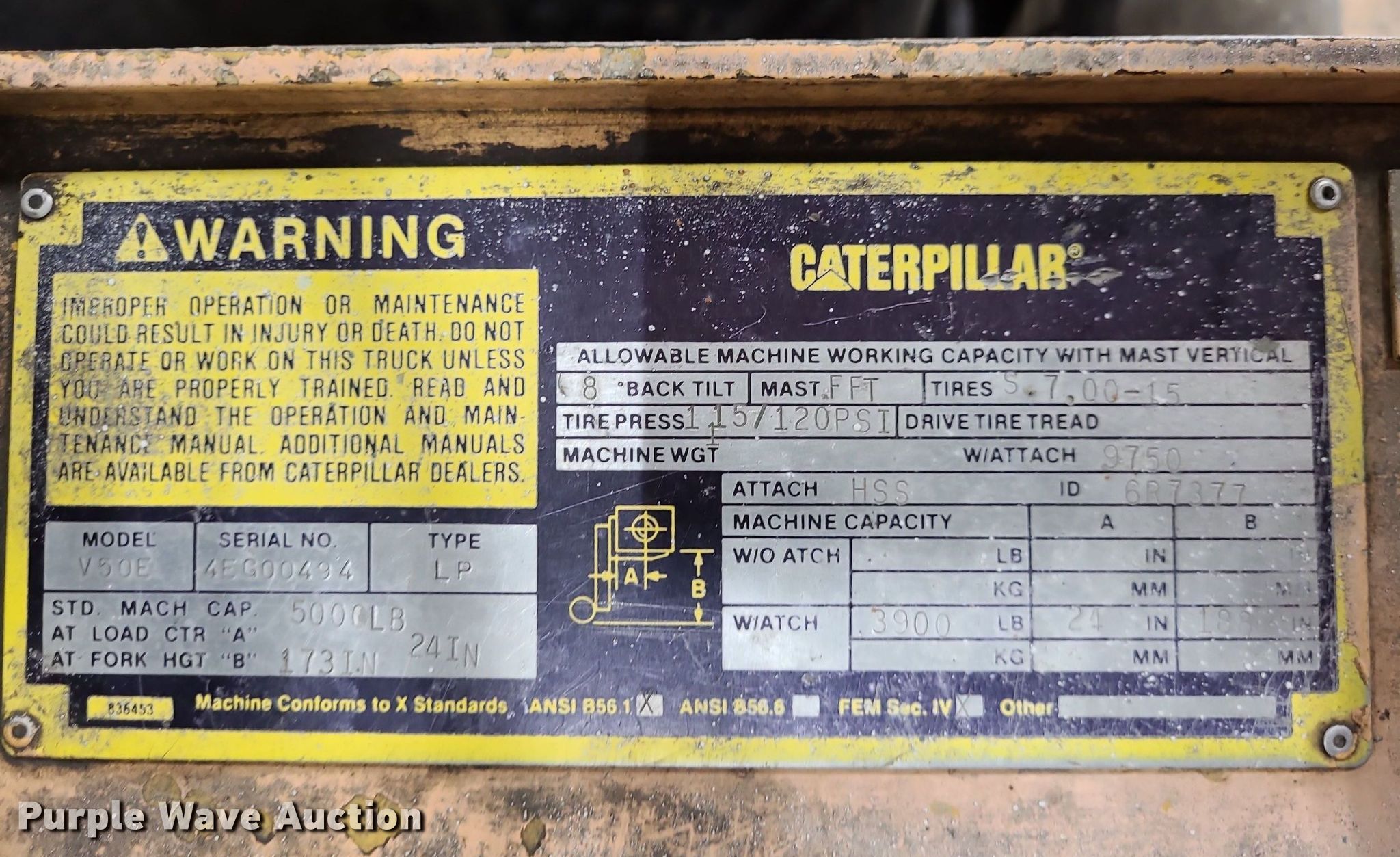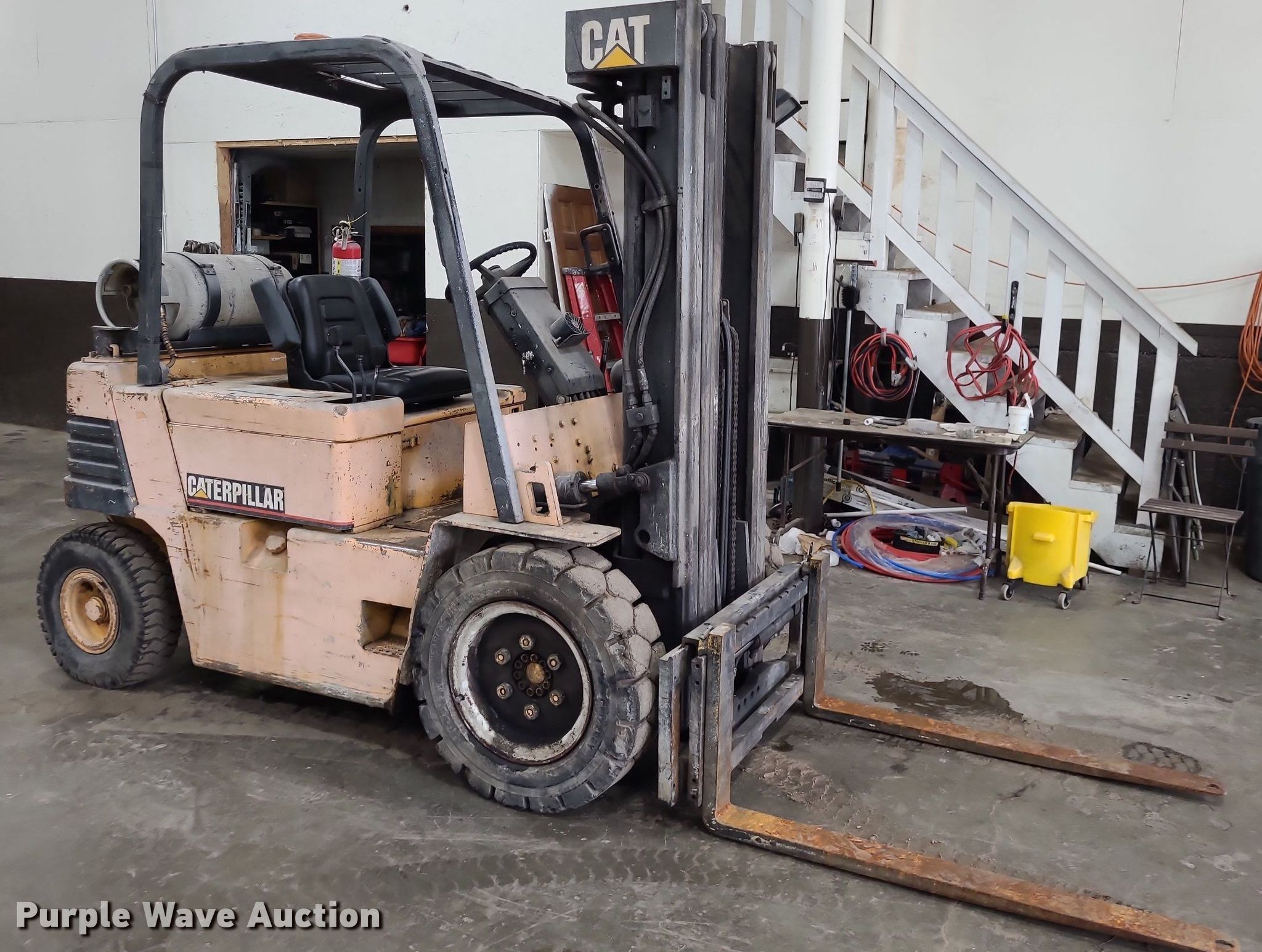 Purple Wave is selling a used Cushion Tire or Pneumatic Forklift in Kansas. This item is a Caterpillar V50E forklift with the following: Serial: 4EG00494