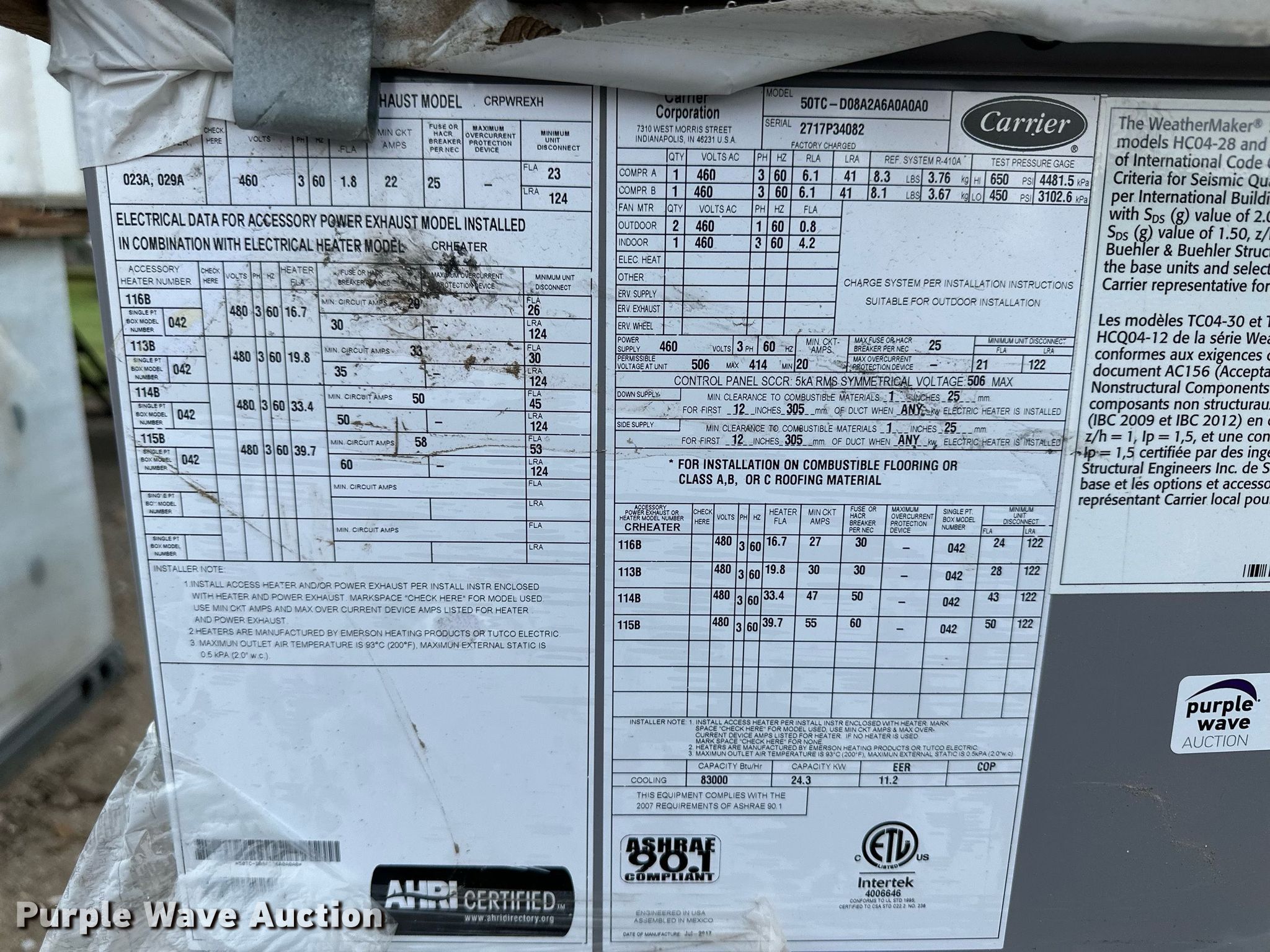 Carrier 50TC air conditioner has sold in Dodge City, Kansas for $632.50. Item NY9222 sold on August 2nd, 2023.