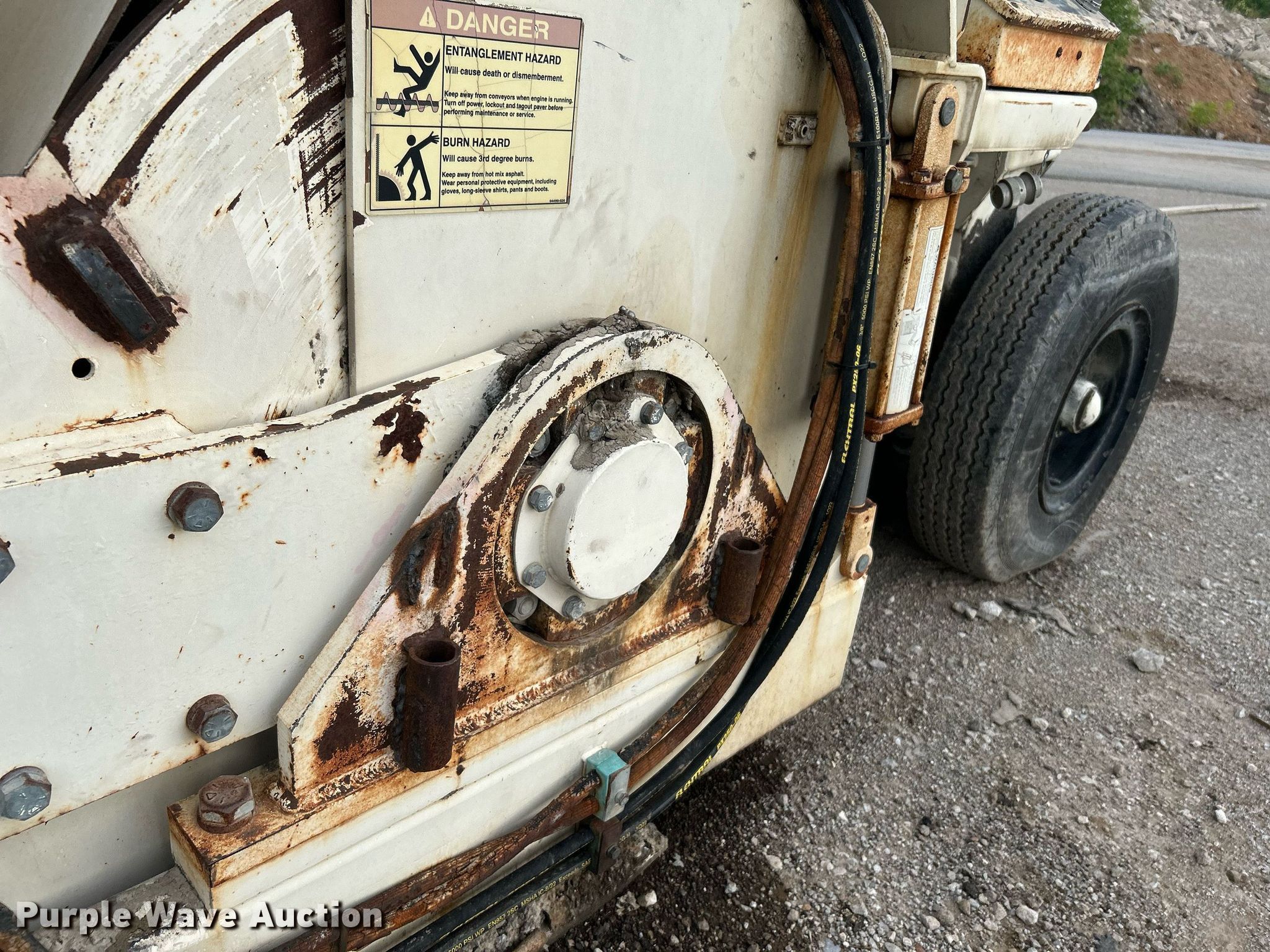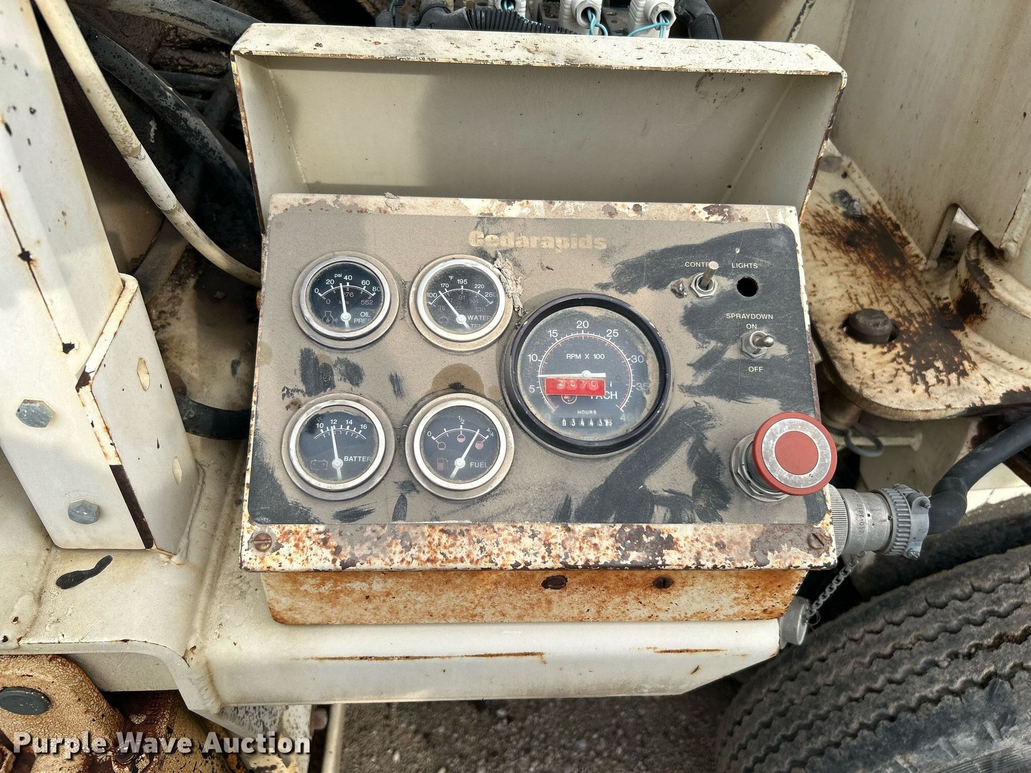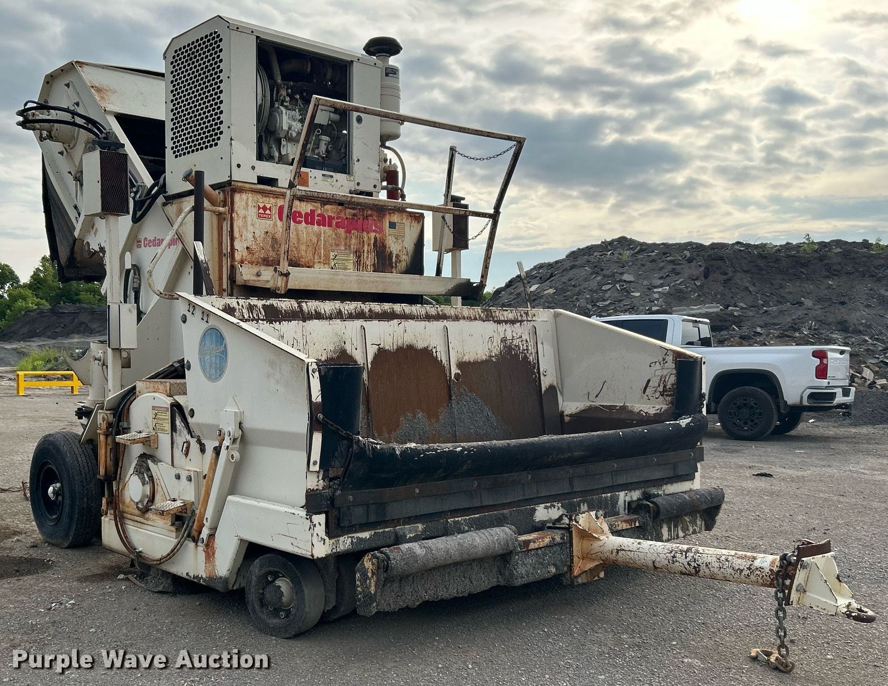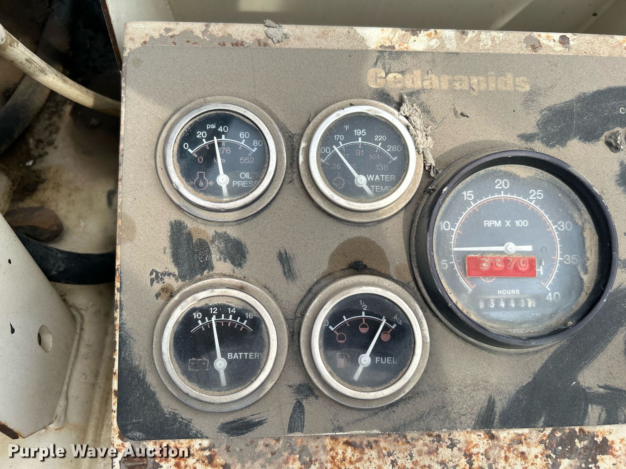 2002 Cedarapids MS-4 shuttle buggy material transfer unit. Hours: 3,444 on meter, Serial: 051362. Engine John Deere 4045T, Cylinders: 4, Fuel type: Diesel. Features Front spread hopper width: 10.5', Material conveyor Width: 60", Truck hitch. Tires Rear: 8.25R15. Becco Contractors Inc. 13737 East 46th Street North. Tulsa, OK 74116