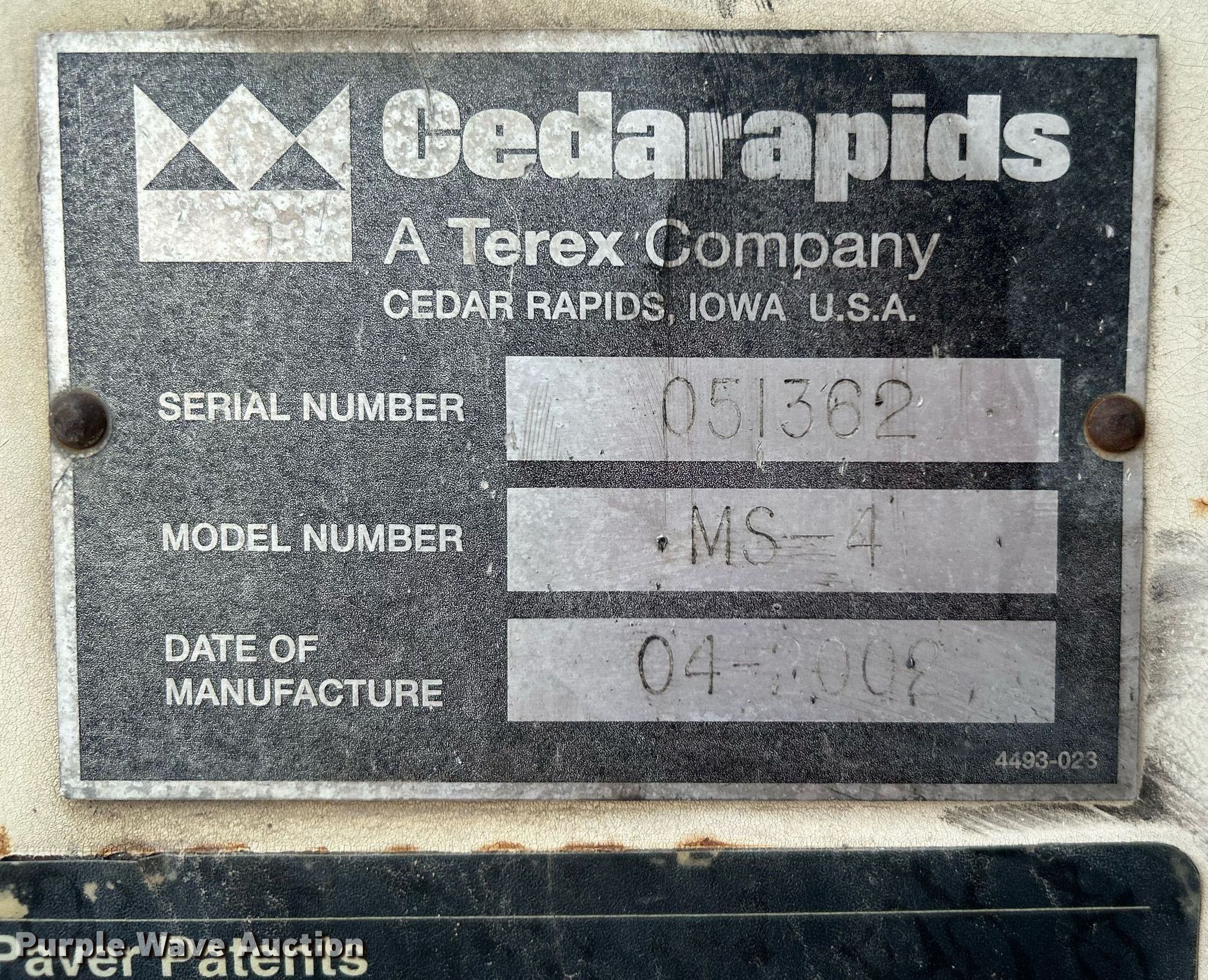 Purple Wave is selling a used Paver or Screed in Oklahoma. This item is a 2002 Cedarapids MS-4 shuttle buggy material transfer unit with the following: Hours: 3,444 on meter, Serial: 051362