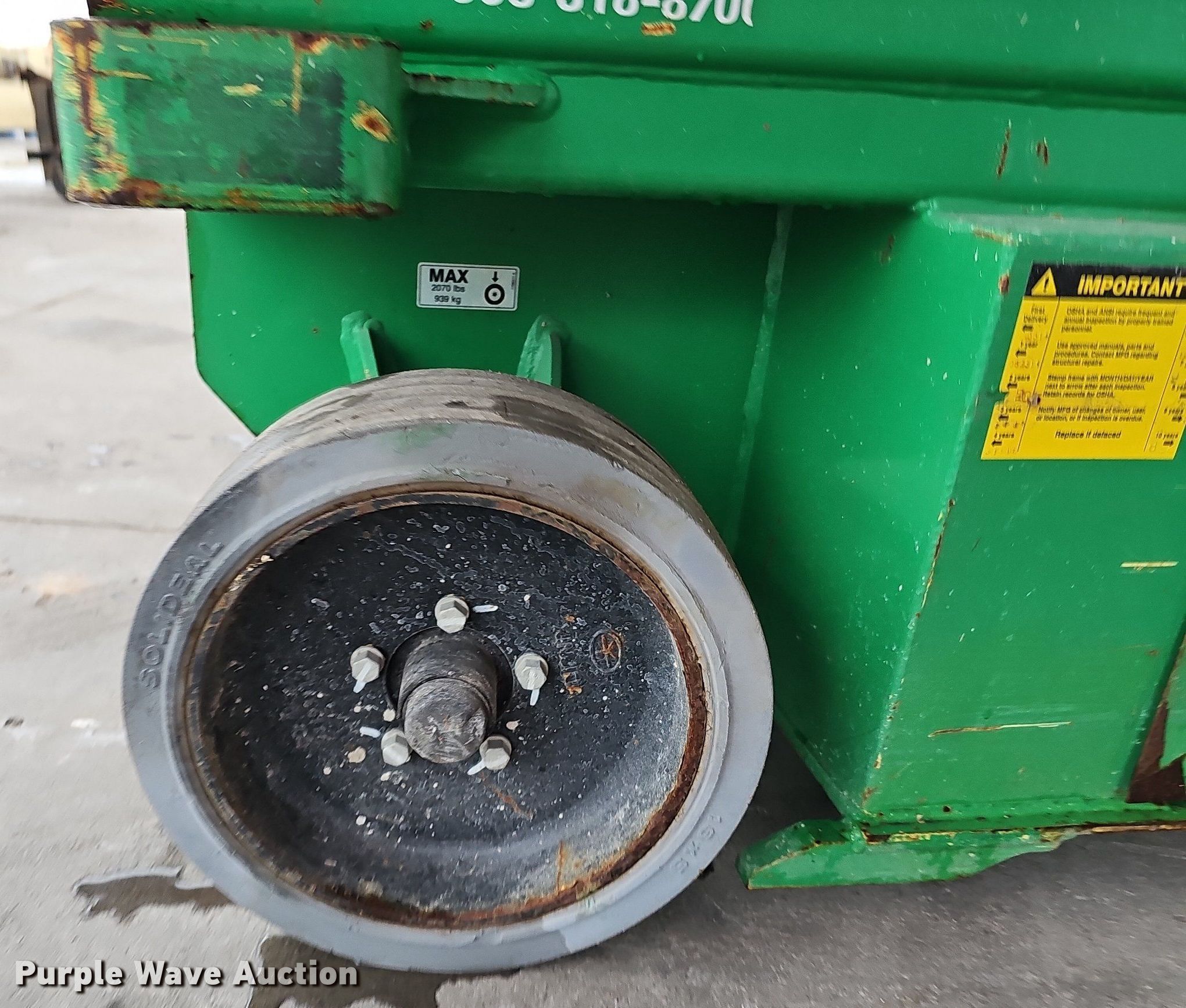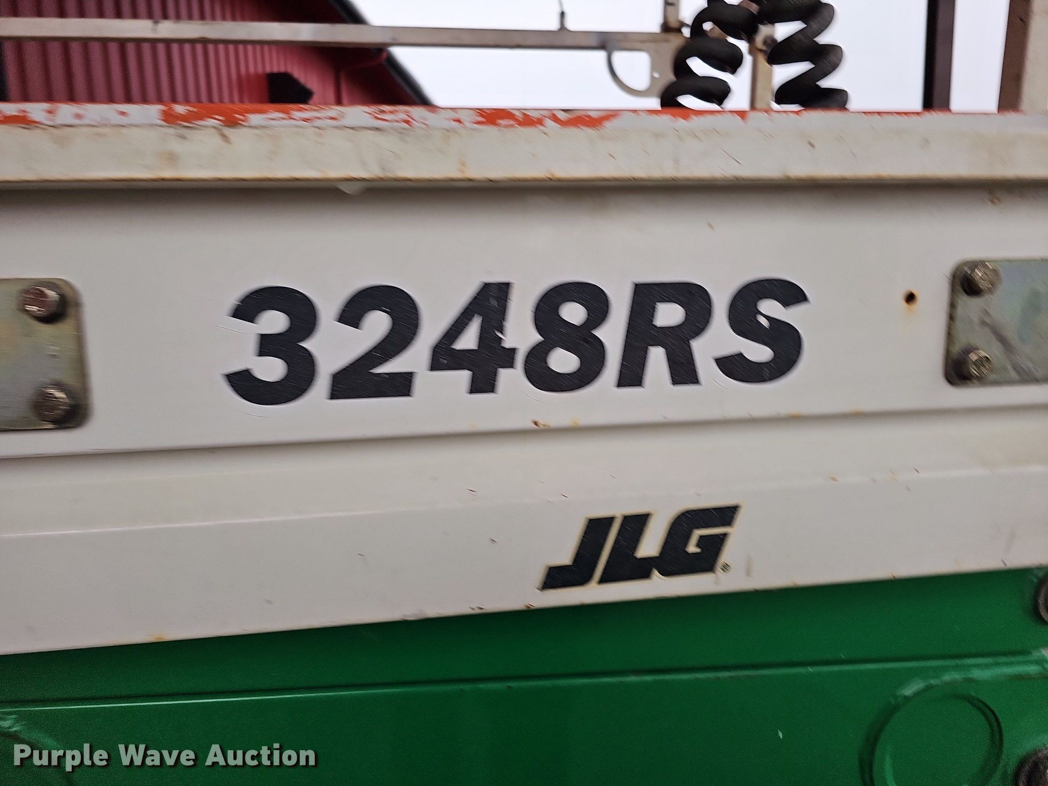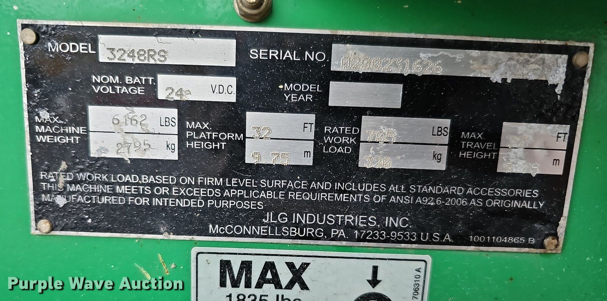 2012 JLG 3248RS scissor lift. Hours: 500 on meter, Serial: 0200231626. Electric Motor Volts: 24. Features Maximum lift capacity: 705 lbs, Maximum lift height: 32', Platform: 120" L x 42" W, AC power outlet, Controls: Remote Control, Ground, Platform extensions: Manual, Safety alarm. Tires Tire size: 16x5, Solid. Notes Manual. Jordan Machinery / S & N Auto Sales. 25050 U.S. 275. Waterloo, NE 68069