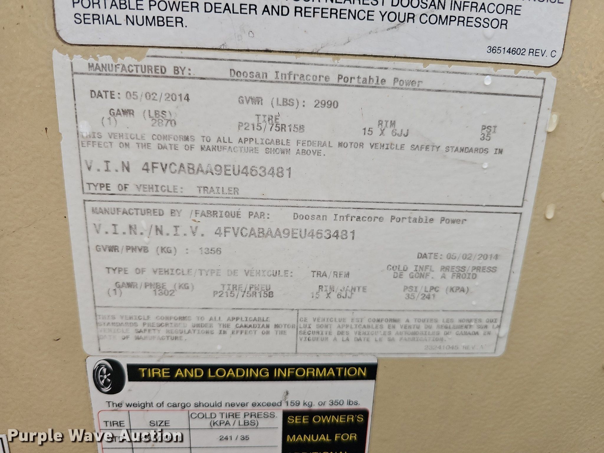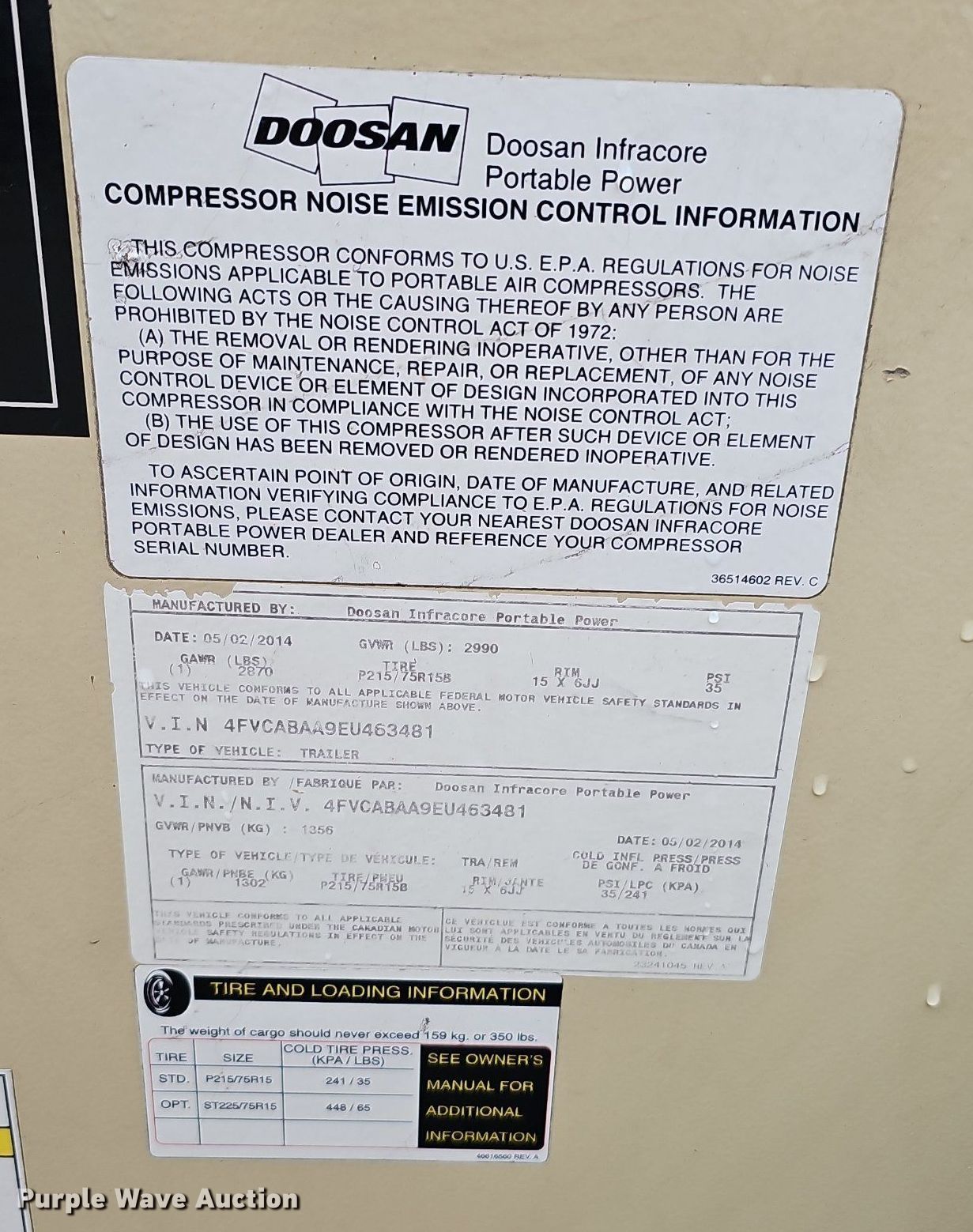 Purple Wave is selling a used Air Compressor in Nebraska. This item is a 2014 Doosan P185WDZ-T4F air compressor with the following: Hours: 272 on meter, VIN: 4FVCABAA9EU463481, Serial: 463481UEYF24
