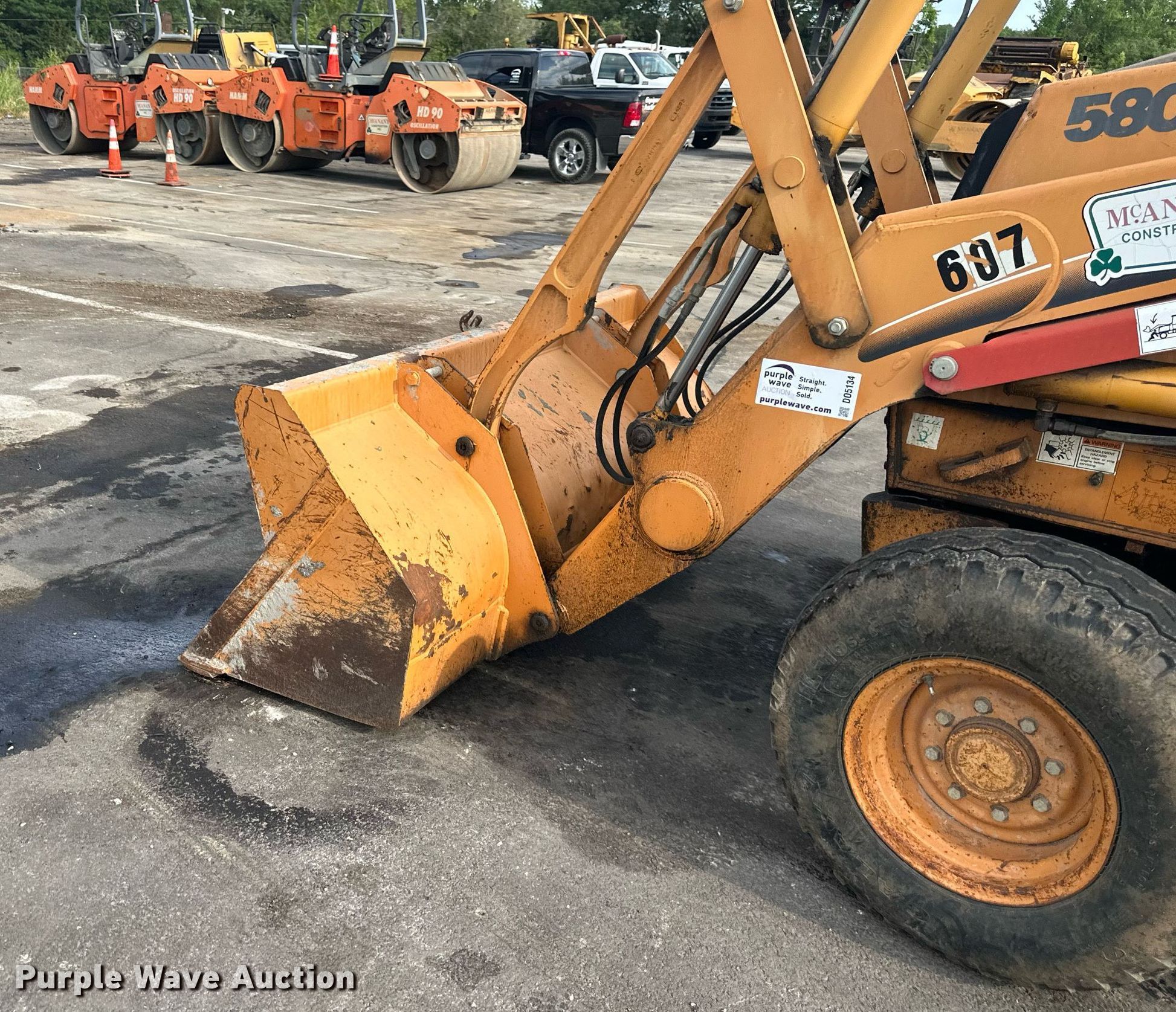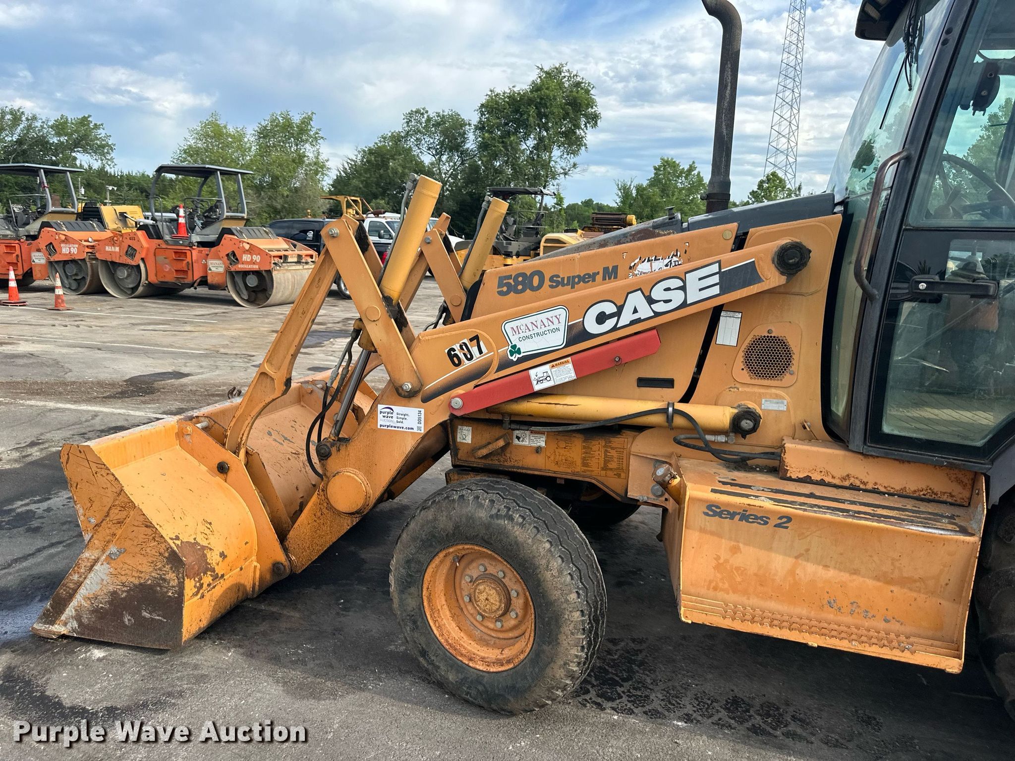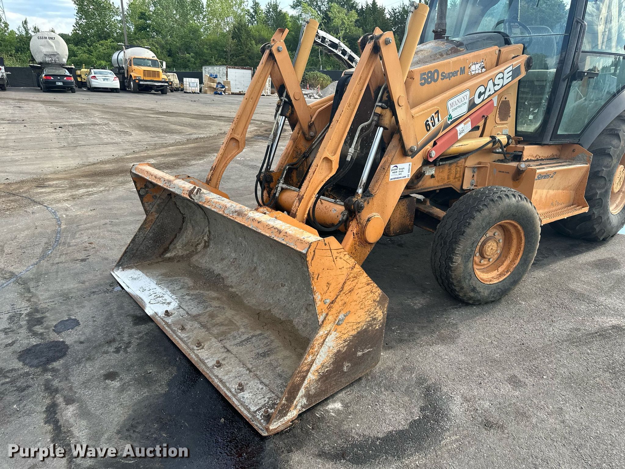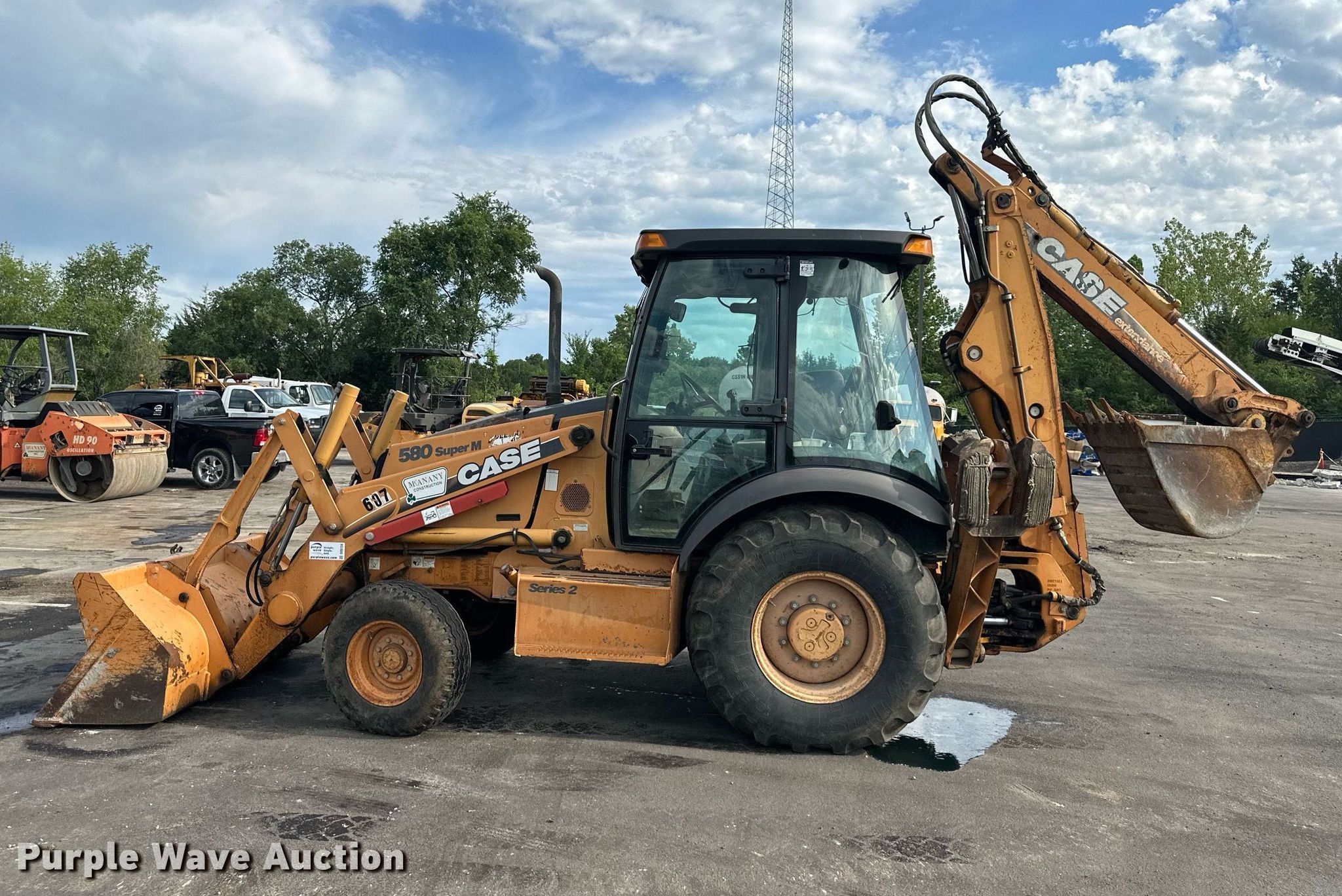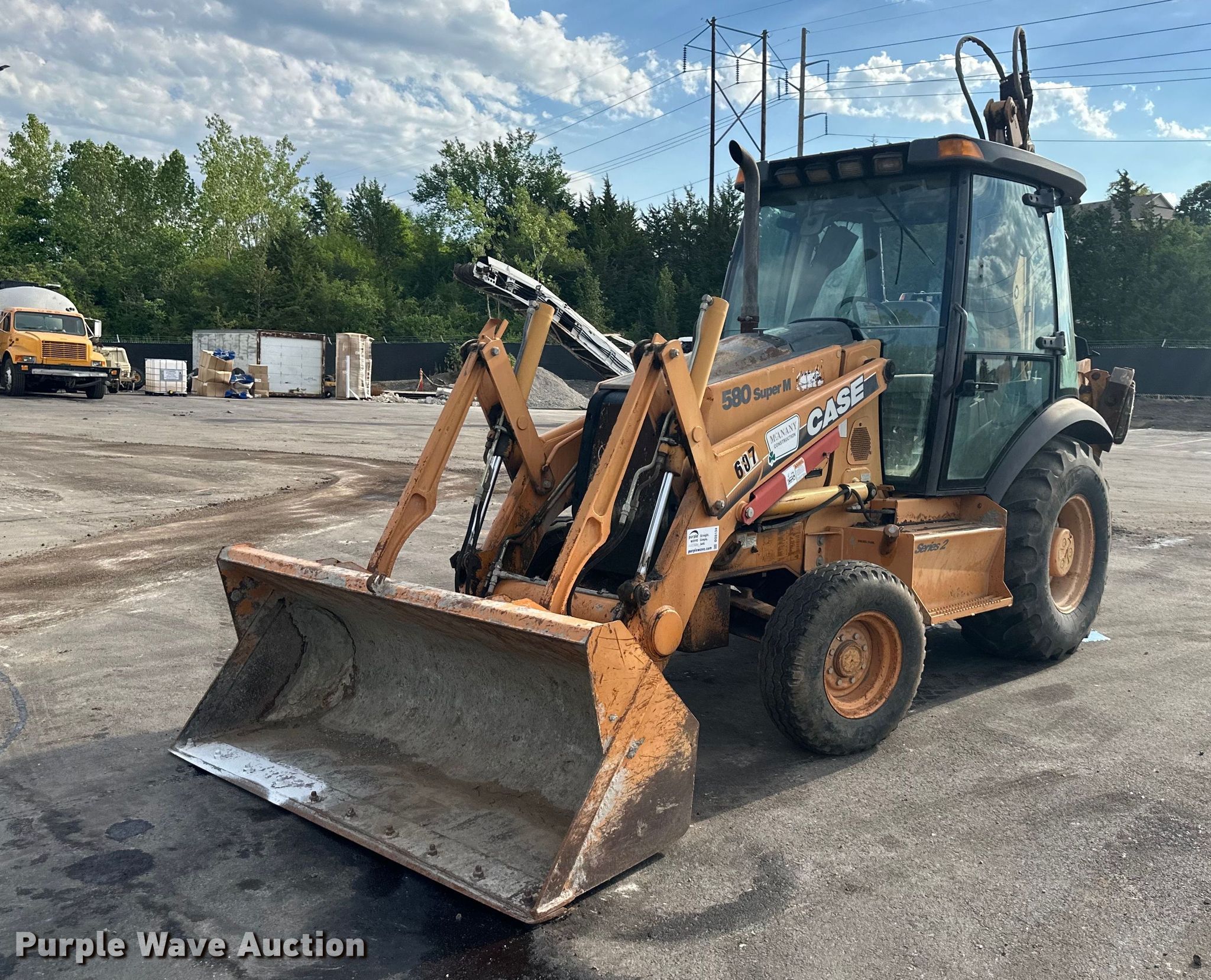2004 Case 580 Super M backhoe. Hours: 7,594 on meter, Serial: N4C305239. Engine Cummins, Cylinders: 4, Fuel type: Diesel. Transmission Powershift, 4F - 4R. Operators station Enclosed cab, AC, Heat, Backhoe controls: Four stick Foot control. Features Loader Bucket Width: 82", Cutting edge: Bolt-on, Backhoe Extendable stick, Bucket Width: 24", Cutting edge: Weld-on, Teeth: 5.. Tires Front: 11L-16, Rear: 19.5L-24. Notes Hydraulic leak. McAnany Construction Inc.. 15320 Midland Drive. Shawnee, KS 66217