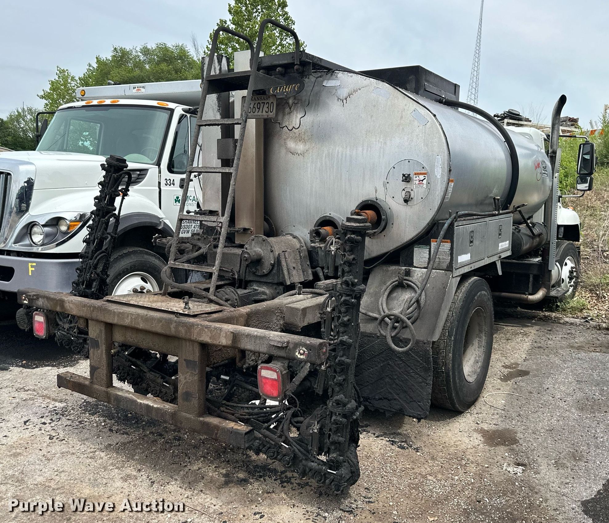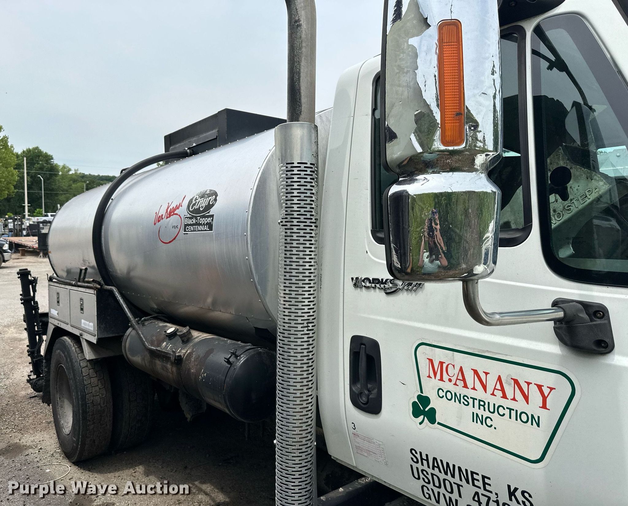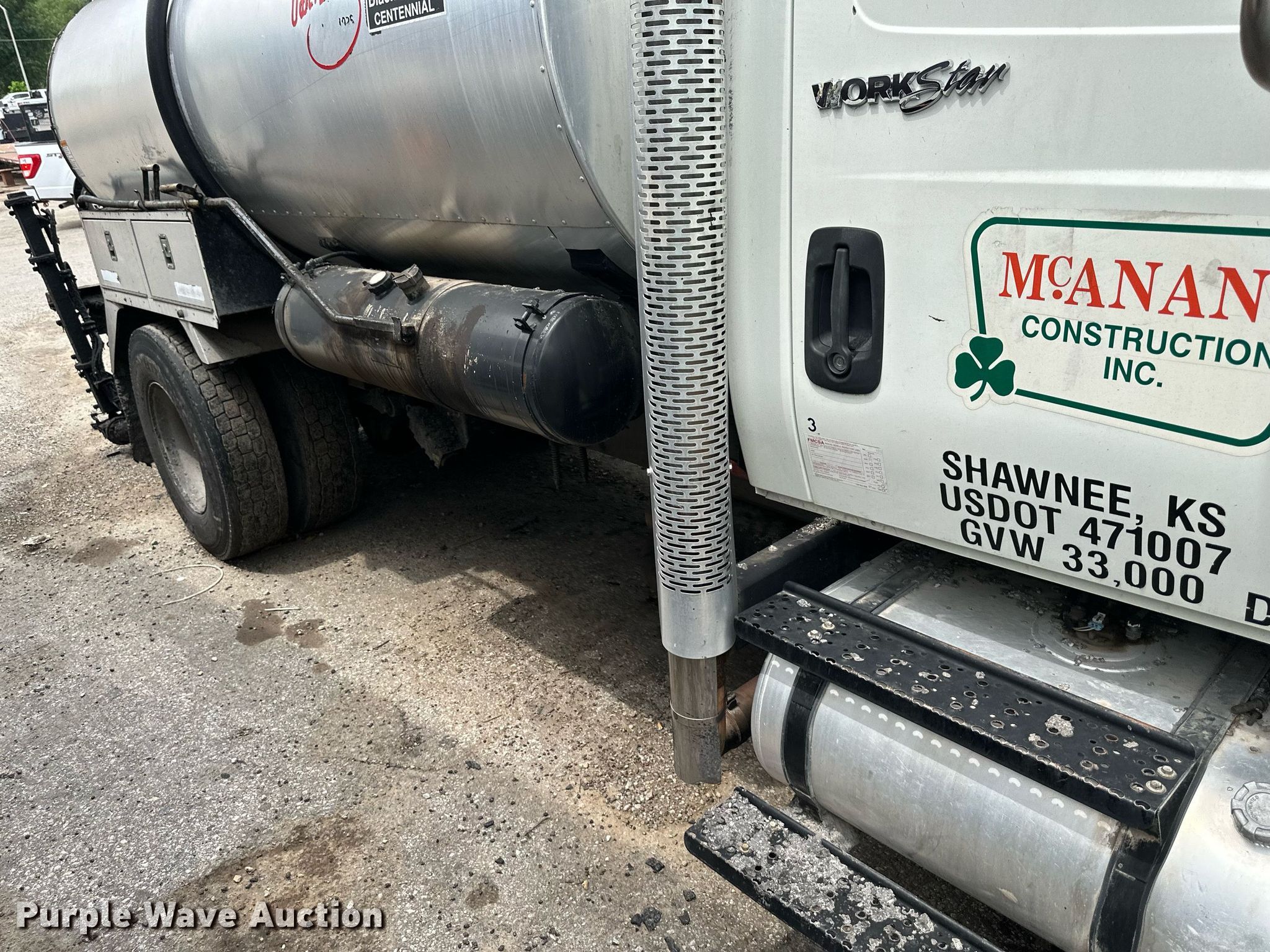 2013 International WorkStar 7300 oil distributor truck. Miles: 72,042 on odometer, Hours: 10,032 on meter, VIN: 1HTZZAAN5DJ120389. Engine International MaxxForce DT, Displacement: 7.6L, Cylinders: 6, Fuel type: Diesel. Transmission Eaton Fuller, Manual. Chassis Axles: Single, Suspension: Spring, Brakes: Air, PTO. Interior AC, Heat. Features Bed / tank Entyre Black topper centennial, Capacity: 2,000 gallons, 11' 6" L x 96" W, Burner: LPG, In-cab controls, Spray wand, Spray boom Width: 16', Folding, Side shift, Nozzles: 48.. Tires Size: 11R22.5. Notes Non-operational engine, Non-operational unit. Kansas title. Title distribution may be delayed up to 14 days from verification of funds. McAnany Construction Inc.. 15320 Midland Drive. Shawnee, KS 66217