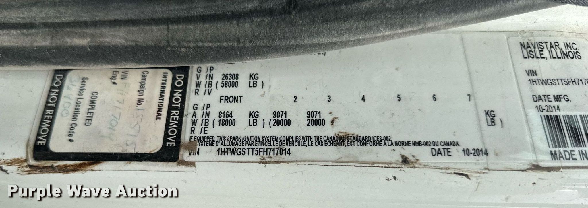 2015 International WorkStar 7400 dump truck. Miles: 75,585 on odometer, Hours: 5,623 on meter, VIN: 1HTWGSTT5FH717014. Engine International N9, Displacement: 9.3L, Cylinders: 6, Fuel type: Diesel. Transmission Eaton Fuller, Manual, Speed: 10. Chassis Axles: Tandem, Differential lock: Inter-axle, Suspension: Spring over walking beam, Brakes: Air, PTO. Interior AC, Heat. Features Dump bed 14' L x 96" W, Side height: 48", Bed type: Steel, Barrel, Ram: Single , End gate: Air operated. Tires Front: 315/80R22.5, Rear: 11R22.5. Notes Non-operational engine , Non-operational unit. Kansas title. Mileage has not been verified. Odometer discrepancy will be marked on the title. Title distribution may be delayed up to 14 days from verification of funds. McAnany Construction Inc.. 15320 Midland Drive. Shawnee, KS 66217