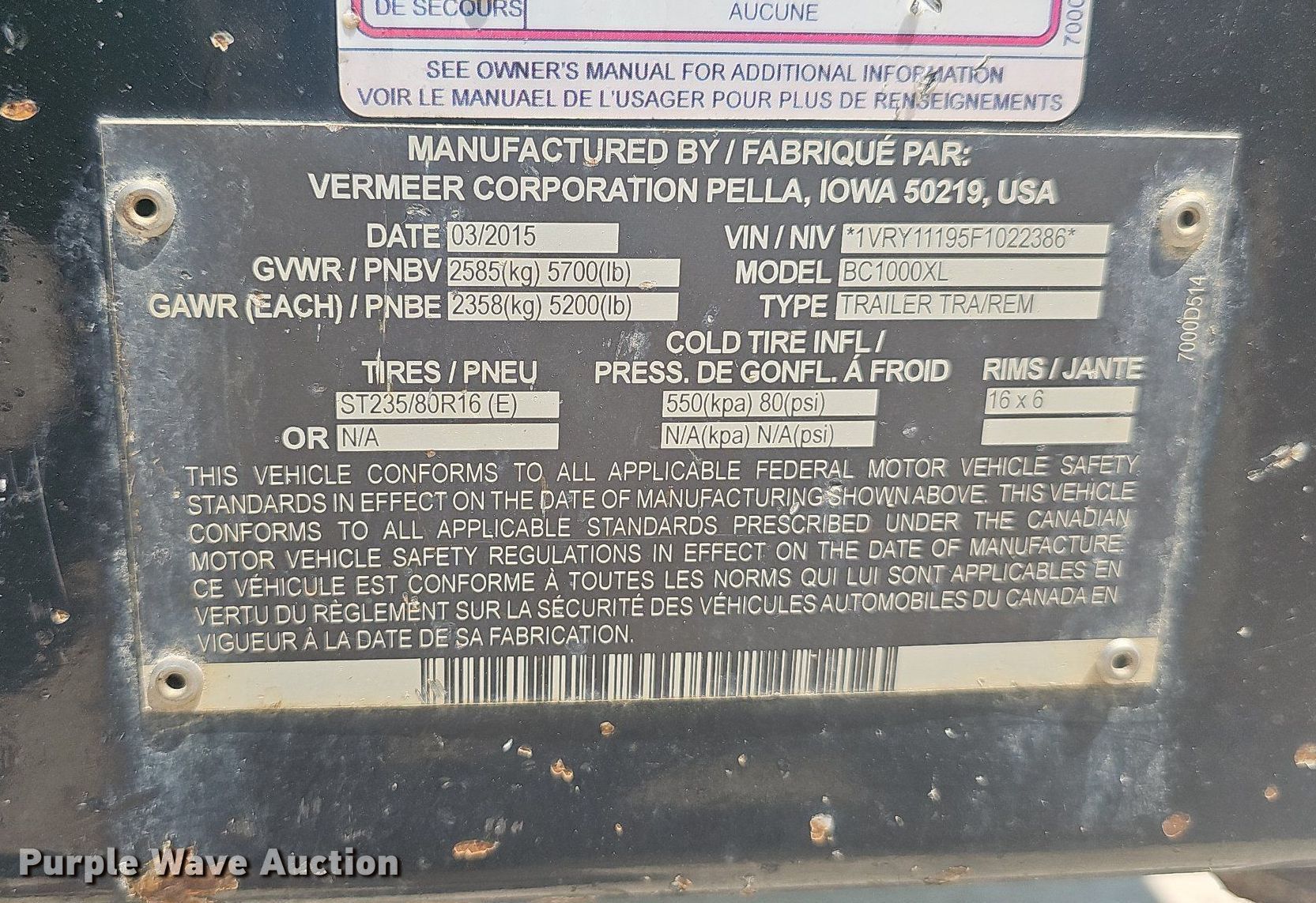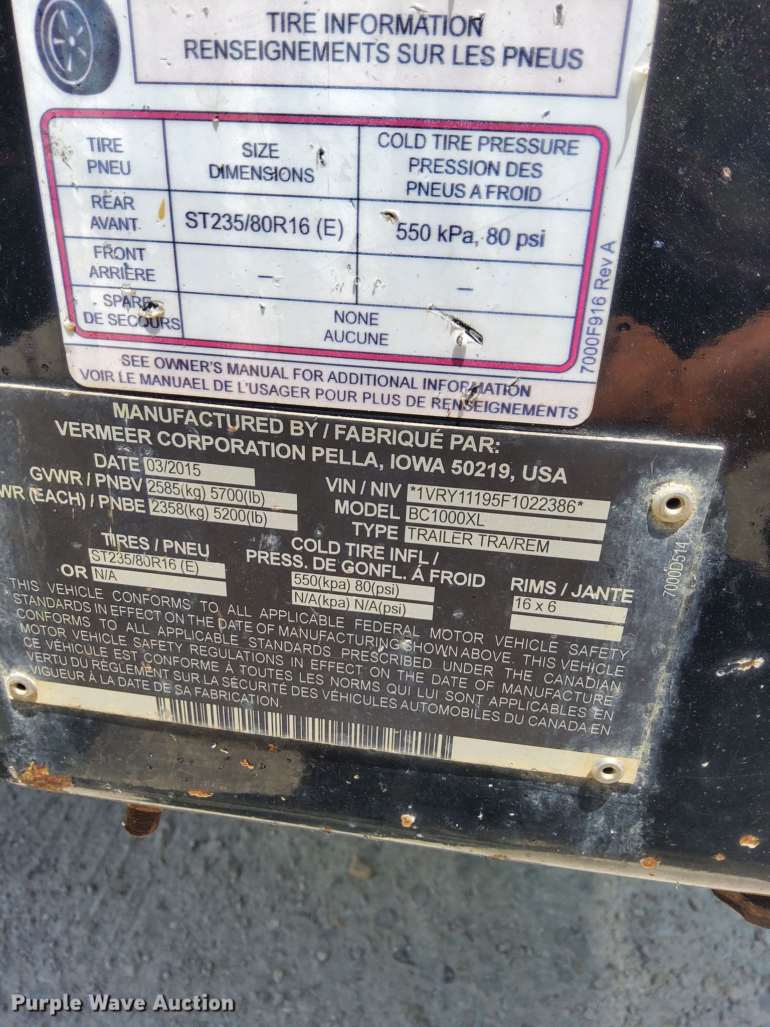 2015 Vermeer BC1000XL wood chipper. Hours: 1,314 on meter, VIN: 1VRY11195F1022386. Engine Displacement: 3.0L, Cylinders: 4, Fuel type: Gas. Features Capacity: 12", Throat opening: 20" x 21". Trailer Ball hitch size: 2 5/16", Brakes: Electric, Axles: Single, Tire size: 235/80R16. Transfer of ownership documentation will be a bill of sale. Barth Equipment. 3562 East Farm Road 88. Springfield, MO 65803