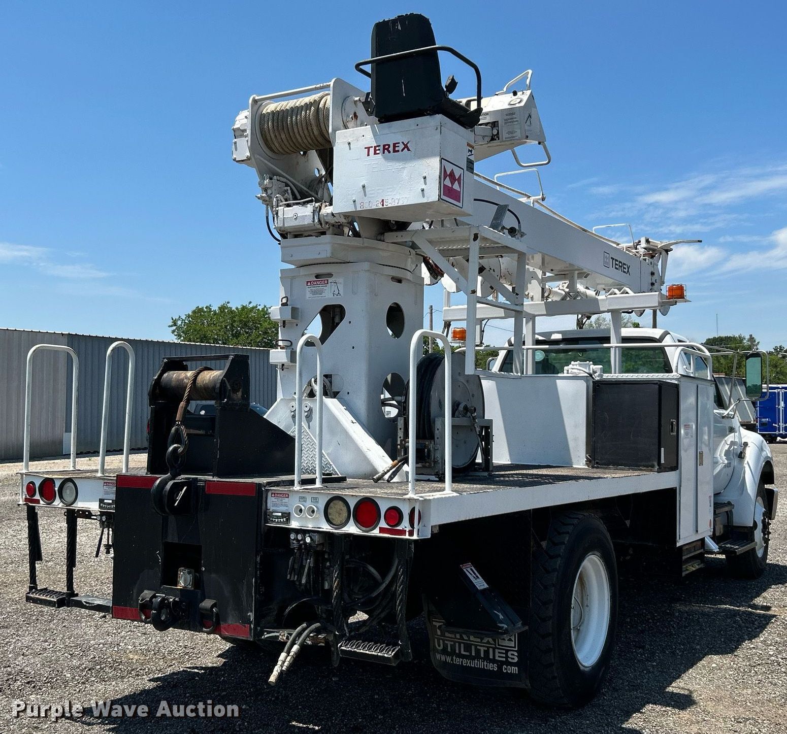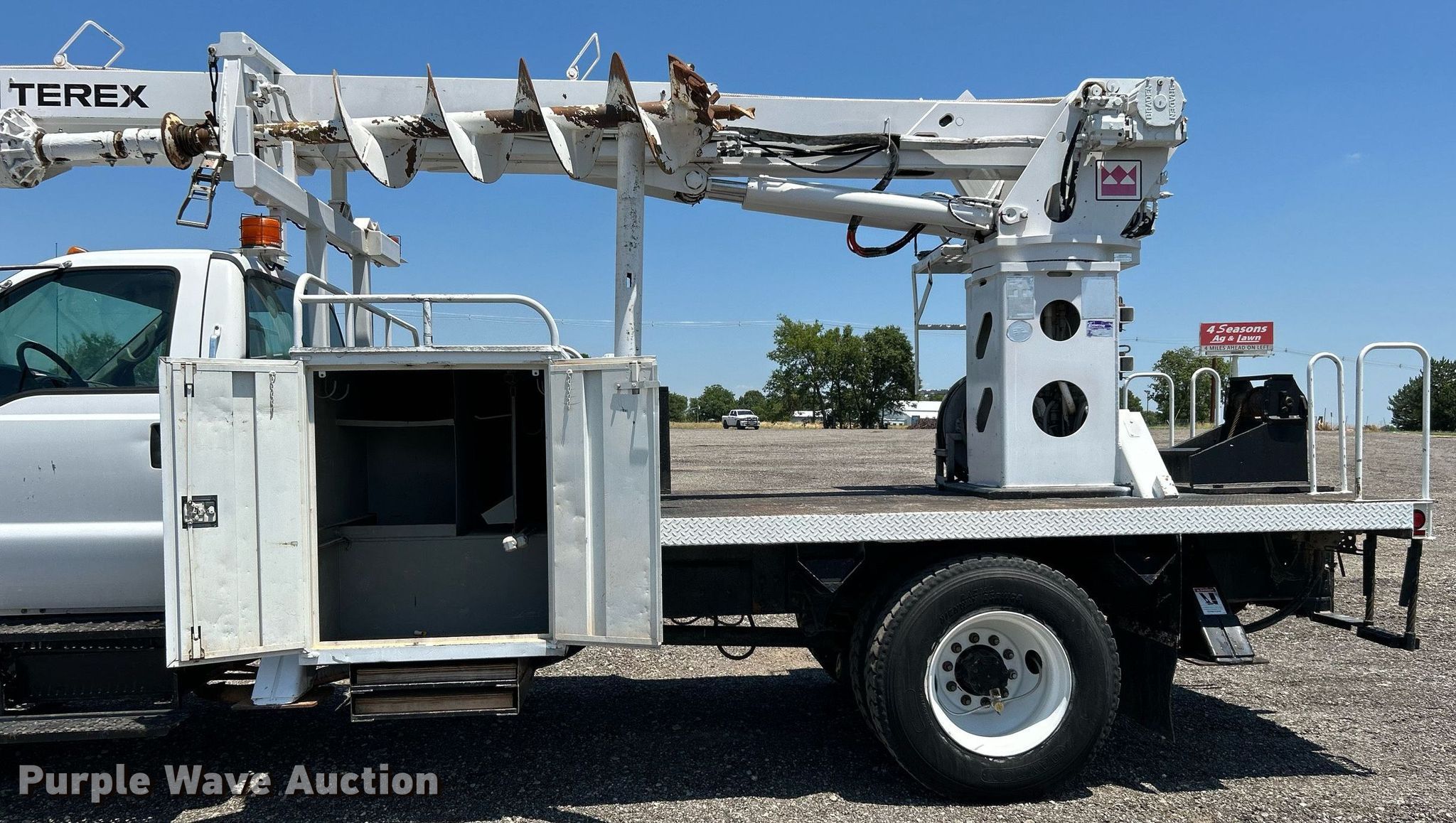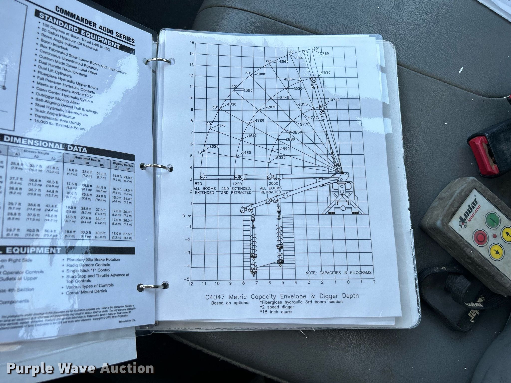 2007 Ford F750 digger derrick truck. Miles: 78,923 on odometer, Hours: 4,750 on meter, VIN: 3FRXF75T17V418631. Engine Caterpillar C7, Serial: WAX32570, Displacement: 7.2L, Cylinders: 6, Fuel type: Diesel, HP: 250. Transmission Automatic. Chassis Axles: Single, Suspension: Spring, Brakes: Air, PTO, GVWR: 33,000 lbs, Wheelbase: 194". Interior AC, Heat, Cruise control, Brake controller. Features Bed 12' L x 95" W, Boom 2007 Terex Commander C4047, Serial: 2070634344, Maximum lift capacity: 24,750 lbs, Maximum lift height: 47', Boom type: Insulated, Telescopic, Boom controls Platform/ basket, Material handler, Pole guide, Auger Diameter: 20".. Tires Size: 11R22.5. Oklahoma title. 15107 North 137th East Avenue. Collinsville, OK 74021