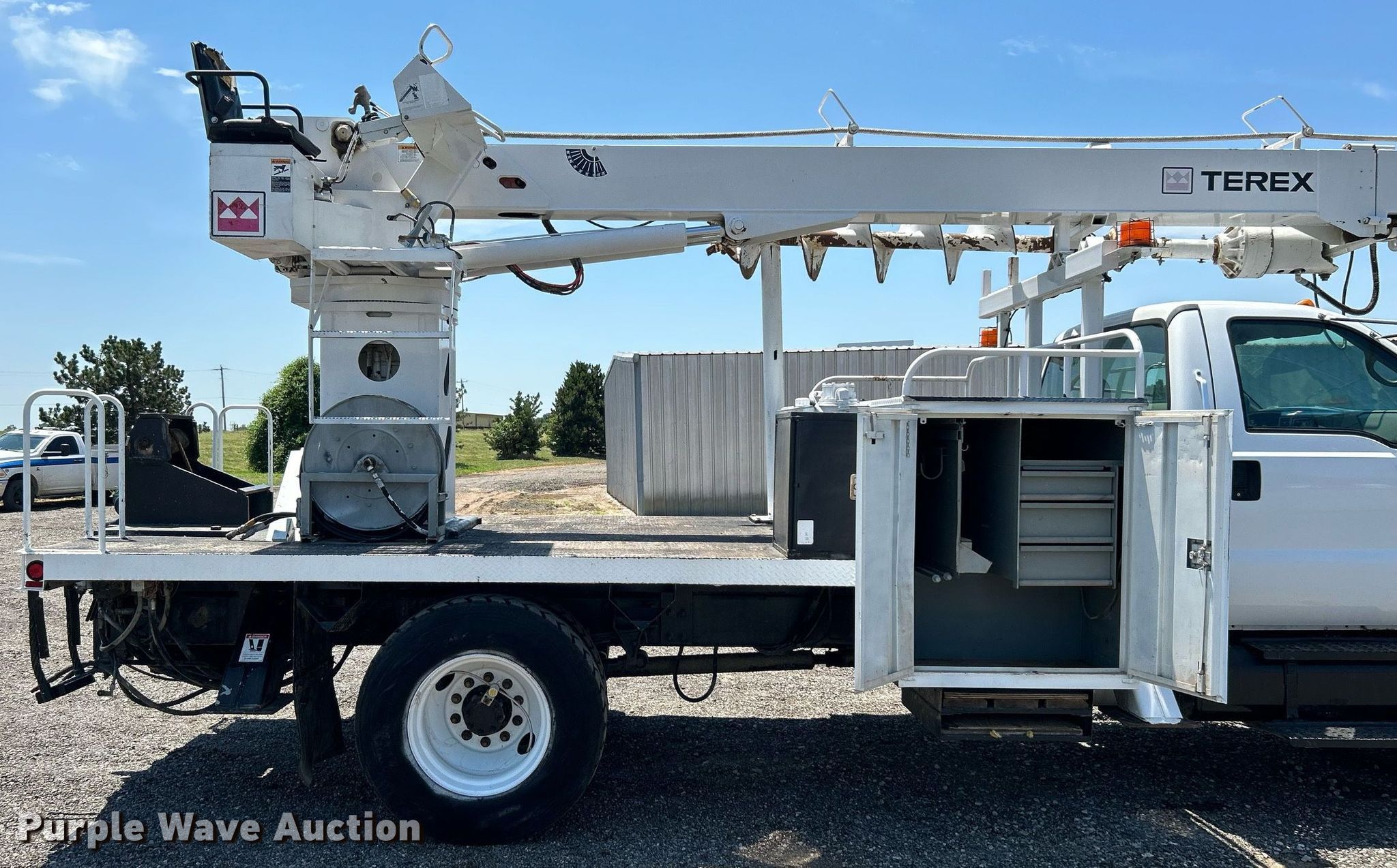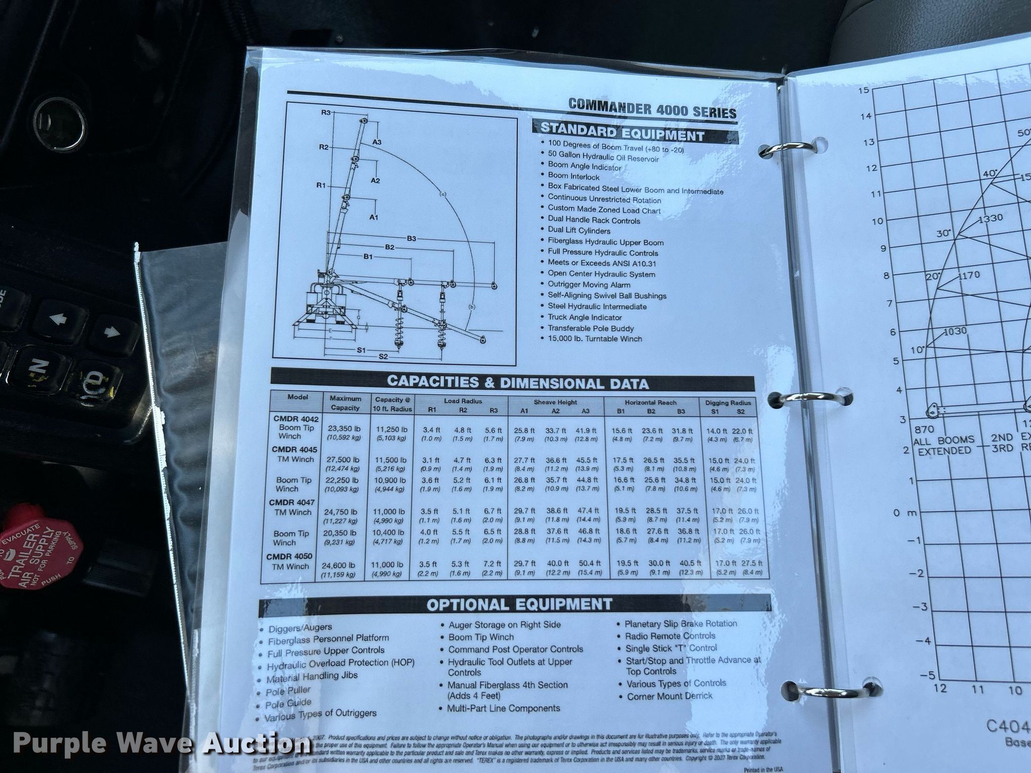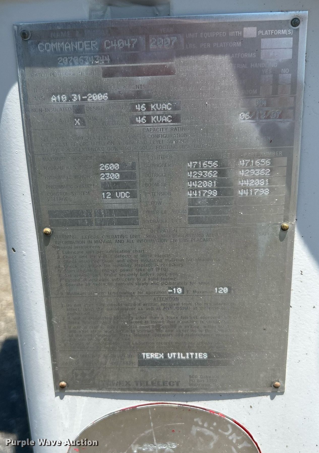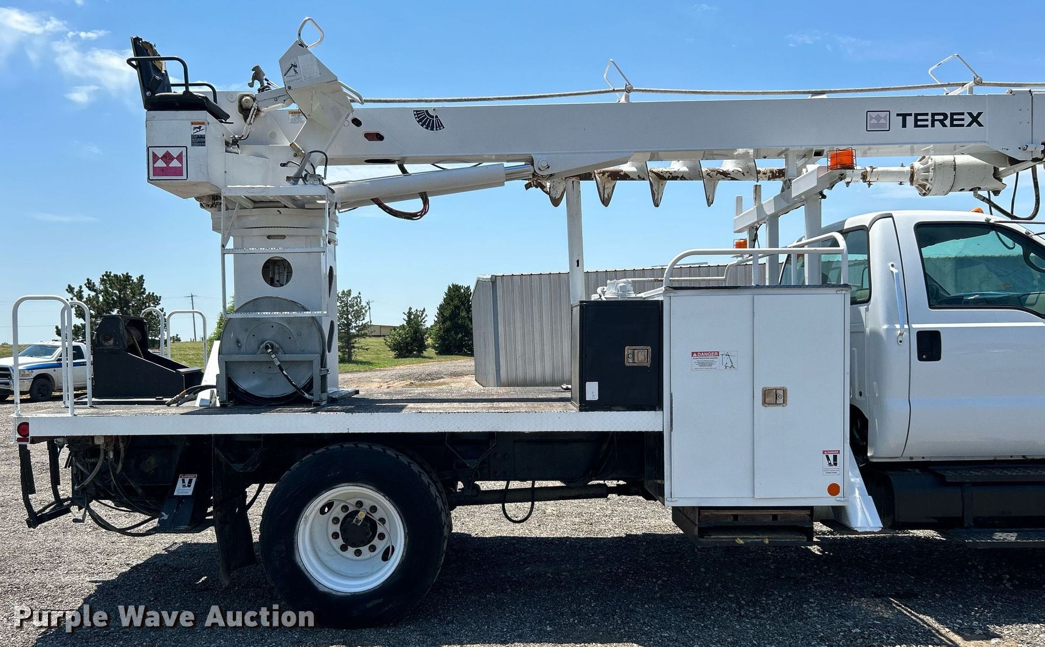 2007 Ford F750 digger derrick truck. Miles: 78,923 on odometer, Hours: 4,750 on meter, VIN: 3FRXF75T17V418631. Engine Caterpillar C7, Serial: WAX32570, Displacement: 7.2L, Cylinders: 6, Fuel type: Diesel, HP: 250. Transmission Automatic. Chassis Axles: Single, Suspension: Spring, Brakes: Air, PTO, GVWR: 33,000 lbs, Wheelbase: 194". Interior AC, Heat, Cruise control, Brake controller. Features Bed 12' L x 95" W, Boom 2007 Terex Commander C4047, Serial: 2070634344, Maximum lift capacity: 24,750 lbs, Maximum lift height: 47', Boom type: Insulated, Telescopic, Boom controls Platform/ basket, Material handler, Pole guide, Auger Diameter: 20".. Tires Size: 11R22.5. Oklahoma title. 15107 North 137th East Avenue. Collinsville, OK 74021
