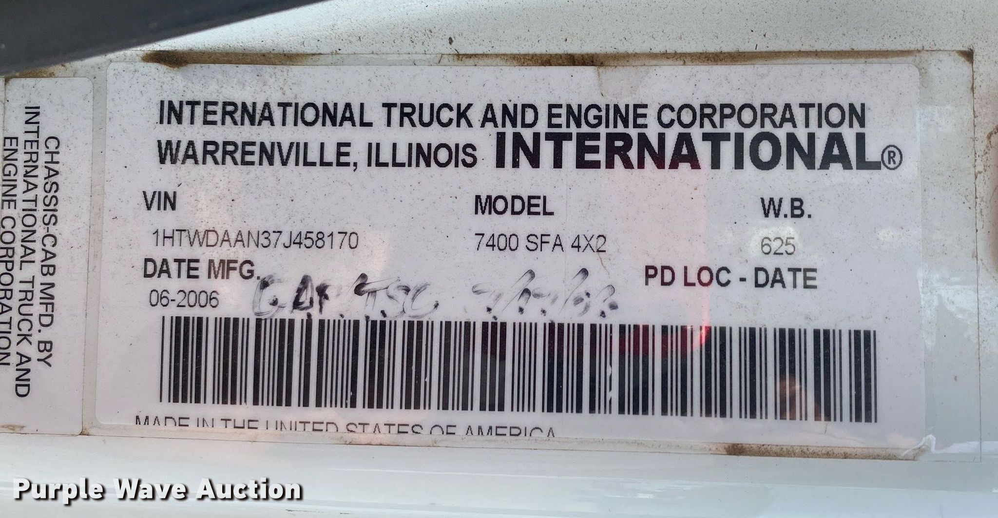 2007 International 7400 vacuum truck. Miles: 76,642 on odometer, Hours: 9,150 on meter, VIN: 1HTWDAAN37J458170. Engine International DT466, Displacement: 7.6L, Cylinders: 6, Fuel type: Diesel. Transmission Automatic. Chassis Axles: Single, Suspension: Spring, Brakes: Air. Interior AC, Heat, Cruise control. Features Tank bed Ramvac HX-6, Water pump Hours: 2331, Vacuum pump, Water heater, Hose reel Telescopic boom Diameter: 6", Length: 18'.. Tires Size: 11R22.5. Oklahoma title. Title distribution may be delayed up to 14 days from verification of funds. 15107 North 137th East Avenue. Collinsville, OK 74021