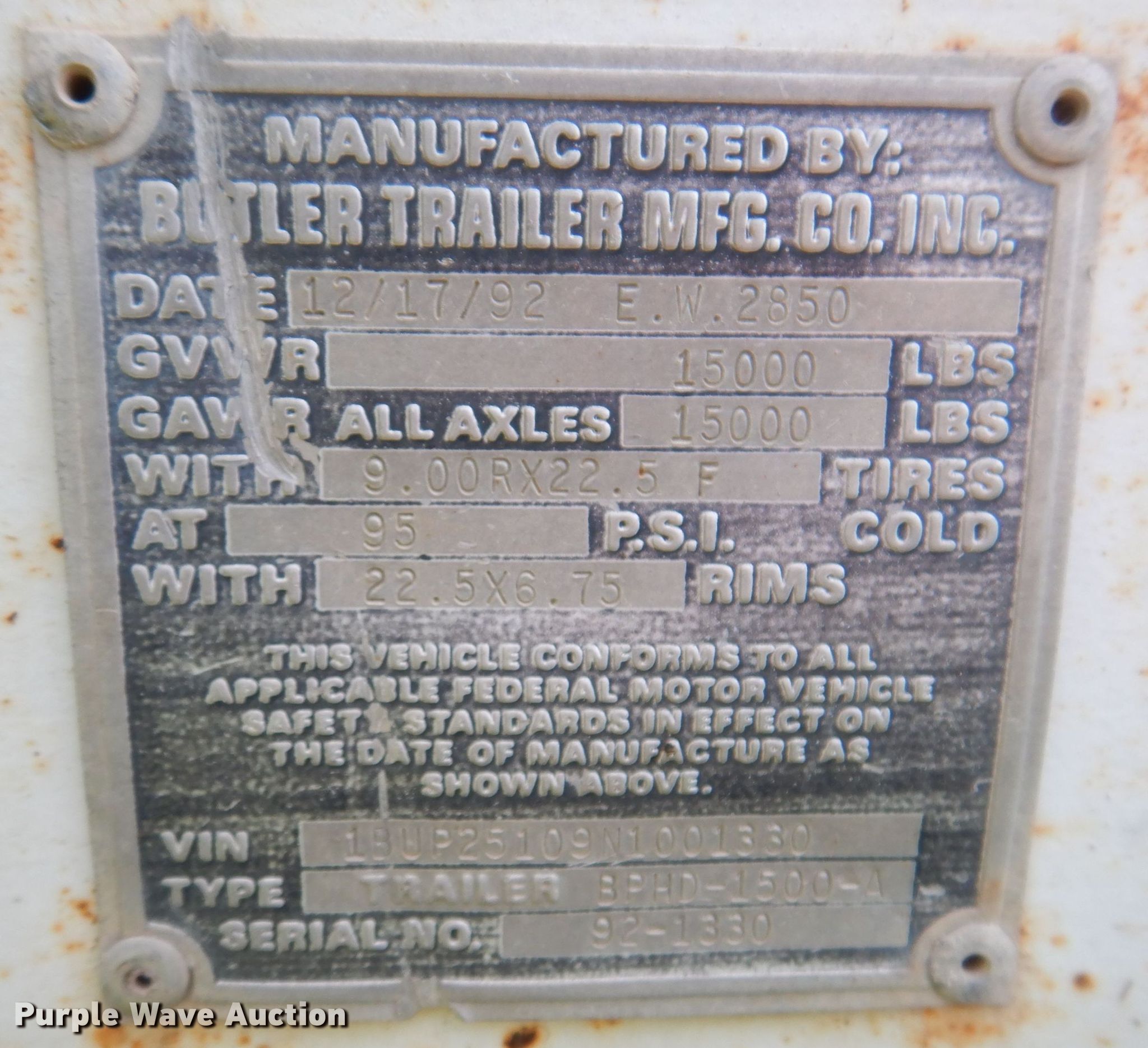 1992 Butler EW2850 pole trailer. VIN: 1BUP25109N1001330. Dimensions Overall: 31' 8" L x 90" W. Chassis Hitch: Pintle, Landing gear: Single, Suspension: Spring, Brakes: Air, GVWR: 15,000 lbs, GAWR: 15,000 lbs. Tires Steel wheels, Size: 9R22.5. Notes Unknown operating condition of brakes. Missouri title. Seller is an Iowa licensed motor vehicle dealer. The buyer may be required to pay sales tax and/or registration fees to the dealer prior to taking possession. Buyers may be required to provide identification to the licensed dealer to comply with Iowa state laws. Title will be assigned and distributed by the dealer. Please contact the seller for distribution questions. Hawkeye Motors. 1916 Dean Ave. Des Moines, IA 50316