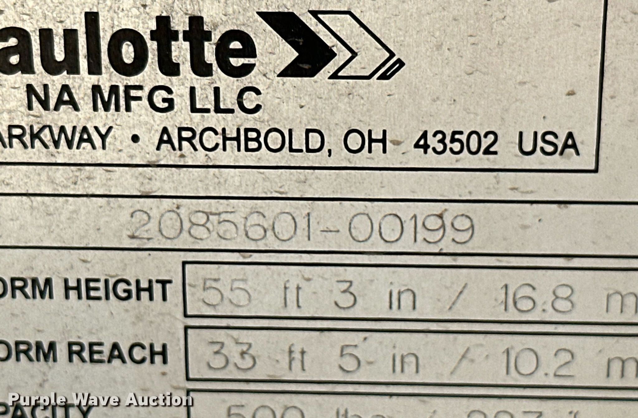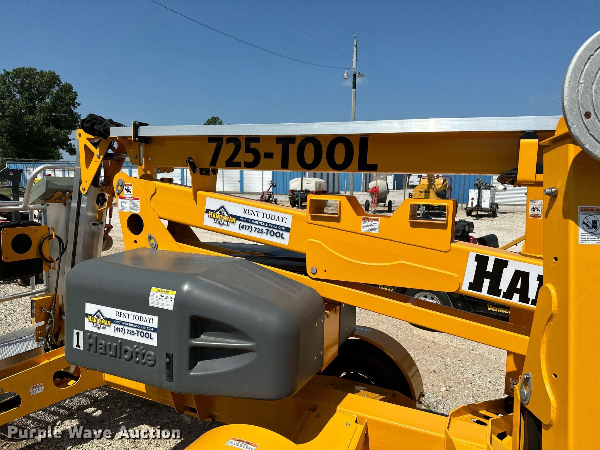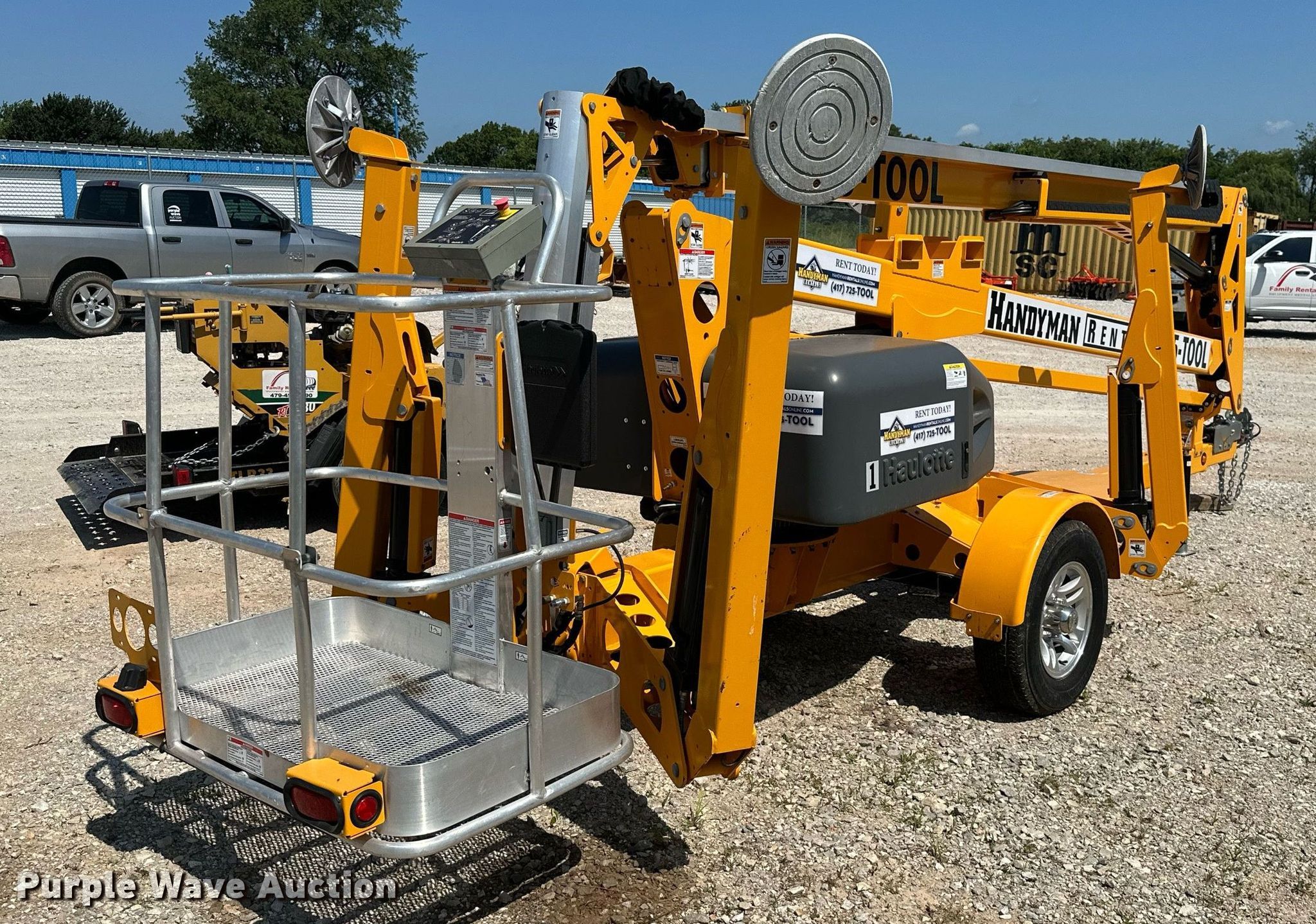 2020 Haulotte 5533A boom lift. Hours: 456 on meter, VIN: 5CUAL231XLA000199, Serial: 2085601-00199. Electric Motor Volts: 24. Features Tow behind, Maximum lift capacity: 500 lbs, Maximum reach length: 33' 5", Maximum lift height: 55' 3", Hydraulic outriggers, Hydraulic extendable jib, Hydraulic leveling, Platform: 26" L x 46" W, Controls: Platform, Ground, Safety alarm. Tires Tire size: ST225/75R15. Family Rentals. 1978 Slack Street. Pea Ridge, AR 72751